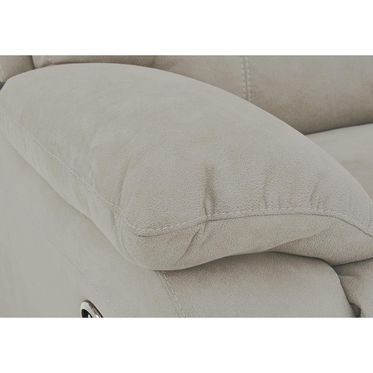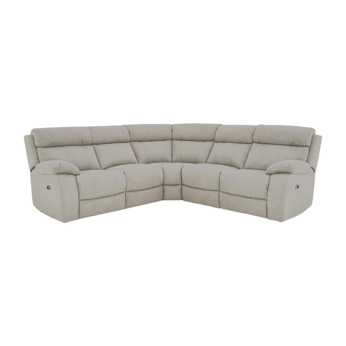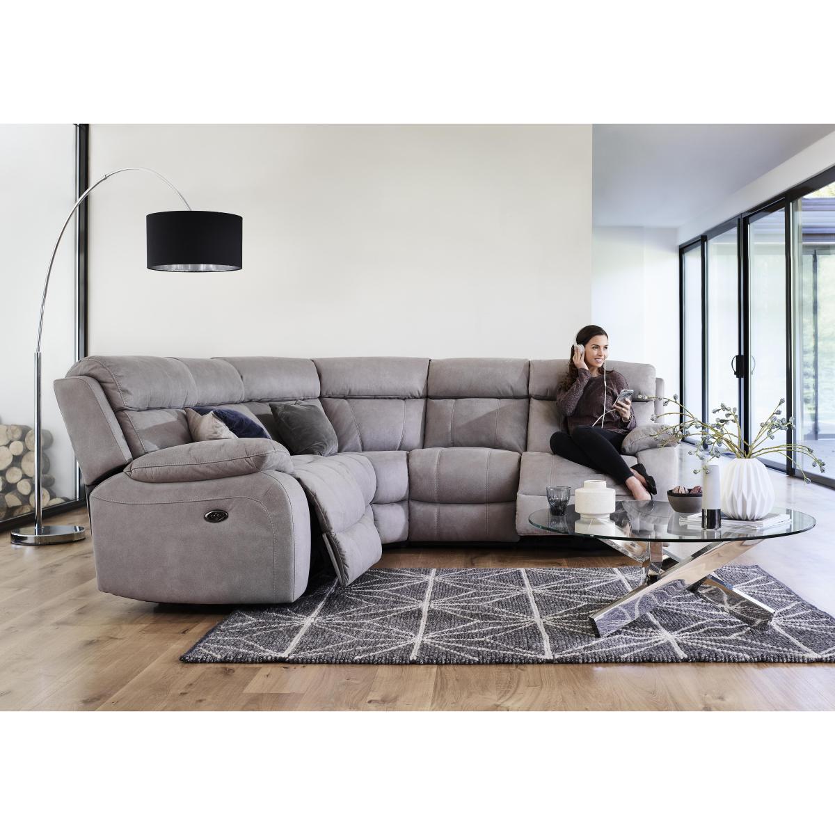 Great style is now available at a fantastic price with the stylishly modern Moreno. This amazingly comfortable, luxurious range is upholstered in either 100% premium leather or soft to the touch woven fabric. Stitched back detailing ensures the lumbar comfort sits perfectly at the base of your back. You also have the choice of space saving 'wall away' manual reclining actions or power reclining at the push of a button. Enjoy the support and comfort of higher density foam interiors, no-sag spring suspension and stronger frames. Relax in comfort on the Moreno corner fabric recliner sofa, beautifully made for relaxation. This fantastic value large corner sofa has a strong frame, high sprung backs with fibre-filled back cushions, premium lumbar support and padded headrests, luxury fibre-filled arm cushions, and higher density foam with fibre seat cushions resting on no-sag springs. It has two power reclinerswith built in USB ports. So you can put your feet up and re-charge with ease. The fabulous Moreno corner fabric recliner sofa’s upholstery is soft to the touch woven fabric, with lovely feature stitching. Part of the Moreno collection with stronger frames, higher density foam cushioning and no-sag springs. Top Tip. To keep your fabric sofa or chair looking good, plump the seat and back cushions and any scatter cushions regularly, and – where possible – turn and rotate to ensure even wear. Plumping and rotation is important as interiors settle over time, and some fabrics can show wear on areas of more use or in direct sunlight. Using a soft brush or vacuuming with the curtain attachment weekly prolongs the life of fabric upholstery. Ideally clean professionally annually. If your sofa or chair is a recliner model, please allow time for the recliner to settle. Minor gaps are necessary for ease of motion, and vary depending on floor type. Manual recliners can feel a little stiff at first, but the motion eases with use.