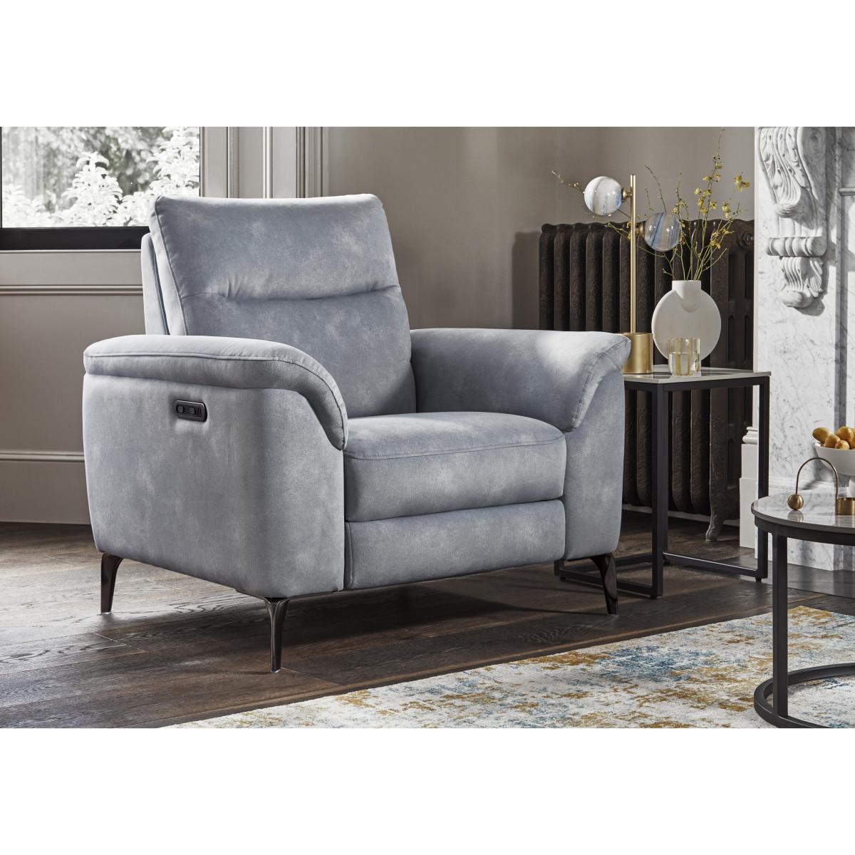 Meet Morgan, where style and comfort meet value – and all in a usefully compact design that’s perfect for smaller homes and apartment living. Channelling a mid-century design aesthetic, this thoughtfully curated range of handcrafted sofas, chaise end sofas and armchairs offers a slew of comfort features, including optional power recliners, pocket sprung seats and superb cushioning. And pieces look every bit as good as they feel. Choose 100% leather or high-quality fabric upholstery in a range of on-trend colours picked to coordinate beautifully with the modern metallic legs. Designed to fit and priced to please, the Morgan range is only available at Furniture Village. It may fall into our compact category, but our Morgan armchair still has mid-century style and pocket sprung comfort in abundance. You can even add a power recliner. Why you'll love it This fabric armchair brings style and comfort to a compact living space. On-trend mid-century design at a great-value price. Built for real comfort with a pocket sprung seat and cushioned arms. Also available with a power recliner that eases you to your perfect relaxed position. Power model has built-in USB device charging. High-quality fabric upholstery in a wide choice of contemporary colours. Make it even more luxurious with soft 100% leather upholstery. Modern metallic tapered legs. Handmade exclusively for Furniture Village. This fabric armchair is part of the Morgan range. What you need to know Medium comfort level. Seat suspension: sinuous spring. Seat cushioning: pocket spring, foam and fibre. Cushioning is fixed. Back suspension: webbing. Back cushioning: fibre. Cushioning is fixed. Arm cushioning: foam and Dacron. Feet are removable. Please allow time for the recliner mechanism to ease. Minor gaps are necessary to ensure ease of motion and may be exaggerated depending on floor type. Fixed seat and back cushions require smoothing and straightening regularly. To smooth and straighten fixed cushions, punch the back cushion’s top two corners and the seat cushion’s outer two corners, and pinch outwards. Flattening and shading of heavy wear areas on pile fabrics is unavoidable. Clean regularly using a soft brush or vacuum with the curtain attachment. Deal with any spills promptly. Professional cleaning advised for oil- and grease-based stains. Please read our upholstery care guide for more advice. Item code: MORGCHR-FAB-001