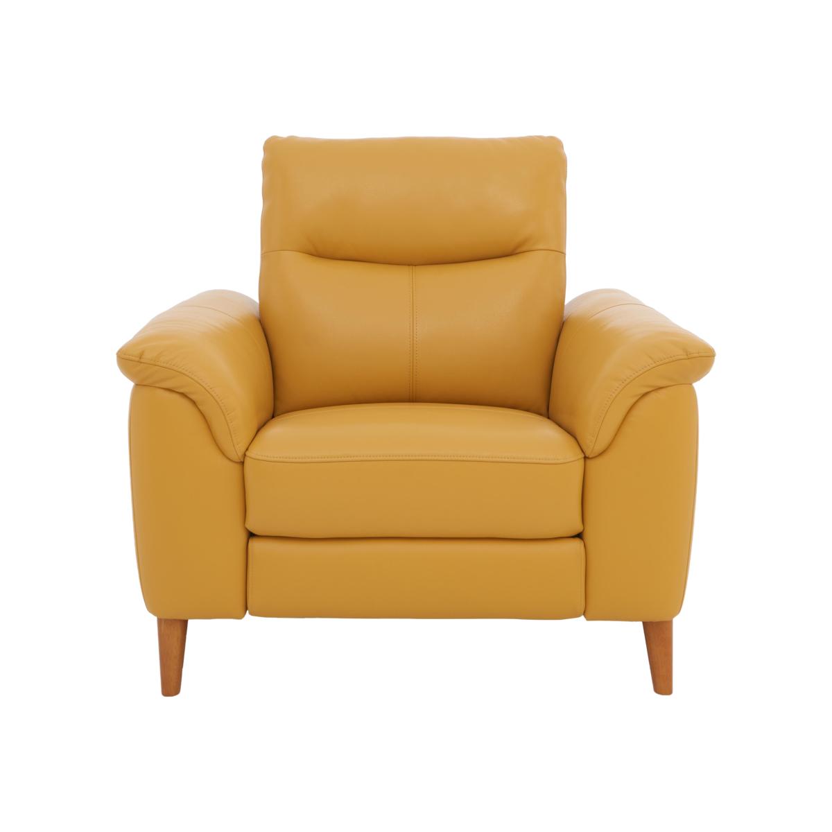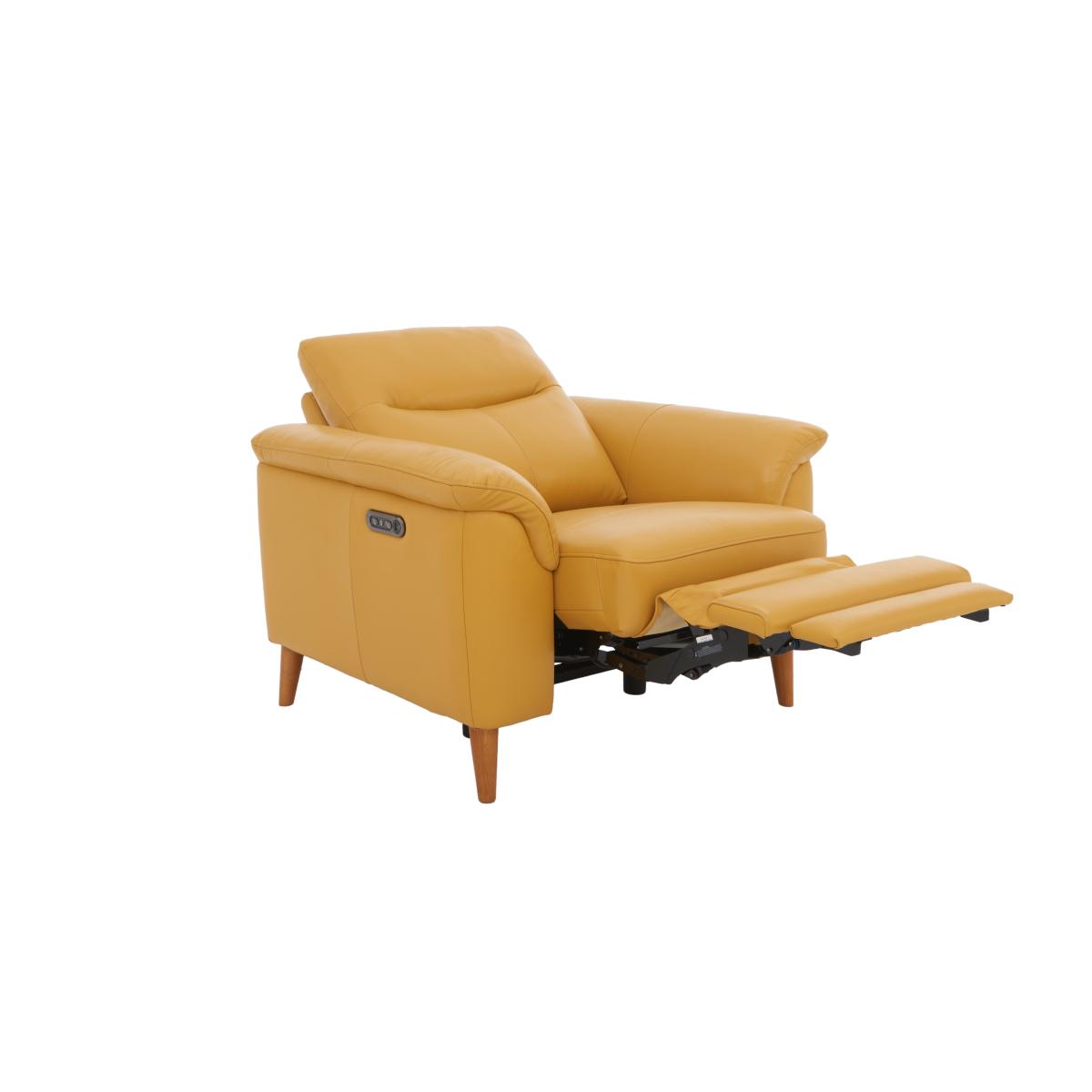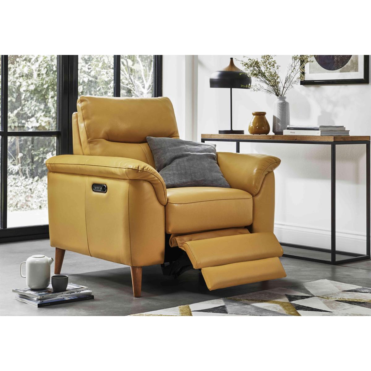 Meet Morgan, where style and comfort meet value – and all in a usefully compact design that’s perfect for smaller homes and apartment living. Channelling a mid-century design aesthetic, this thoughtfully-curated range of handcrafted sofas, chaise end sofas and armchairs offers a slew of comfort features including optional power recliners, pocket sprung seats and superb cushioning. And pieces look every bit as good as they feel. Choose 100% leather or high-quality fabric upholstery in a range of on-trend colours picked to coordinate beautifully with the polished walnut legs. Designed to fit and priced to please, the Morgan range is only available at Furniture Village. Looking for an armchair that you can call your own? Get dibs on this great-value leather power recliner chair, part of our Morgan range. Cool, comfy and ideal for more compact spaces. Why you'll love it. You’ll love coming home to this leather power recliner armchair. Compact mid-century design at a great-value price. Built for real comfort with pocket sprung seat and cushioned arms. Smooth power recliner eases you to your perfect relaxed position. Soft 100% leather upholstery in a choice of colours. Tapered legs in polished walnut. Also available without the recliner. Handmade exclusively for Furniture Village. This leather power recliner armchair is part of the Morgan range. What you need to know. Medium comfort level. Seat suspension: sinuous spring. Seat cushion is fixed. Seat cushioning: pocket spring, foam and fibre. Back suspension: webbing. Back cushioning: fibre. Back cushion is fixed. Feet are removable. Please allow time for the recliner mechanism to ease. Minor gaps are necessary to ensure ease of motion and may be exaggerated depending on floor type. Leather has unique marks and characteristics with variance in colour and texture. Leather softens with use. Smoothing the tops of leather cushions prevents signs of visual comfort. Fixed seat and back cushions require smoothing and straightening regularly. To smooth and straighten fixed cushions, punch the back cushion’s top two corners and the seat cushion’s outer two corners, and pinch outwards. Please read our upholstery care guide for more advice.