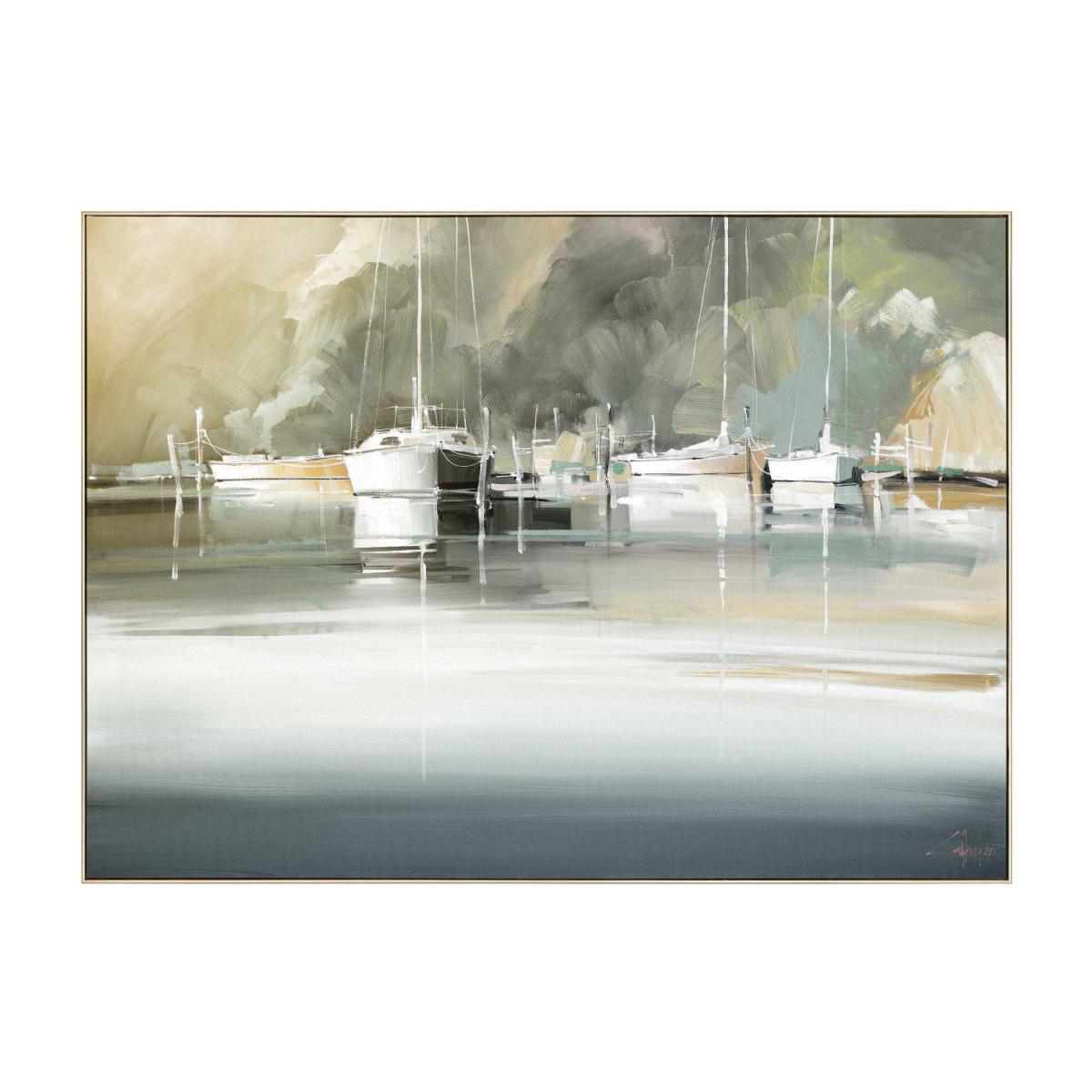 I love this piece for its soothing colour palette and atmospheric brushwork, which makes it versatile enough to complement both modern and traditional interiors. It’s particularly effective in minimalist or maritime-inspired spaces, where it can serve as a focal point that adds a sense of calm and elegance. Practical styling tips include pairing it with neutral accessories and soft textiles to enhance its tranquil vibe, or layering it with other subtle nautical accents for a cohesive look. Hanging it at eye level in a living room or dining area can help create a relaxed, inviting atmosphere, making it a great choice for adding depth and interest without overwhelming the space.