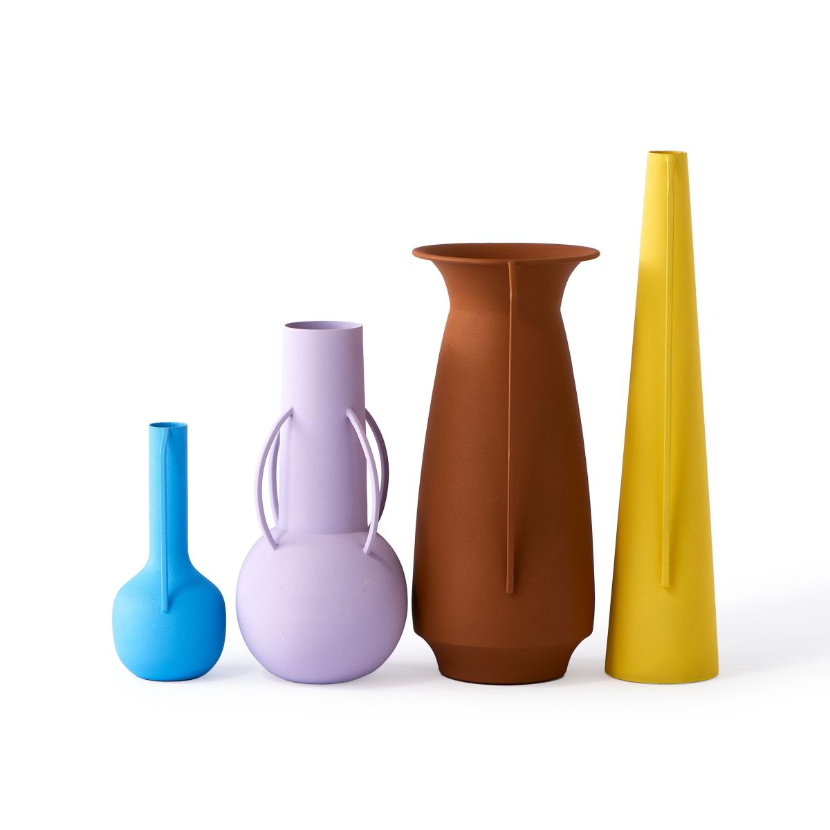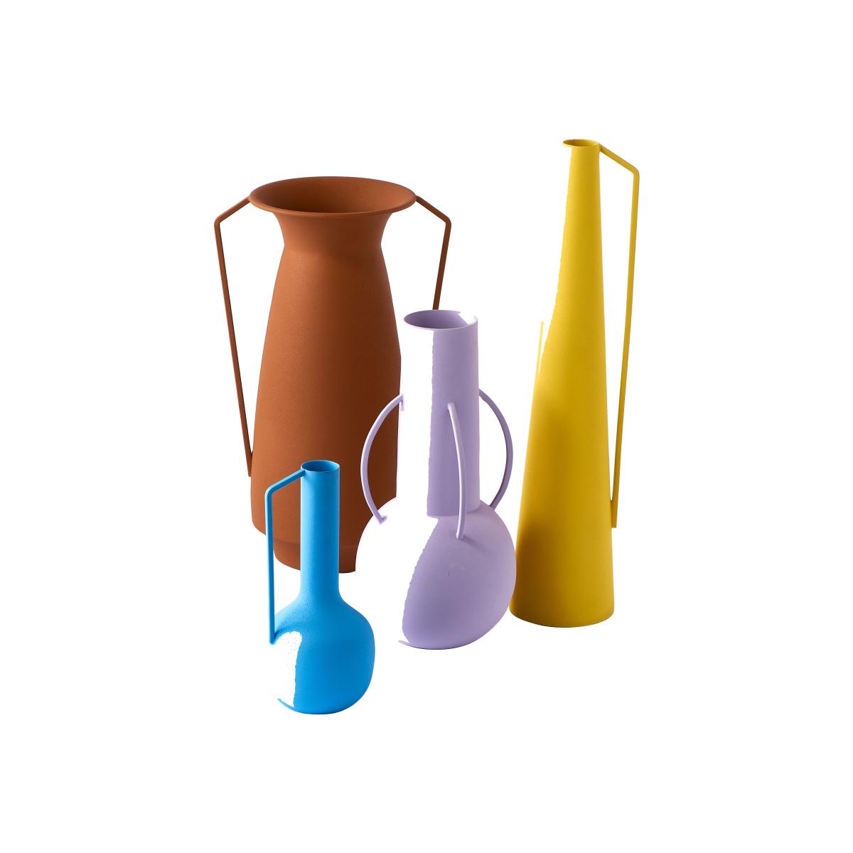 This set consists of four metal vases which present a fine harmony of shapes borrowed from the past and modern colours. The different items come together to create a cheerful, colourful set that mixes styles and eras. A bridge between past and present, these vases decorated with handles offer a contemporary reinterpretation of ancient amphorae. The archetypal form has been refined: the design is very graphic, the silhouette and volume perfectly balanced. The essential lines highlight the matt, velvety, soft, tactile finish. The modern colours contrast in a surprising way with these archetypal silhouettes plucked from the past. You’ll love the hybrid style of these vases, both elegant and subtly eccentric. Roman vases display a neo-rustic style that perfectly meets our needs for authenticity and going back to basics. PLEASE NOTE. Vases for decorative use only: do not fill with water.