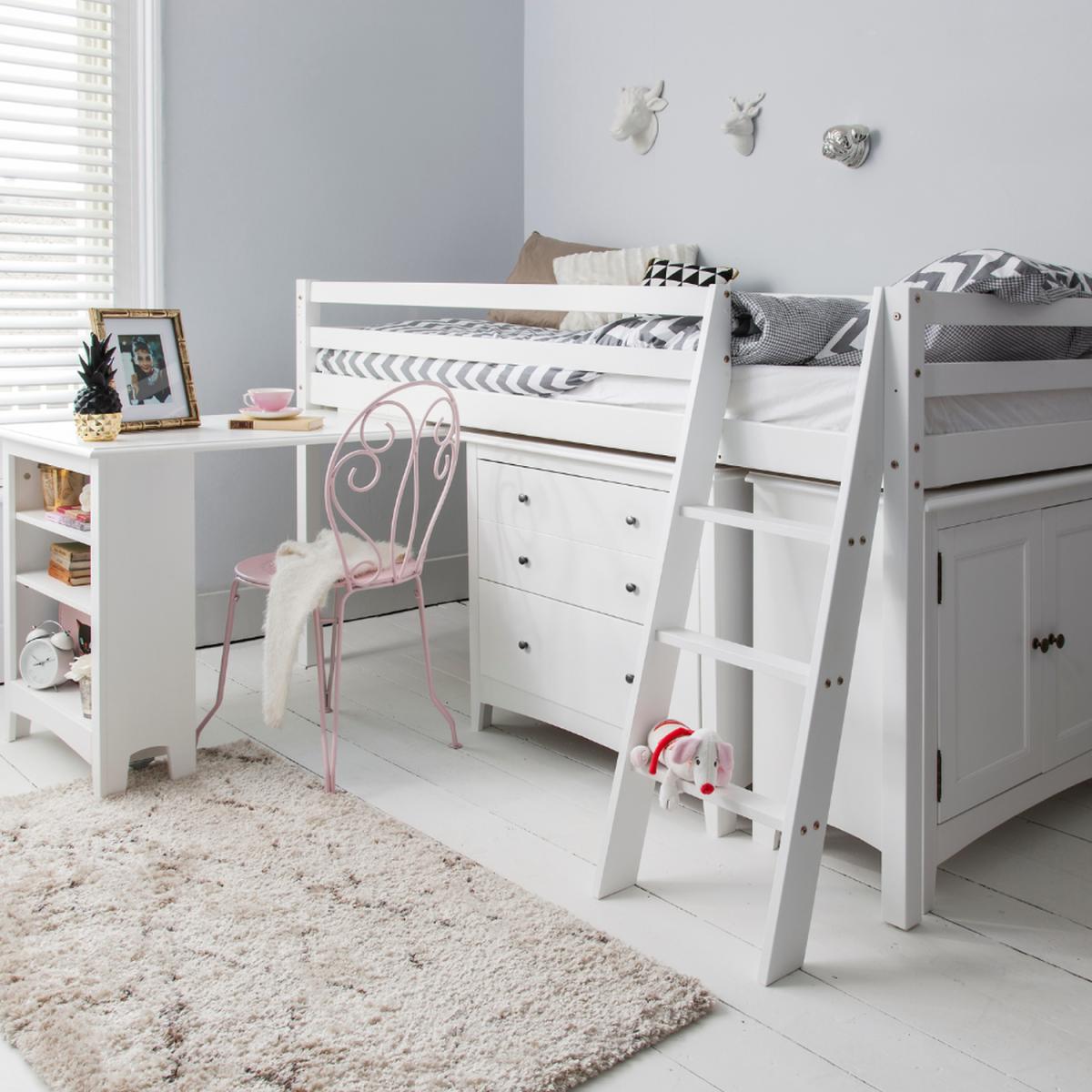 The innovative sleep station in white is a truly multifaceted bed. Not only is it a playful space to sleep in, thanks to an exciting ladder feature, but it's also highly functional with a variety of storage units below. Making excellent use of the space underneath the bed, the design comes fully loaded with a pull-out desk, cupboard, and chest of drawers! From clothing storage to toy organization, this innovative bed is a handy space-saver for small bedrooms, leaving more room for playing, running around, and general fun! Overall: Length 202cm x Depth 101cm x Height 114cm Cabinet: Length 45cm x 86cm Depth x Height 73.5cm Drawers: Length 45cm x 86cm Depth x Height 73.5cm Desk: Length 45cm x Depth 58cm x Height 73.5cm Ladder Extends: Approximately 33cm