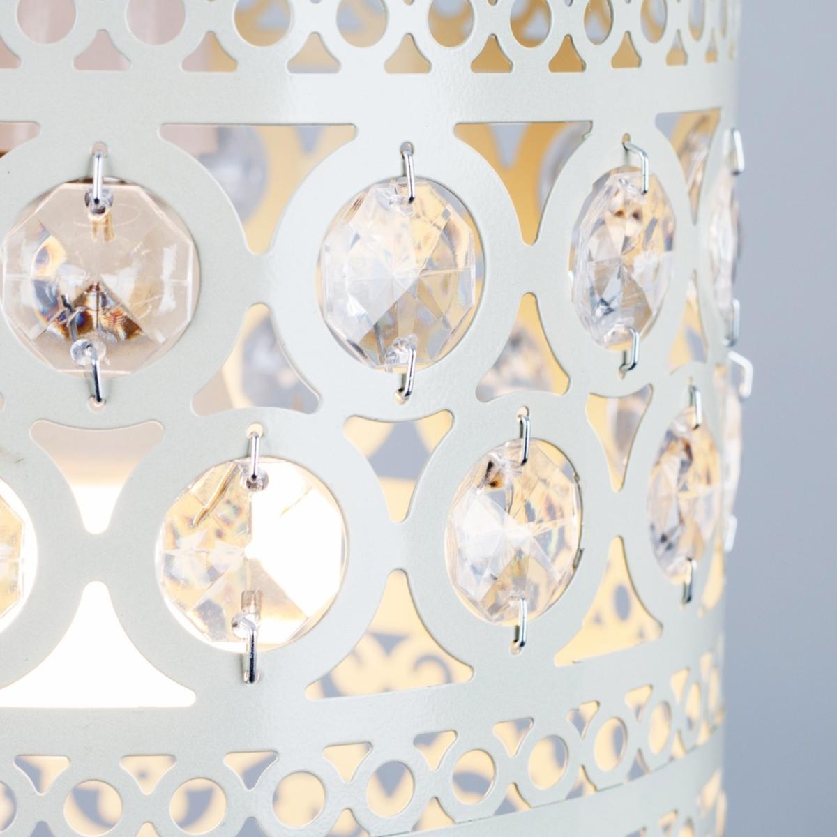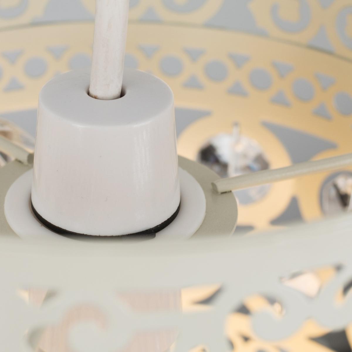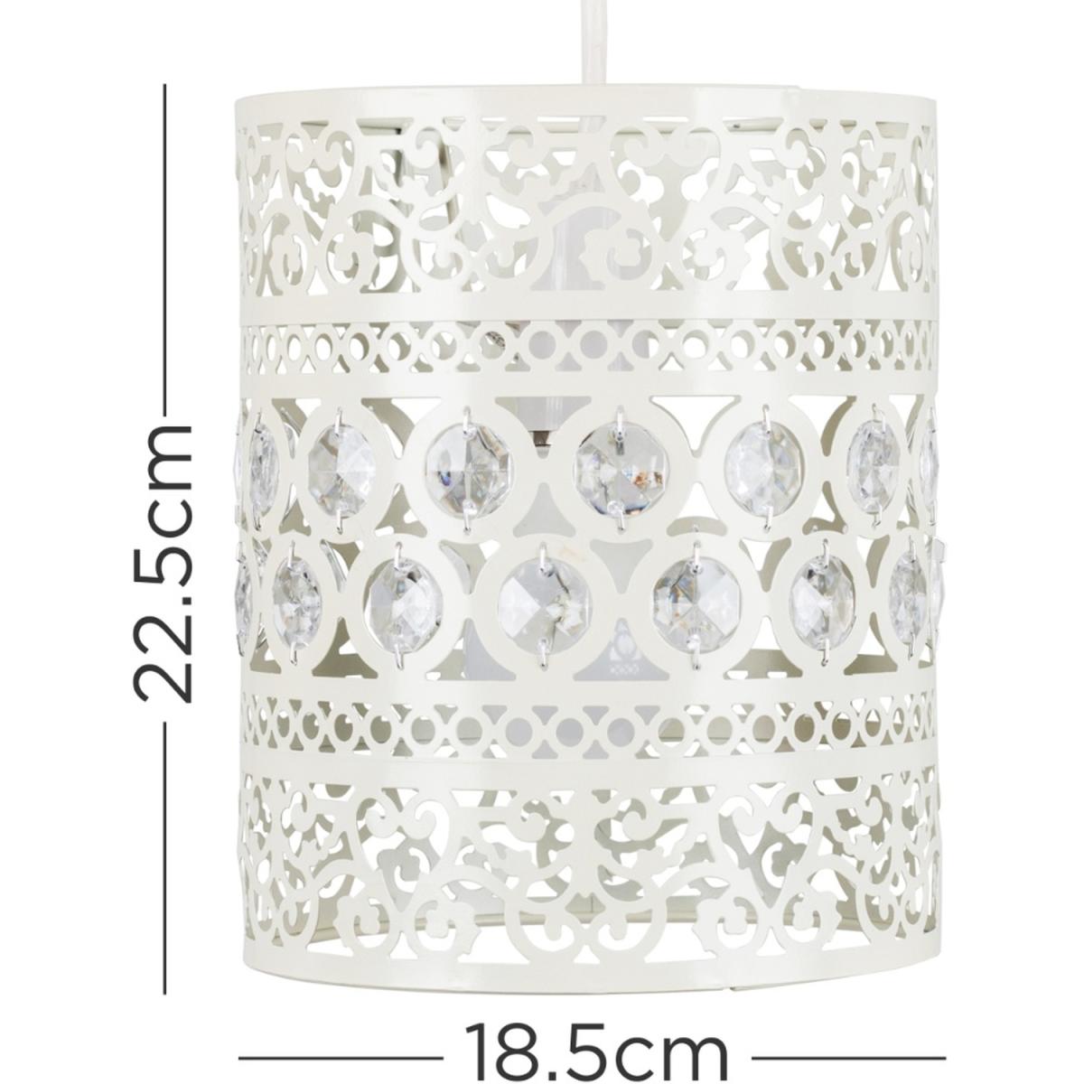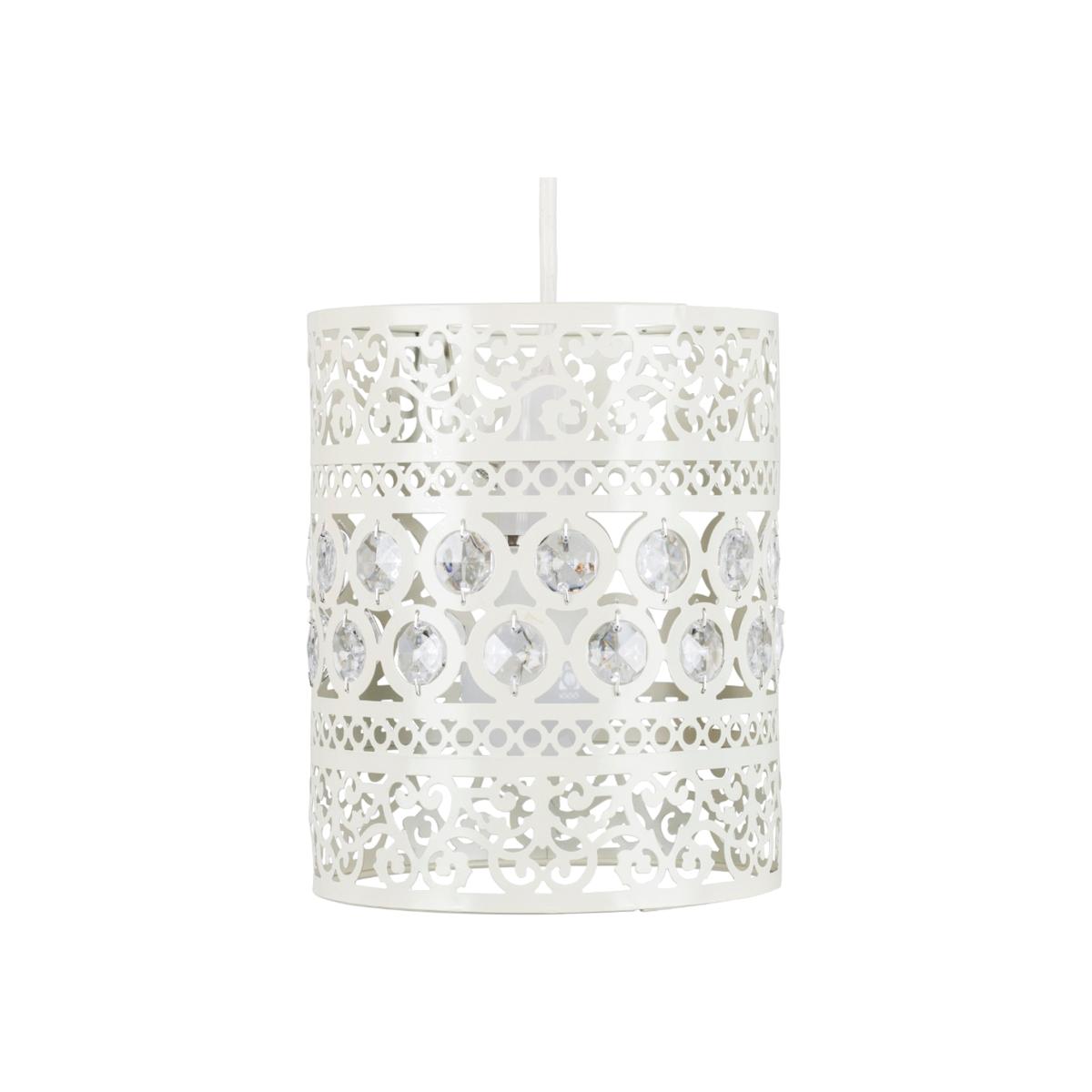 Modern ornate metal drum non electric ceiling pendant light shade, in a shabby chic off whitecream finish with clear crystal detailing. Easily fits to your standard ceiling light socket - no wiring required. A non electric ceiling pendant shade is a quick and economical way to update your room in seconds! Easy to fit to your existing lamp holder no electrician required. Suitable for use with a general domestic or energy saving bulb.