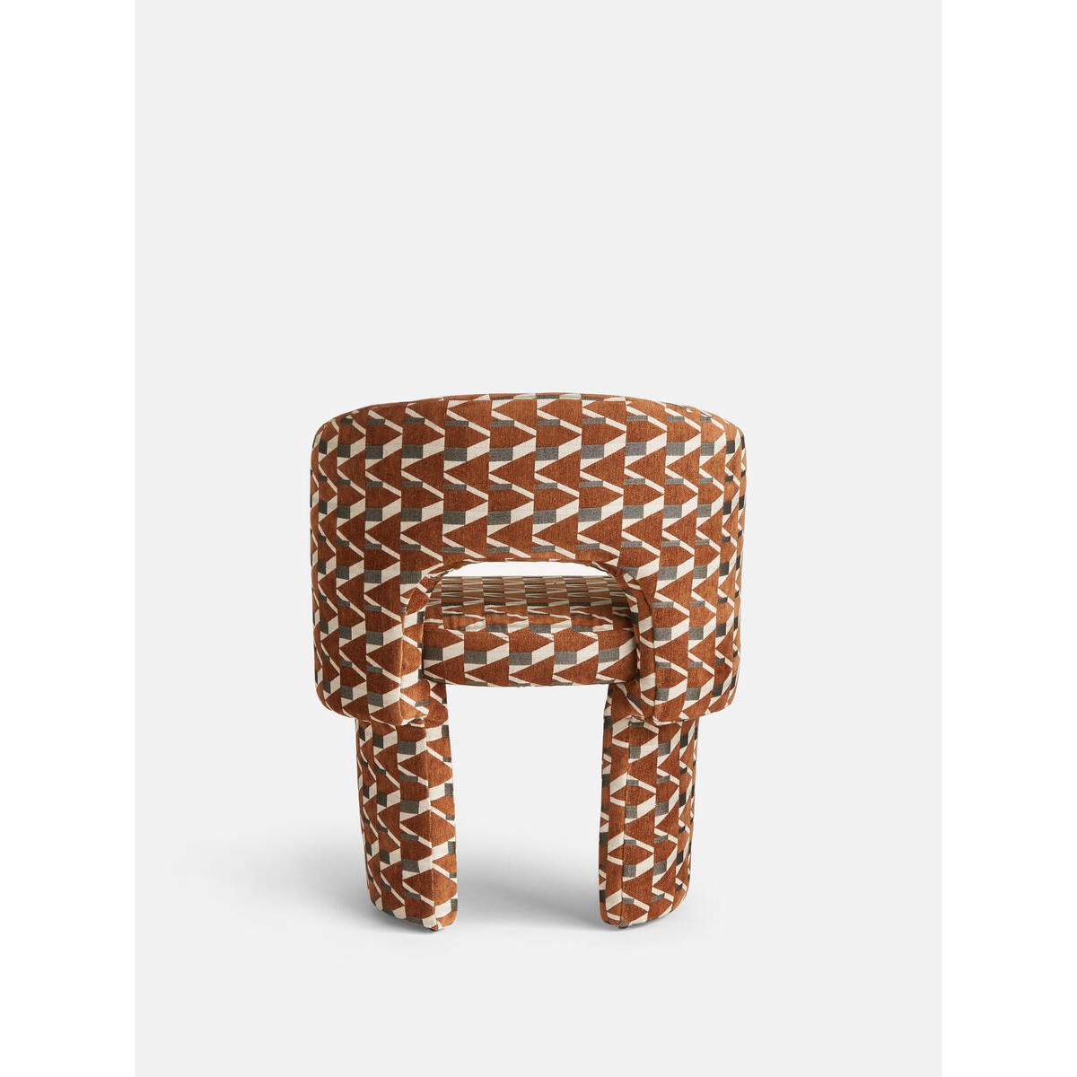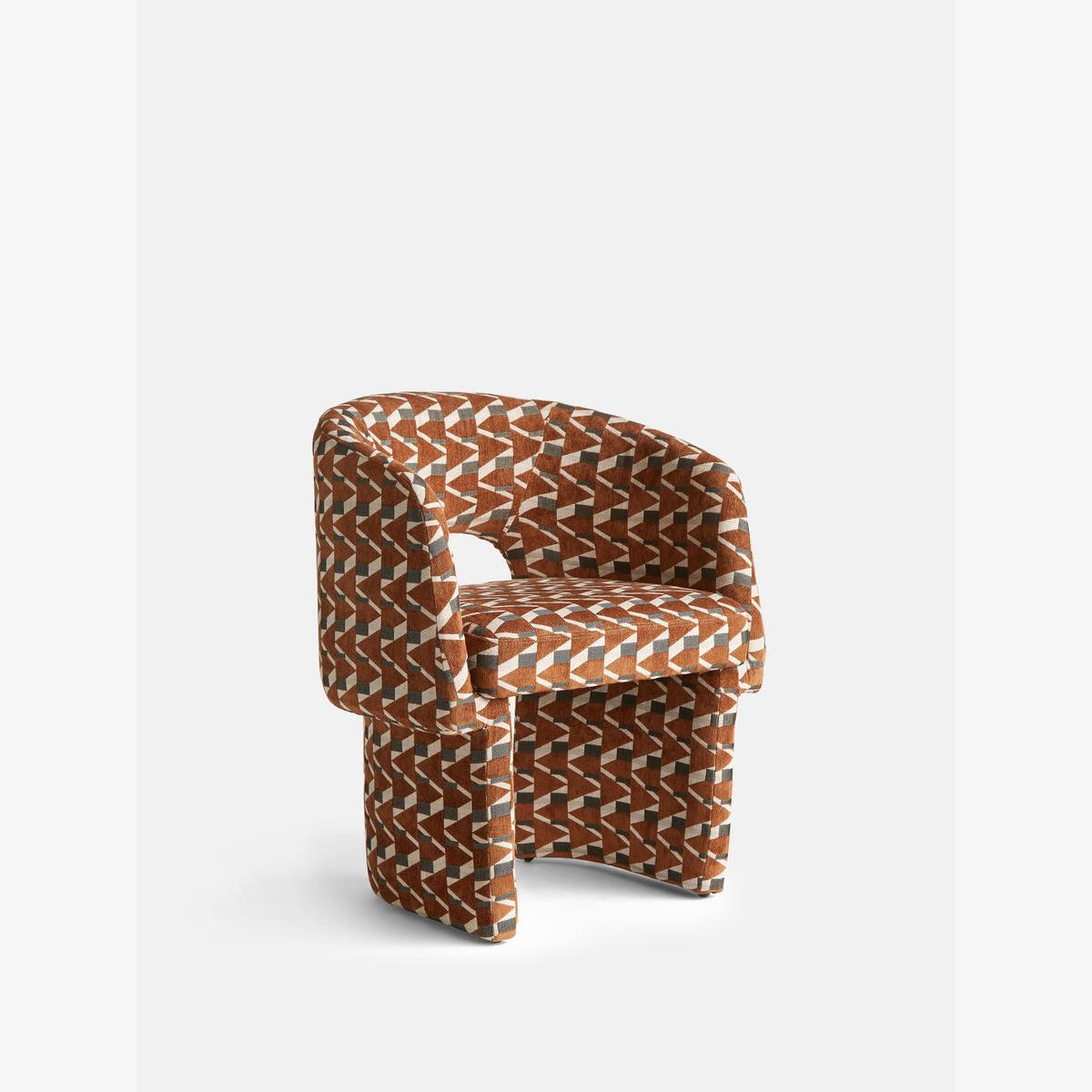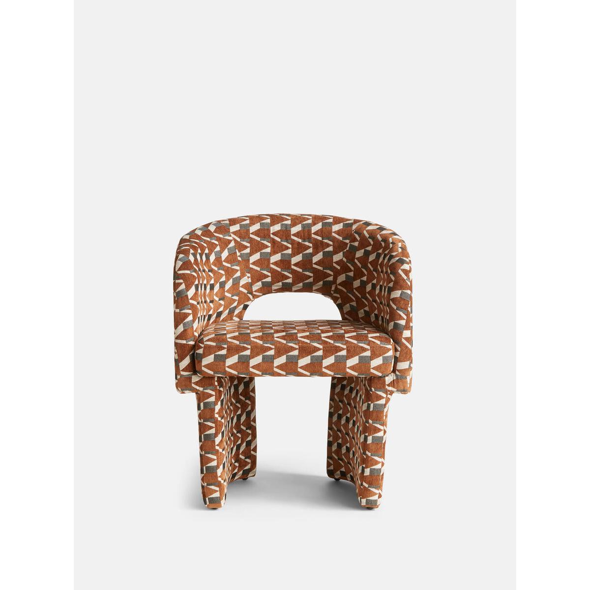 Our Morrell dining chair is upholstered in our Phoebe jacquard, defined by warm tones and an eye-catching geometric. The House-style chair's curved silhouette creates a sculptural effect, while the contemporary cut-out back and angular legs bring a touch of playfulness. This versatile piece works well in any setting, such as a dining room or dressing room. House-style tub chair Cut-out back Upholstered in our Phoebe jacquard pattern, created in-house Inspired by 180 House