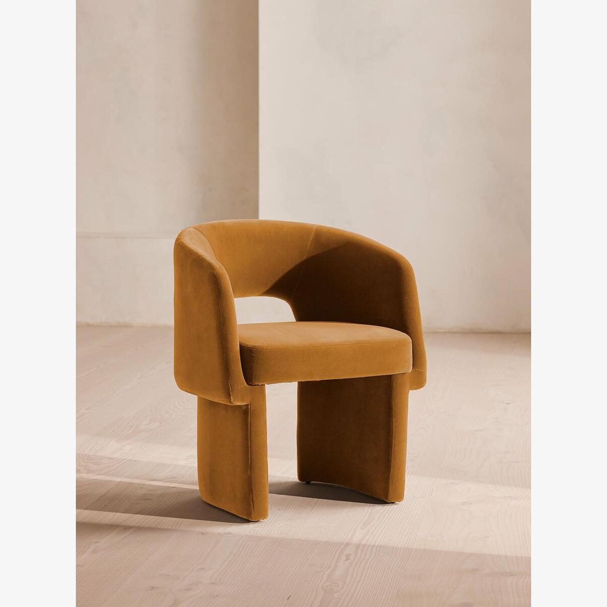 I love this mustard velvet dining chair for its rich colour and tactile finish, which makes it a standout piece without overpowering a room. It works well in both modern and eclectic interiors, adding warmth and a luxe feel to dining spaces, especially combined with natural textures like wood or stone. To style it effectively, consider pairing with a neutral or light-toned table to allow the colour to pop, and accessorise with textured cushions or throws for added depth. Its compact form is also versatile enough to work in smaller dining areas or as accent seating in living spaces, making it a practical yet stylish choice.