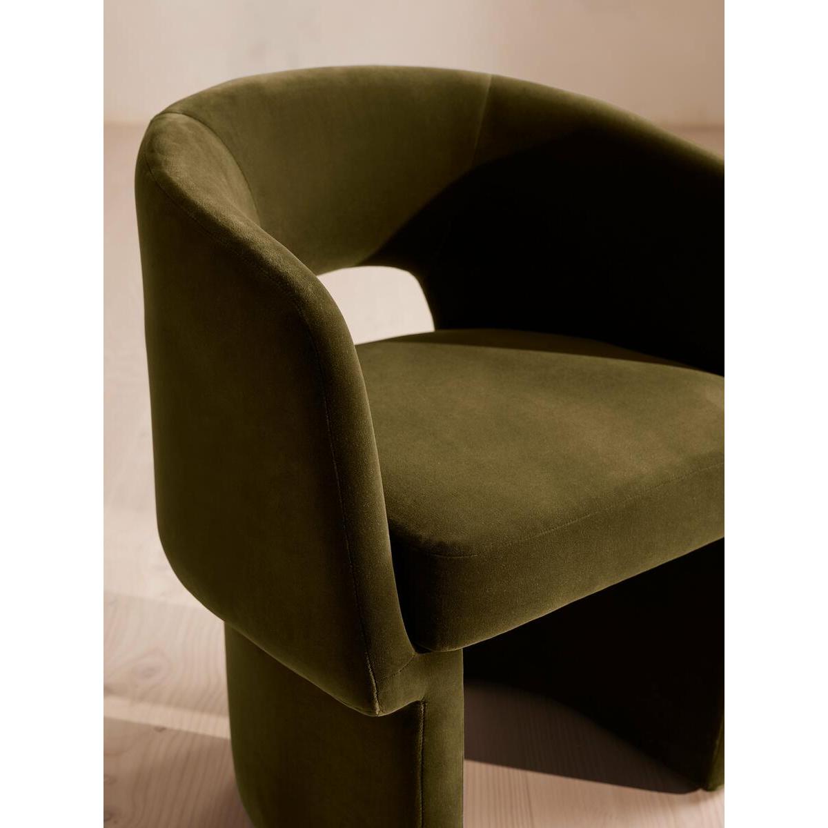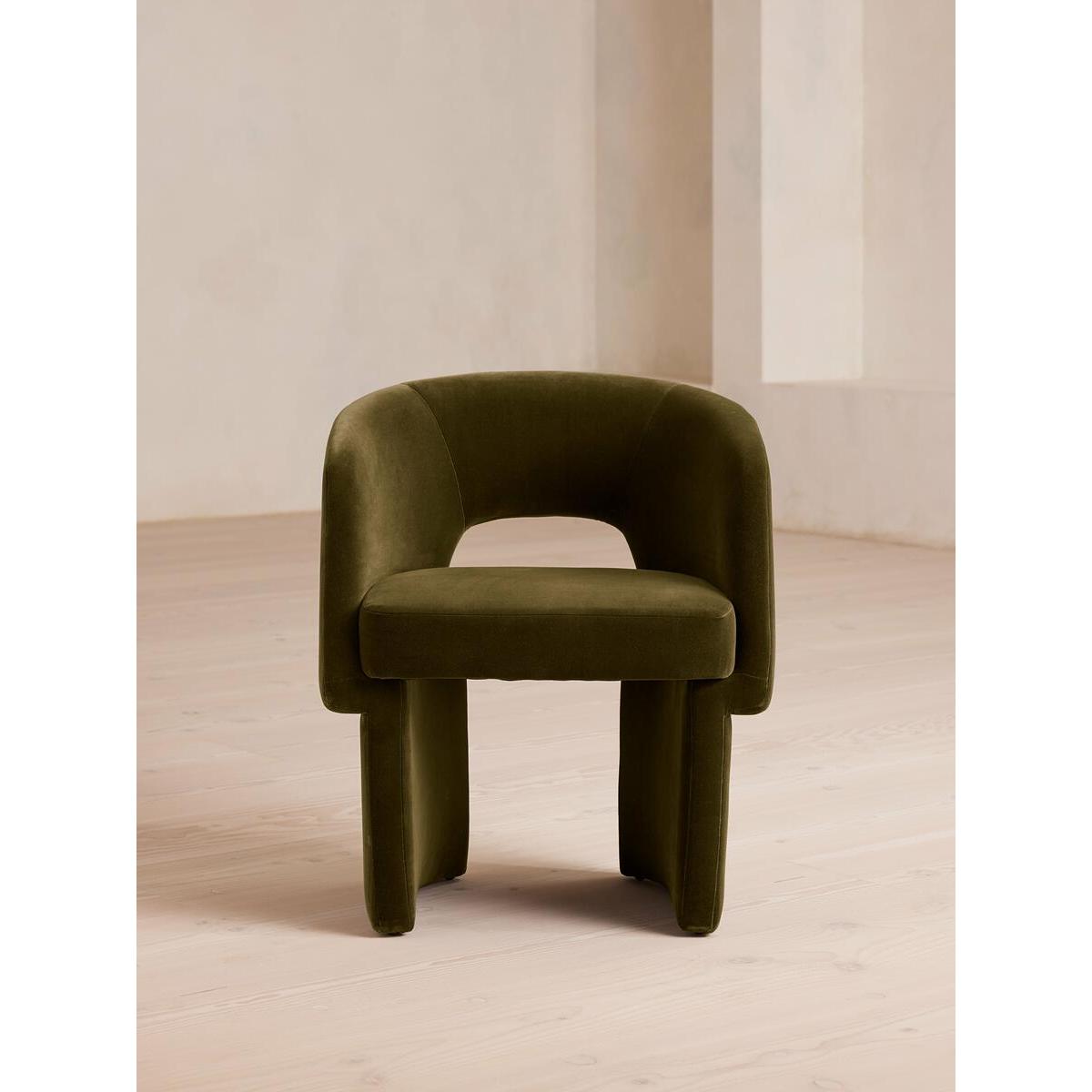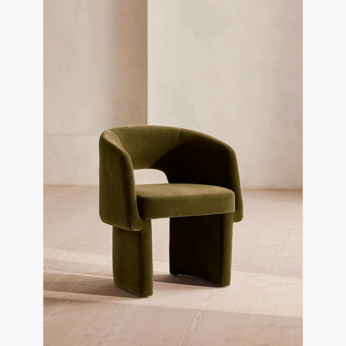 Upholstered in smooth velvet, our Morrell dining chair recalls the rich textures seen in the lounge spaces at 180 House. The chair's tub silhouette provides additional comfort at the table, while the contemporary cut-out back and angular legs bring a touch of playfulness. This versatile piece works well in any setting, such as a dining room or dressing room. House-style tub dining chair Cut-out back Angular legs Fully upholstered in cotton velvet Inspired by 180 House