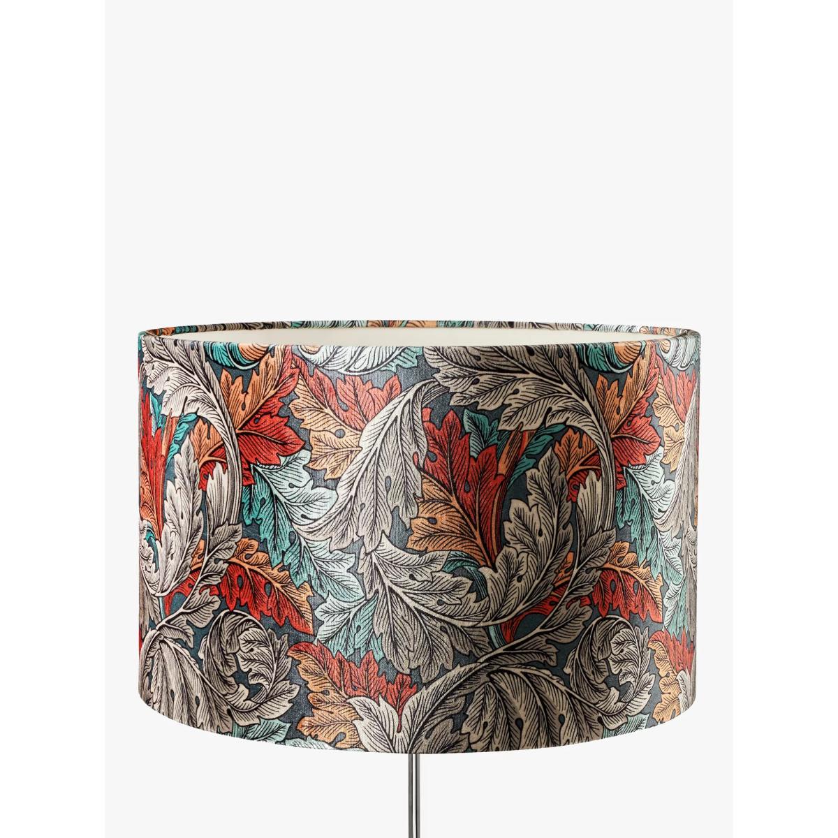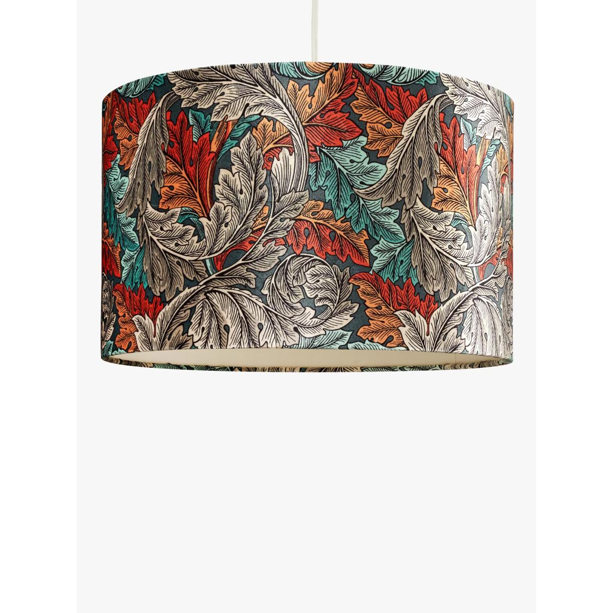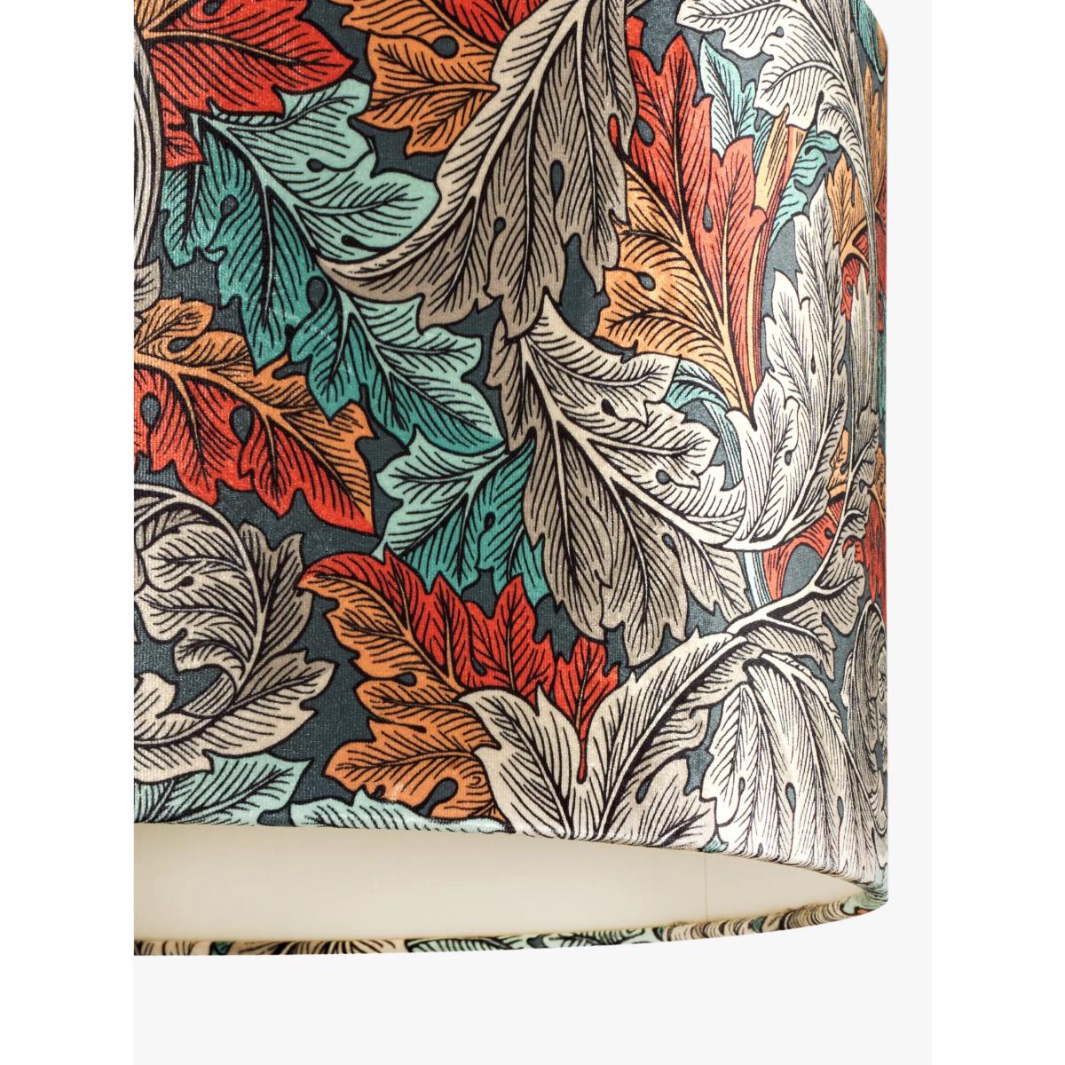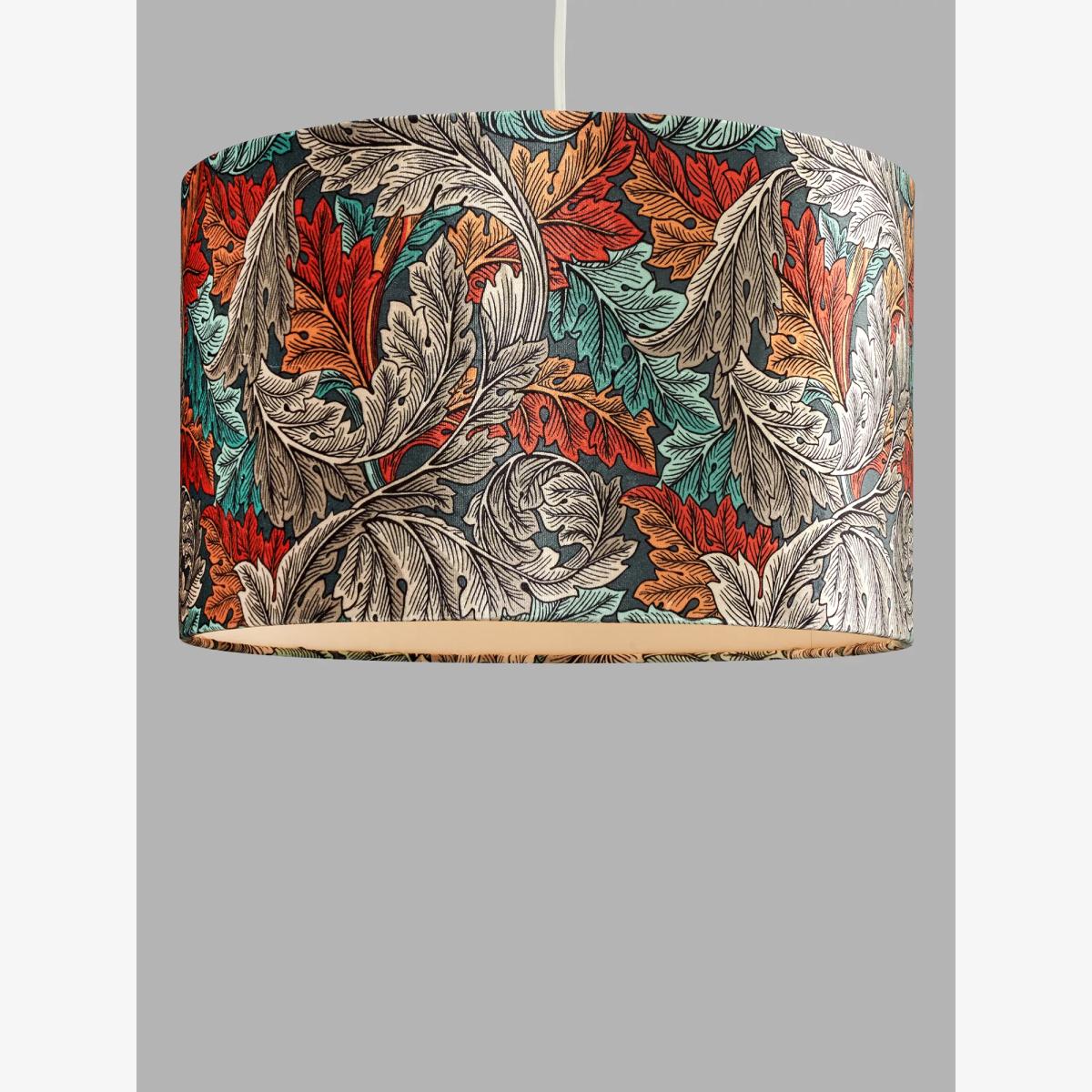 Acanthus (1875) was originally a wallpaper, used to decorate small bedrooms at Wightwick Manor near Wolverhampton. Here, the design has been reproduced in a cotton and linen fabric. Finished in warm colours and lined with a neutral contrasting faux cotton fabric to enhance a warm glow of light. With the addition of a reversible gimbal, this shade is suitable for both ceiling fittings and table lamps.