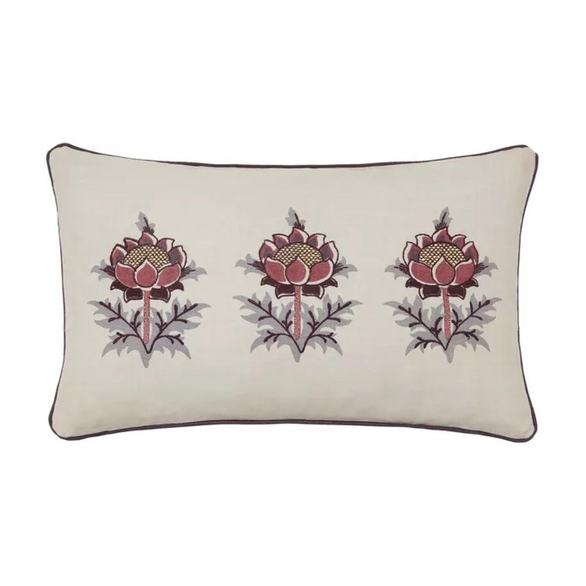Morris & Co Blackthorn Damson Cushion features an elegant pattern of delicate intertwined flowers and trailing leaves in a palette of rich damson tones. Inspiration for the range was taken from wallpaper designed by J.H. Dearle in 1892. This striking accent cushion featuring 3 embroidered floral motifs in complementary autumnal tones. 100& Cotton Filling - Fibre Dimension: 50x30cm Please note: All screens vary in colour reproduction and whilst every effort has been made to display the colour as accurately as possible it is for guidance only.