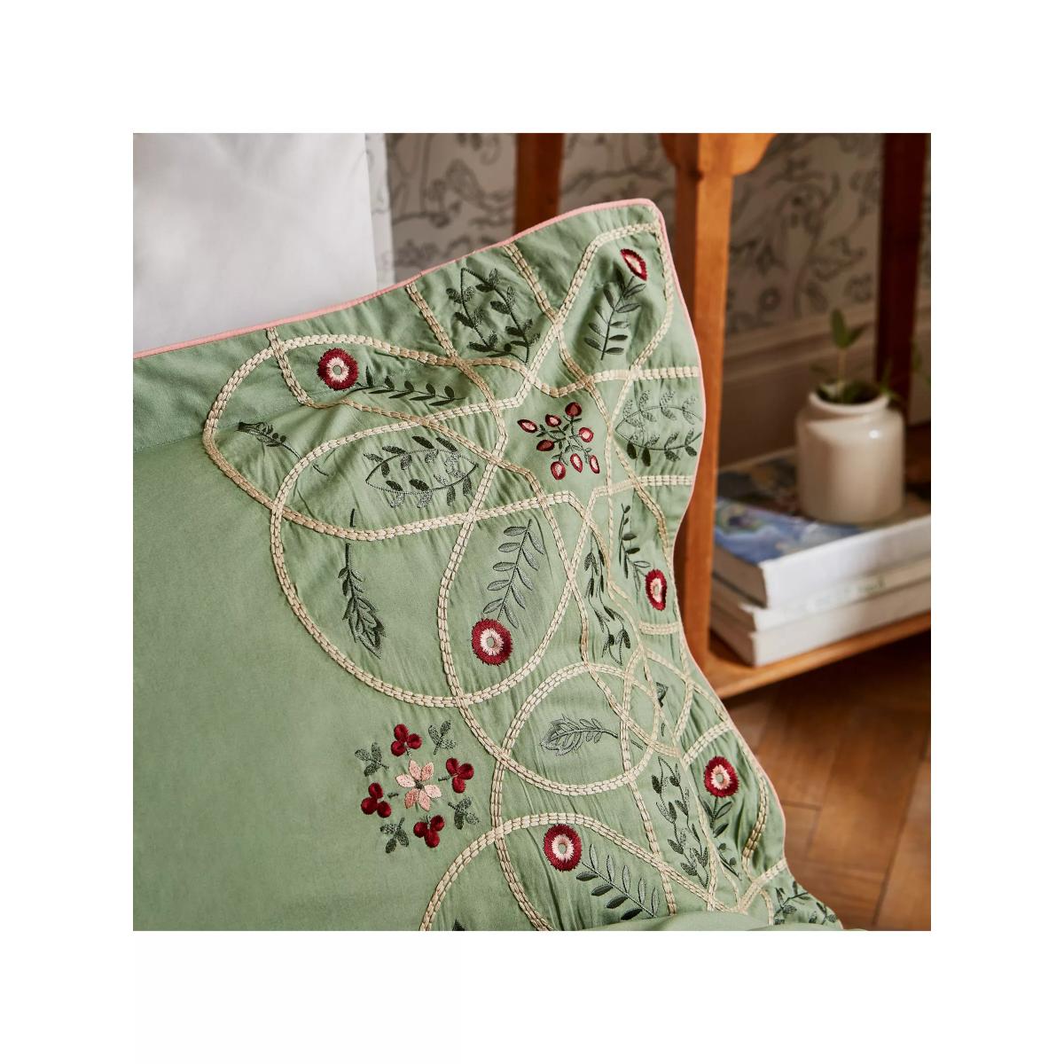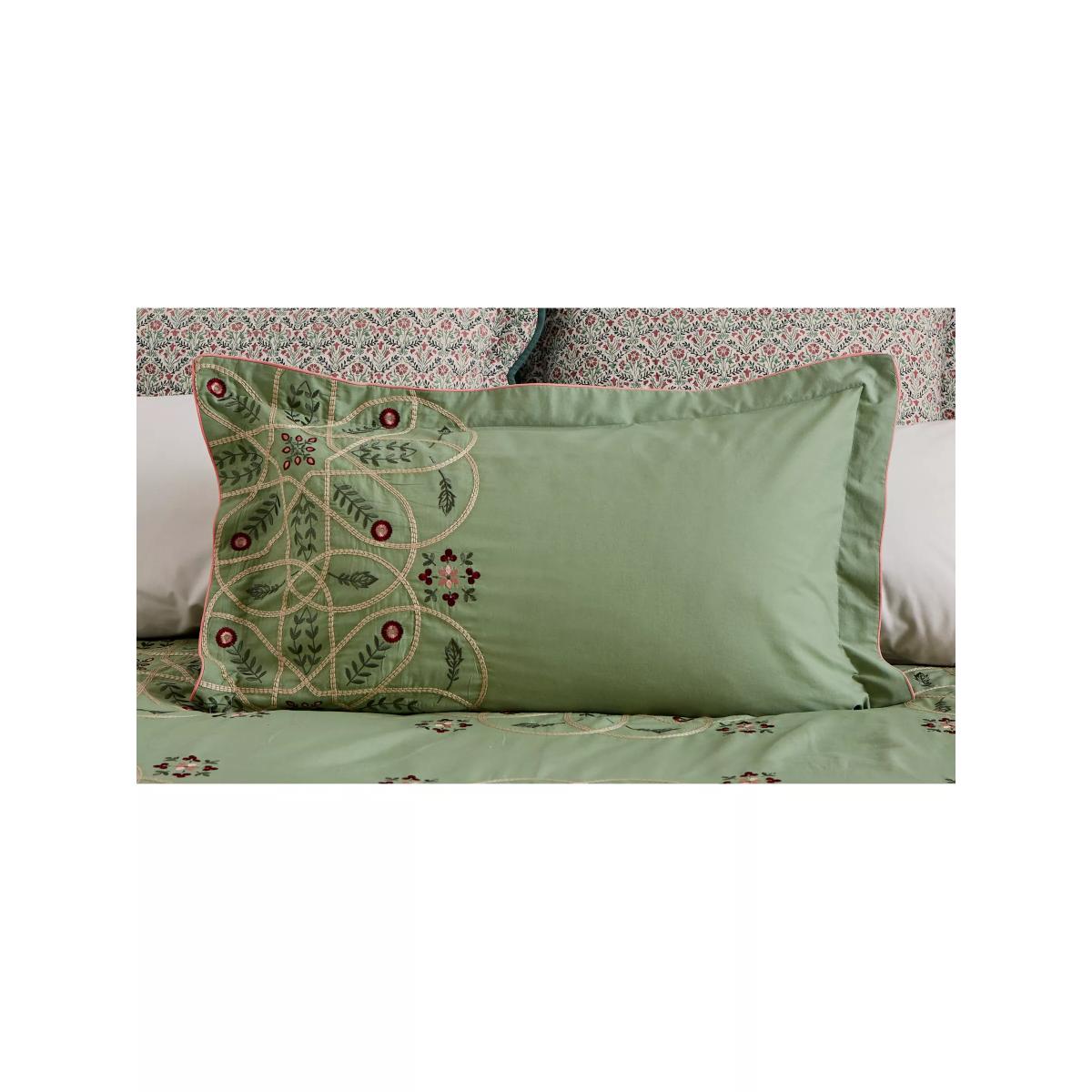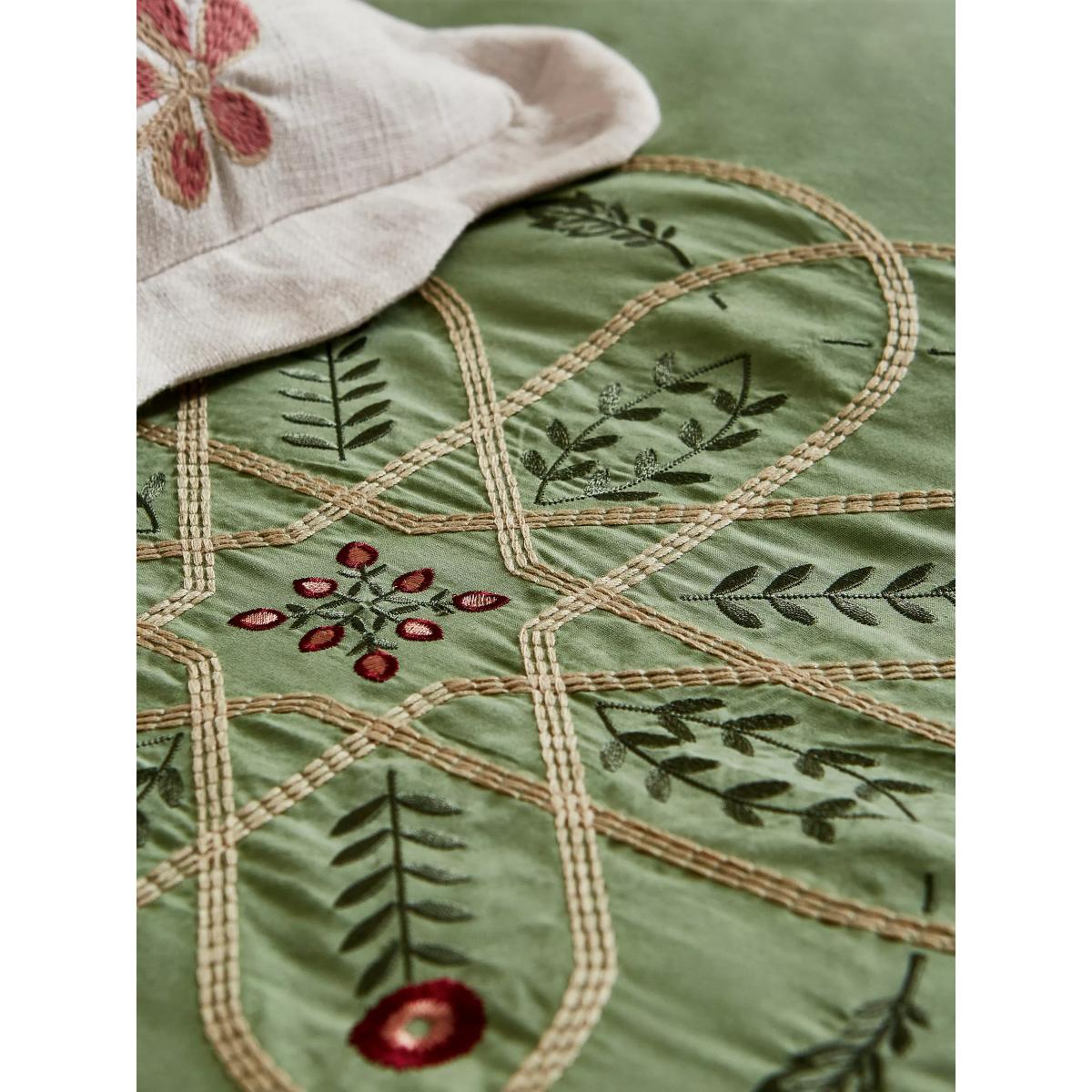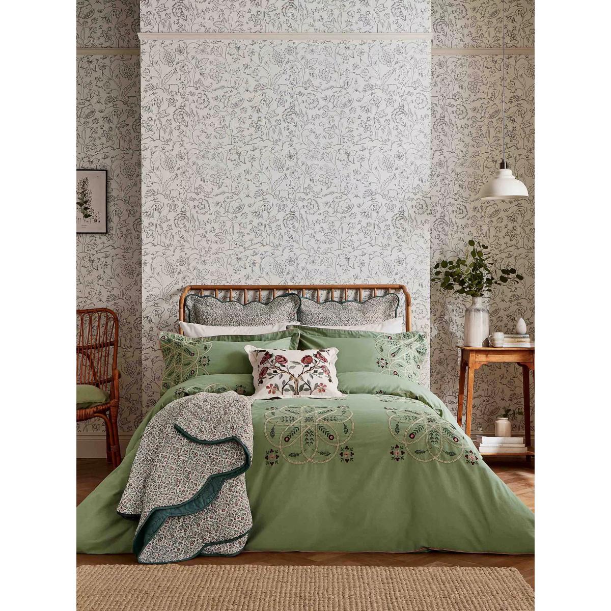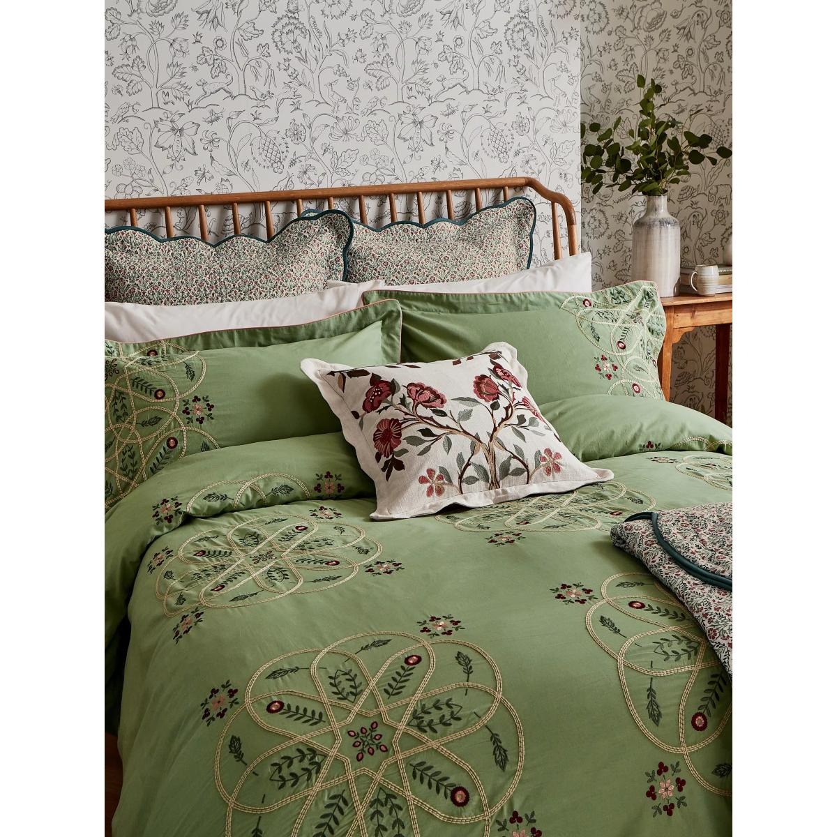 A real compendium of works from Arts & Crafts legends, Brophy Embroidery combines patterns from Andrew Brophy (1844-1912) and May Morris (1862-1938), daughter of William. Maintaining Brophy's curved trellis structure, Morris & Co. has placed May's playful floral and leaf motif to add delicate notes of natural whimsy. A seamless meeting of design styles, the resulting bedding features an embroidered design made with luxurious 100% cotton percale and finished with fine cord piping. Please note that duvet covers and pillowcases are sold singly and not in sets. Bedding sizes To fit duvet/pillow size (cm) Oxford pillowcase to fit 50cm x 75cm excluding frill Double duvet cover to fit 200cm x 200cm Kingsize duvet cover to fit 225cm x 220cm Super kingsize duvet cover to fit 260cm x 220cm