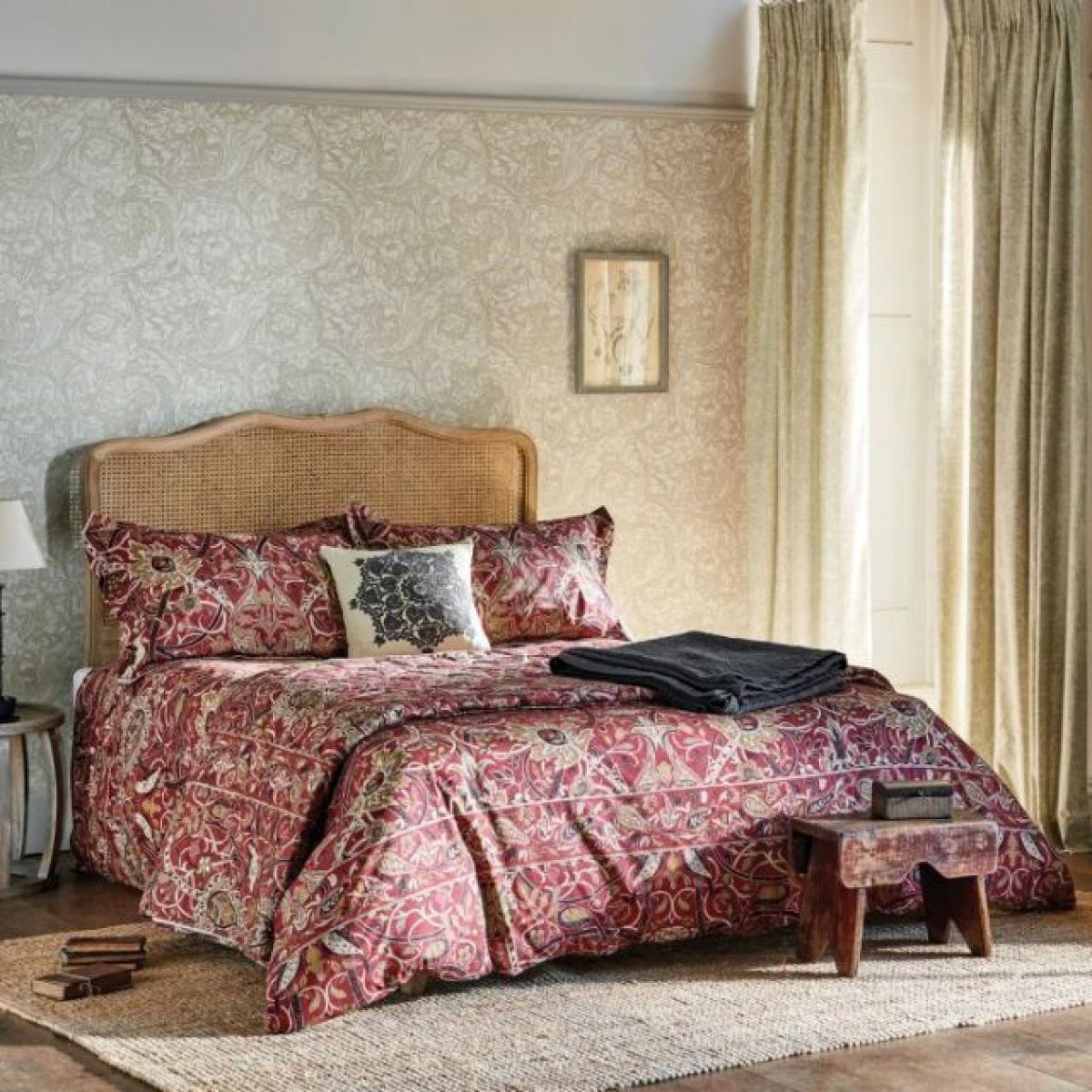 This stunning Morris & Co. bedding is resplendent in a striking red and gold colourway, printed on 100% cotton and with plain linen colour reverse. Inspired by a Persian carpet owned by William Morris, the design features scrolling flowers and foliage enveloping pairs of birds. A decorative border provides additional detail. For cooler evenings, add a layer of warmth with a quilted bedspread which echoes the leaf and floral pattern of the duvet cover (sold separately). Product Features:  Machine washable. 100% Cotton construction with a plain linen colour reverse 220 Thread Count. * Please note - Only the duvet cover is supplied at this price. Pillowcases are sold separately