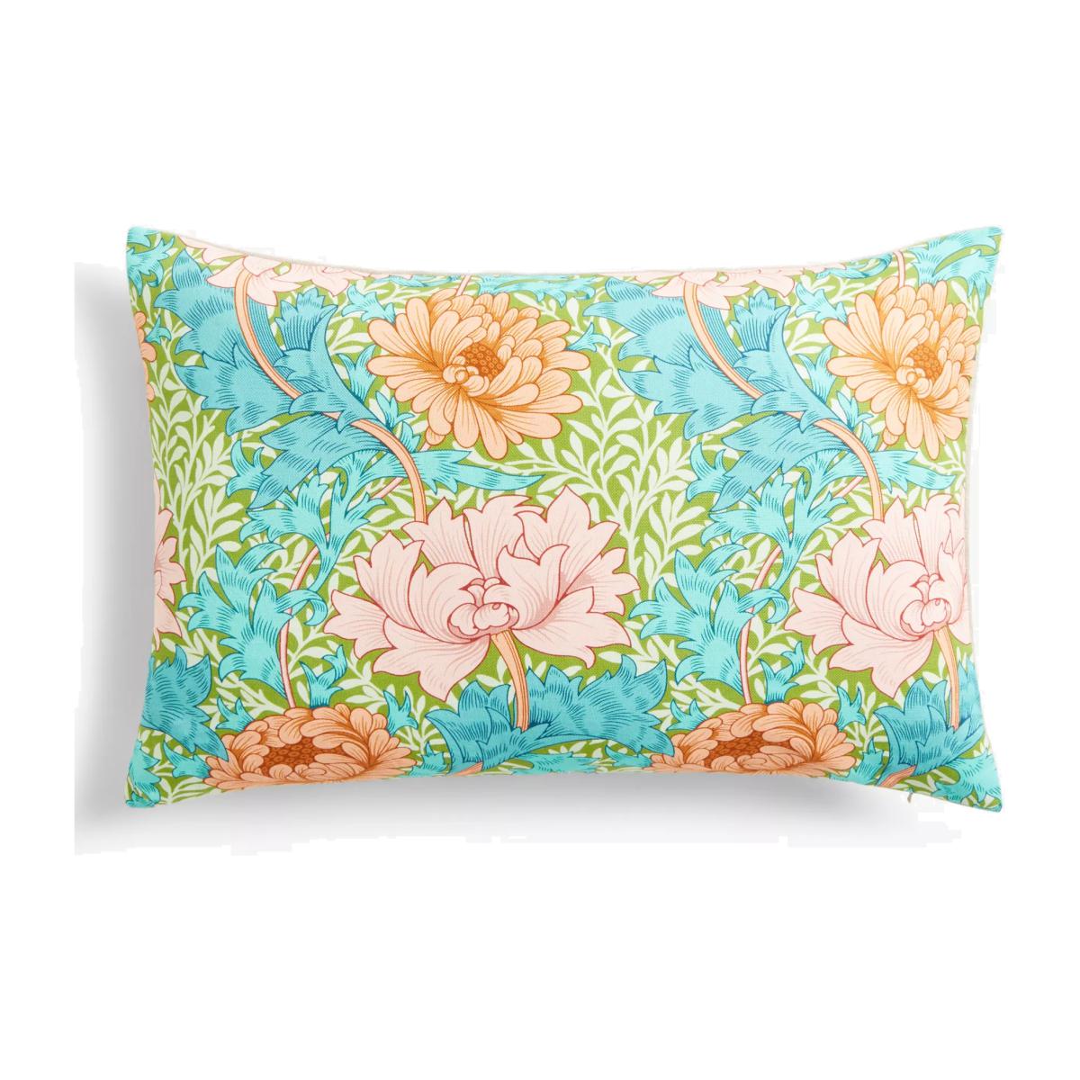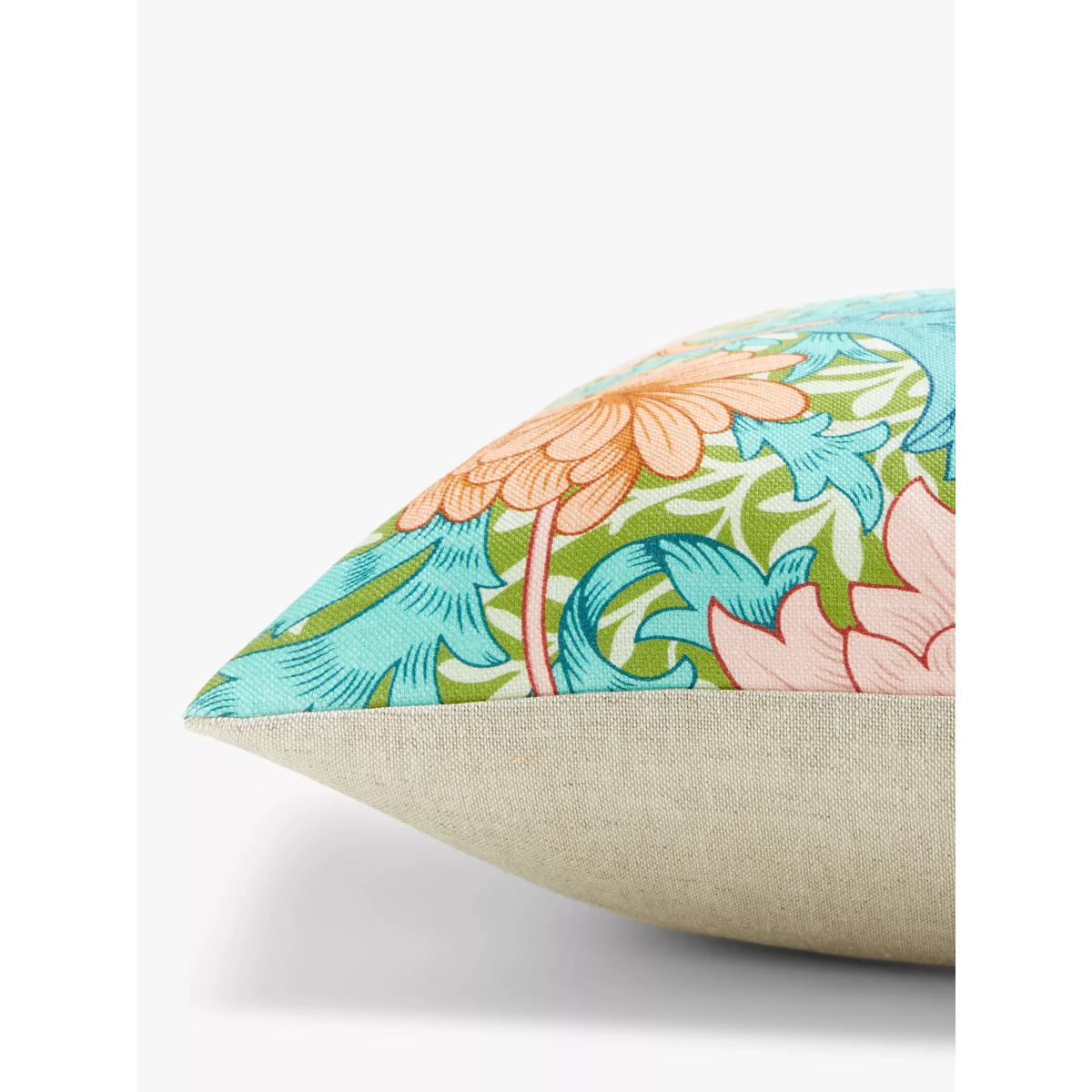 Prepare to be wowed by the vibrancy of this 1960s inspired Morris & Co. cushion, recoloured by interior designer Ben Pentreath in his signature palette. With a powerful Japanese influence and full of personality, coral and turquoise tones pair wonderfully with an olive ground to give this 1886 adaptation of a Jeffrey & Co. wallpaper a modern twist.
