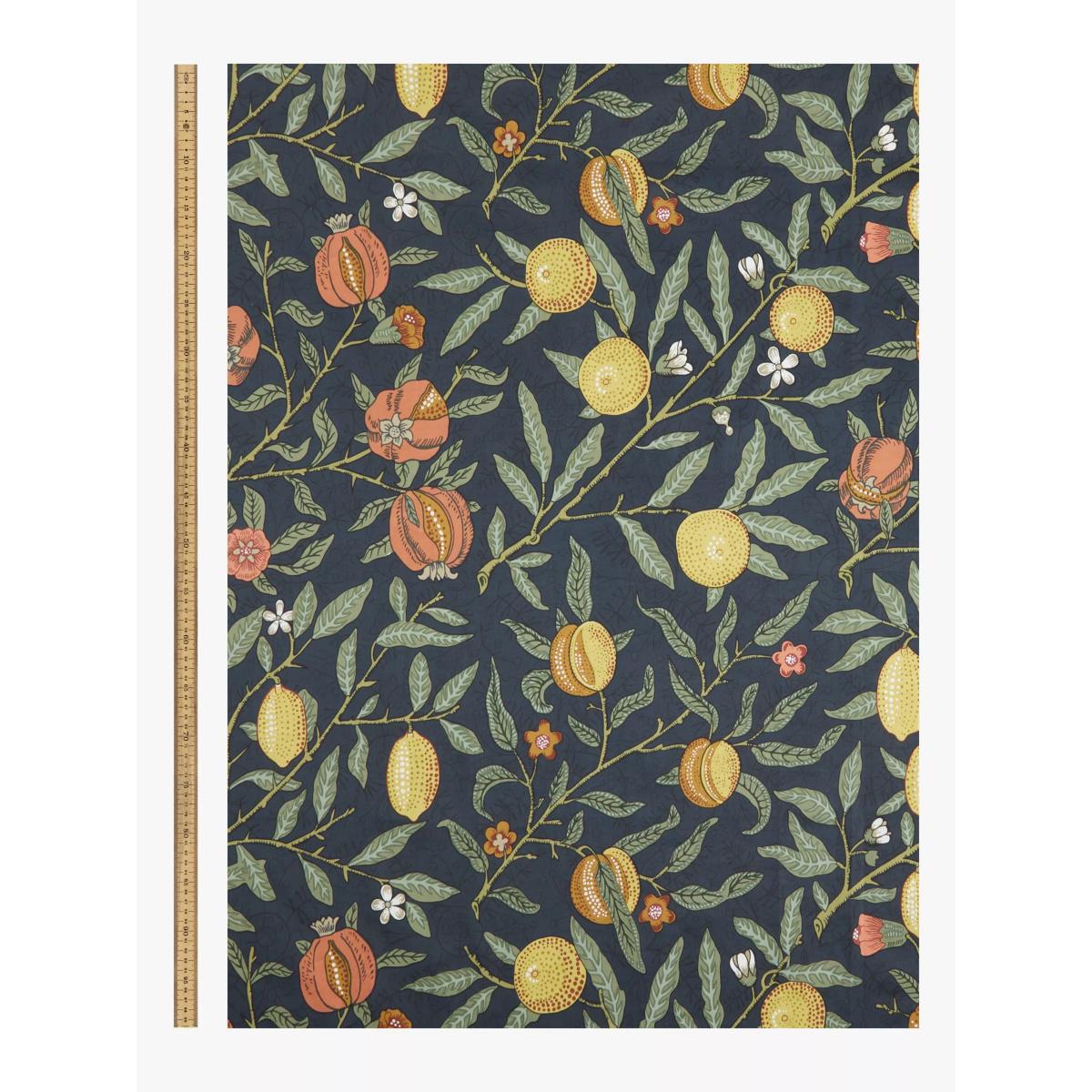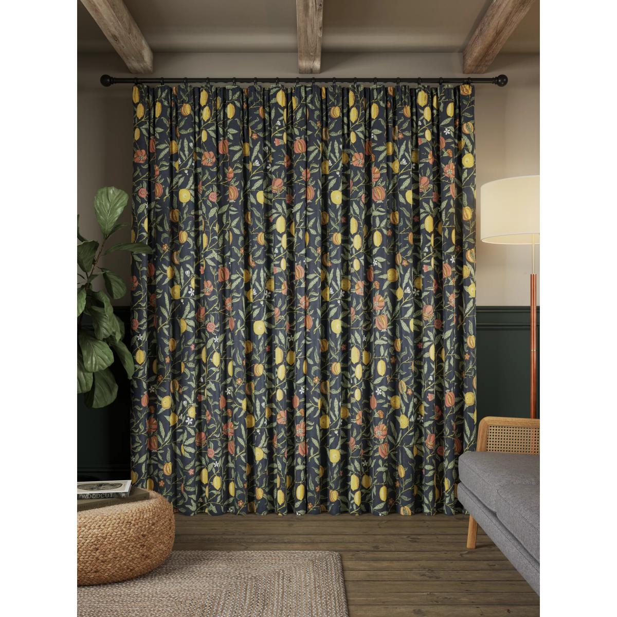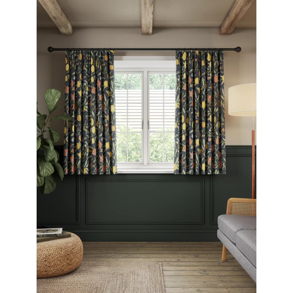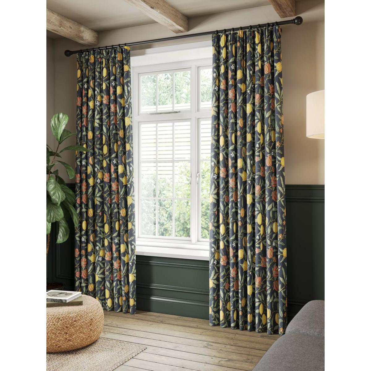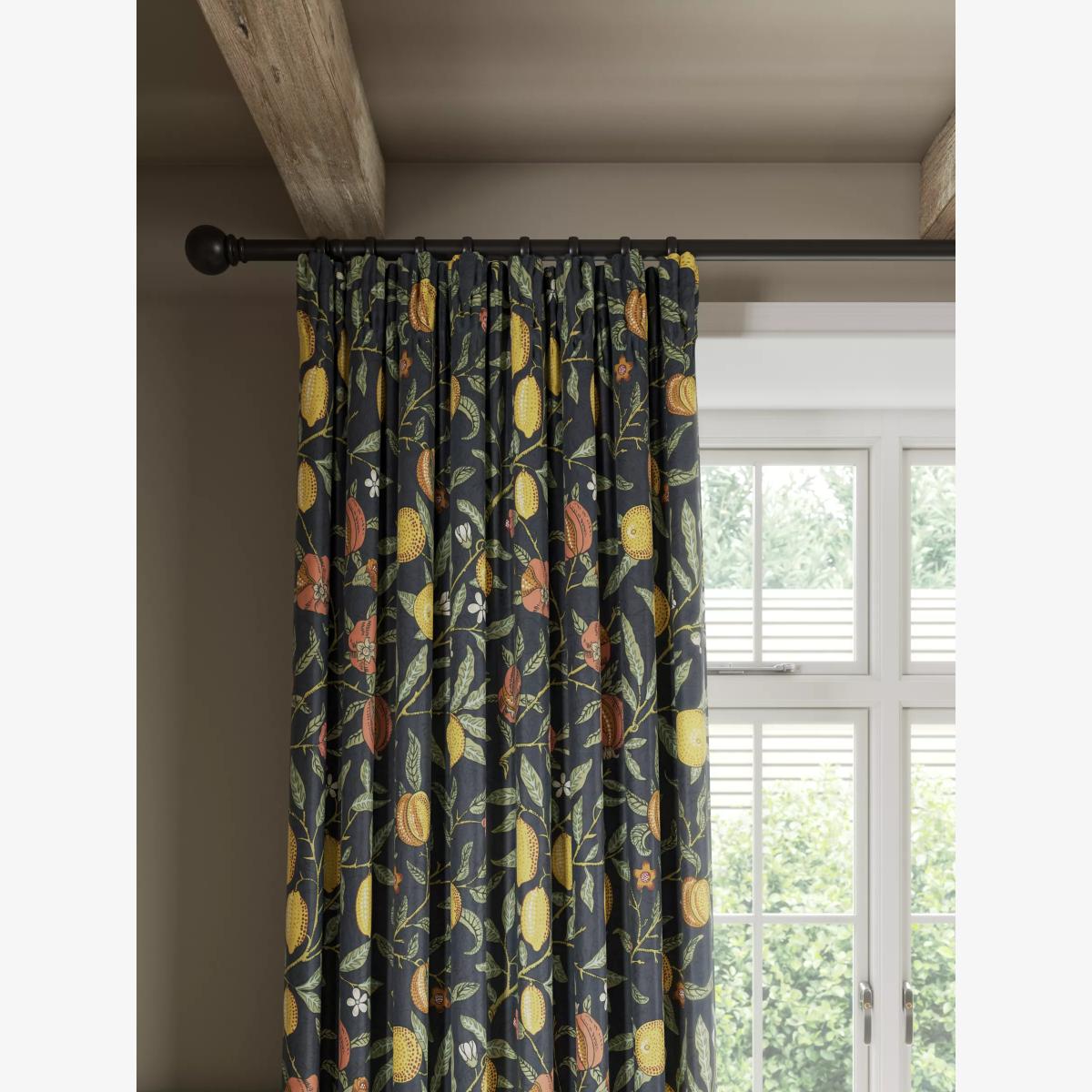 A classic Morris pattern originally designed as a wallpaper in 1864, "Fruit" has been carefully adapted and printed on a cotton sateen fabric to make these curtains. The pencil pleat heading creates small, neat folds at the top of the curtain and the soft lining lends a full look, improving the drape and enhancing the vibrancy of the pattern. Choosing the right size These curtains can be hung with a pole or track using curtain hooks (not included). There are three hook positions on the heading, allowing you to choose how your curtains sit against the track or pole. For example, if you're using a track you may want to use the middle or lower row of hooks to cover the track, whereas if you're using a pole you may want to use the top row of hooks so the curtains hang below the rings. The specified drop is taken from the top row of hook pockets to the bottom edge of the curtain. The width stated indicates the size of one curtain panel when laid completely flat. This pack contains two panels, and the track/pole length we've recommended allows for the two panels to be gathered when the curtains are drawn. For a fuller look, increase the curtain width. One pair of 117cm width curtains will fit a curtain track/pole size 117-167cm One pair of 167cm width curtains will fit a curtain track/pole size 133-167cm One pair of 228cm width curtains will fit a curtain track/pole size 182-228cm Better Cotton By choosing our cotton products, you’re supporting our investment in Better Cotton’s mission to help cotton communities survive and thrive while protecting and restoring the environment. Better Cotton Farmers are farmers who care for the environment and respect workers’ rights and wellbeing. This product is sourced via a system of mass balance and therefore may not contain Better Cotton. bettercotton.org/massbalance Do you need a curtain pole and accessories? Shop them here.