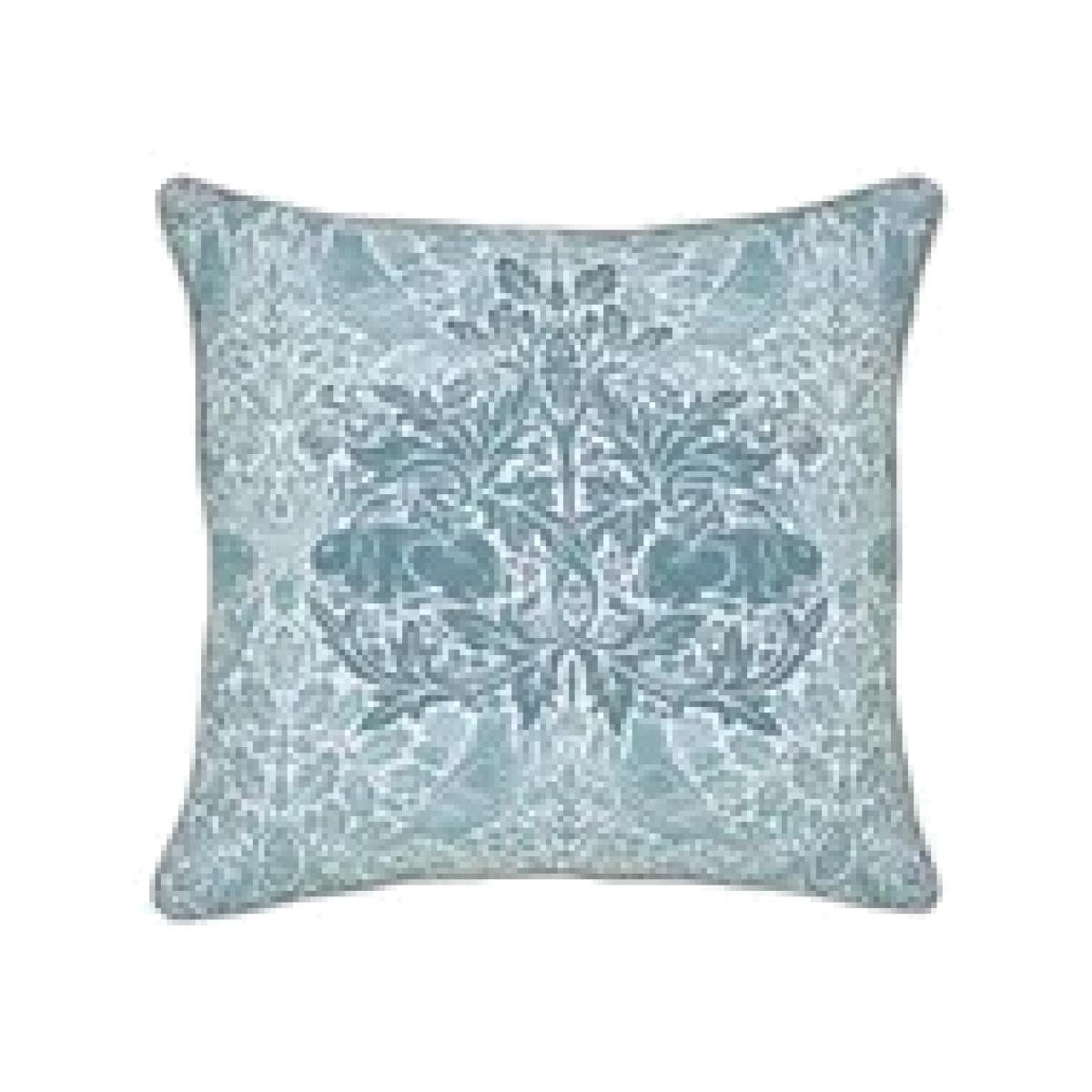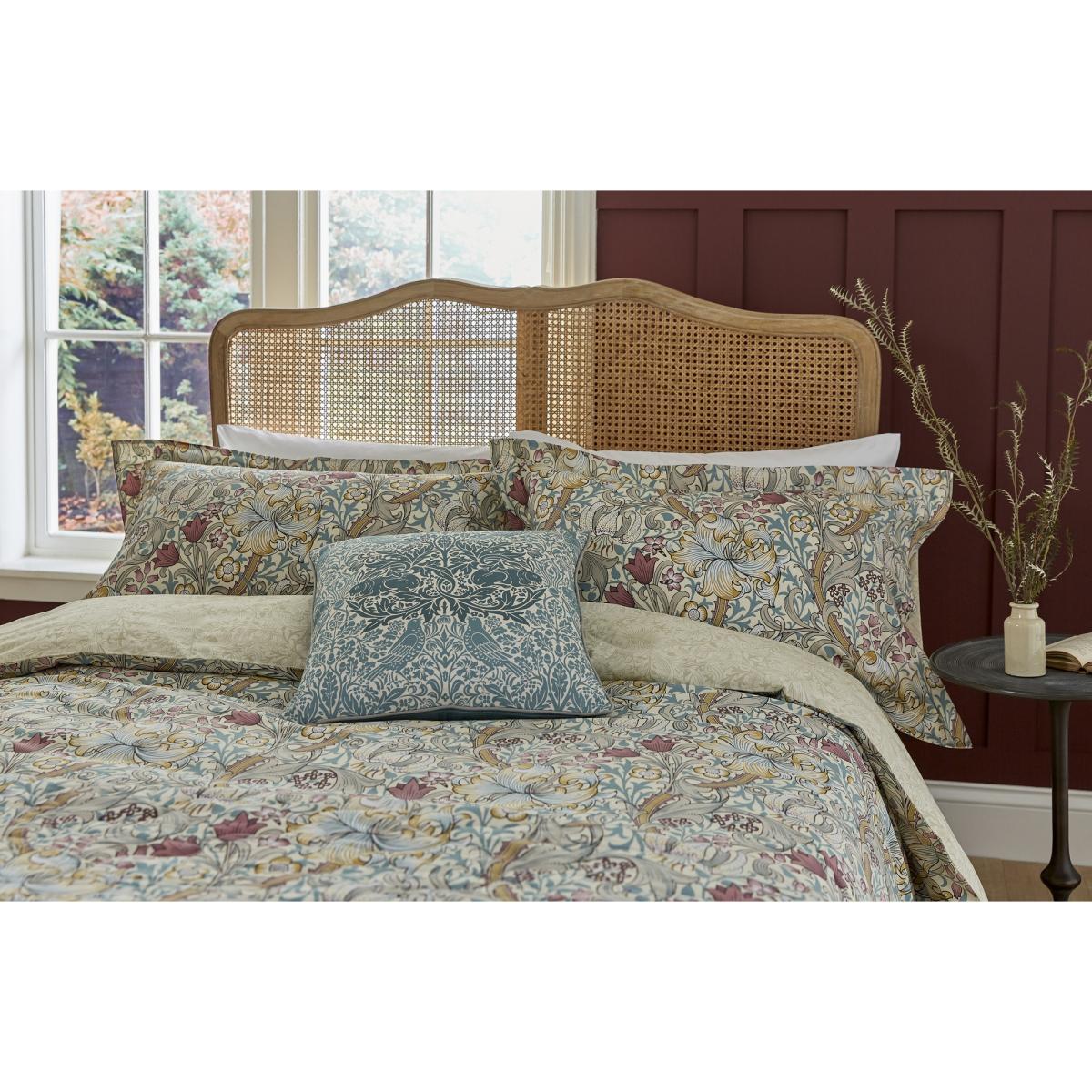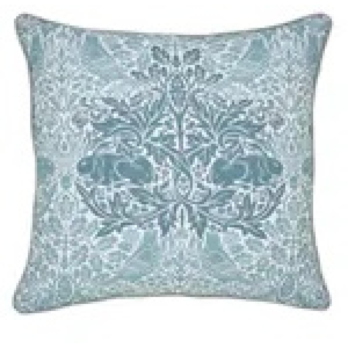 A strong diagonal arrangement of J.H. Dearle's Golden Lily for Morris & Co. (1899) provides structure for the intertwining tendrils and foliage of this stunning bedding. One of Morris & Co.'s legacy designs, this bedding range is made with 180T. C cotton percale and is available on 4 sizes of duvet cover set accompanied by Oxford pillowcase(s) of the same design. The pattern of the duvet covered is echoed in the matching quilted throwover (265x260cms) and the range is accessorised with cotton cushion (45x45cms) featuring a print of birds, rabbits and lush foliage in teal blue tones. Features: Dimensions 45 x 45cm 100% Cotton canvas Cushion filling fibre Care Instructions: Dry clean only Please note All screens vary in colour reproduction and whilst every effort has been made to display the colour as accurately as possible it is for guidance only.