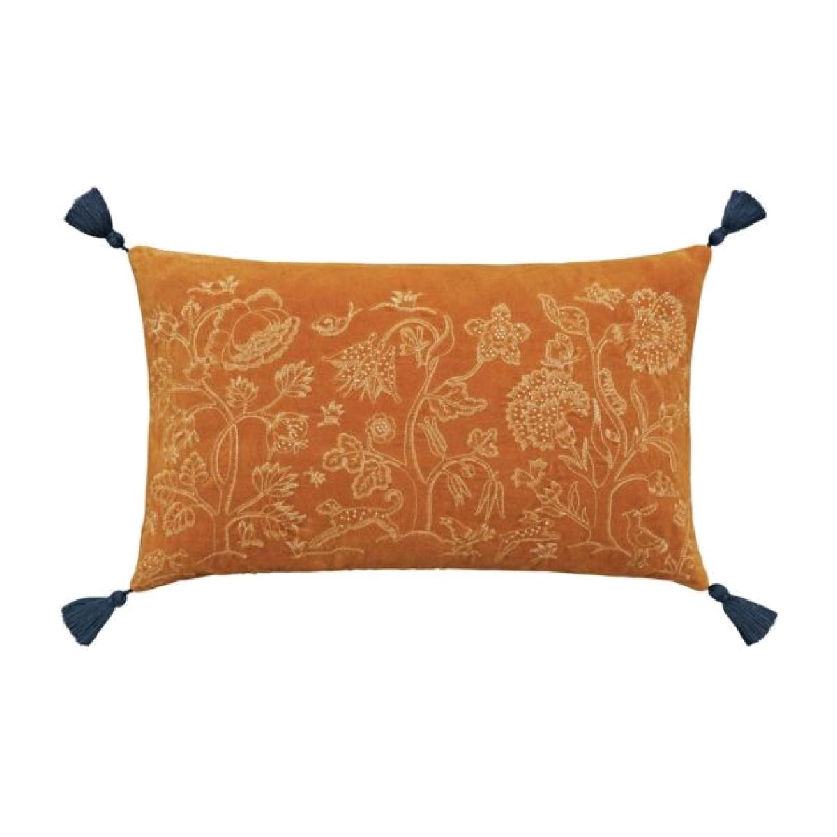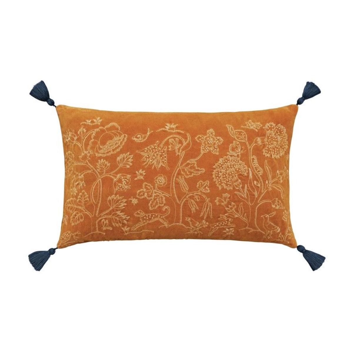 The coordinating Honeysuckle & Tulip embroidered velvet cushion offers a touch of charm and whimsy to your interior scheme. This embroidered animal design is made up of a stunning saffron yellow against a burnt orange background.  Featuring a plain dye reverse and cotton tassels on all four corners. Dry clean only Size: 30x50cm All screens vary in colour reproduction and whilst every effort has been made to display the colour as accurately as possible it is for guidance only.