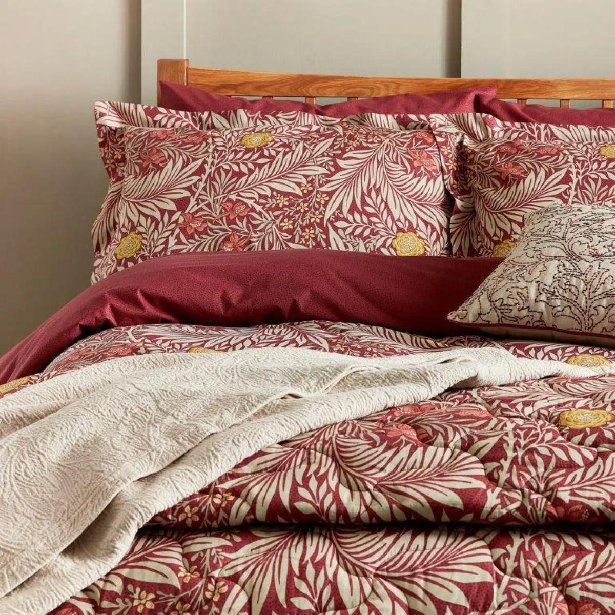 William Morris Larkspur Red. This Morris and Co Larkspur bedding boasts leaves and fern stems winding around small groups of flowers on a rich crimson background. The duvet has a complementing all over spot design on the reverse. This set includes a pair of coordinating Oxford pillowcases. Standard pillowcases in the same design as the reverse of the duvet cover (all over spot print) along with a cushion and throw in the Larkspur collection are available separately for a coordinated look. 100% Cotton Percale. Single includes one pillowcase.  Double/King/Super King includes two pillowcases. Machine Wash 40 C. Tumble Dry Low. Warm Iron On Reverse If Required. All screens vary in colour reproduction and whilst every effort has been made to display the colour as accurately as possible it is for guidance only.