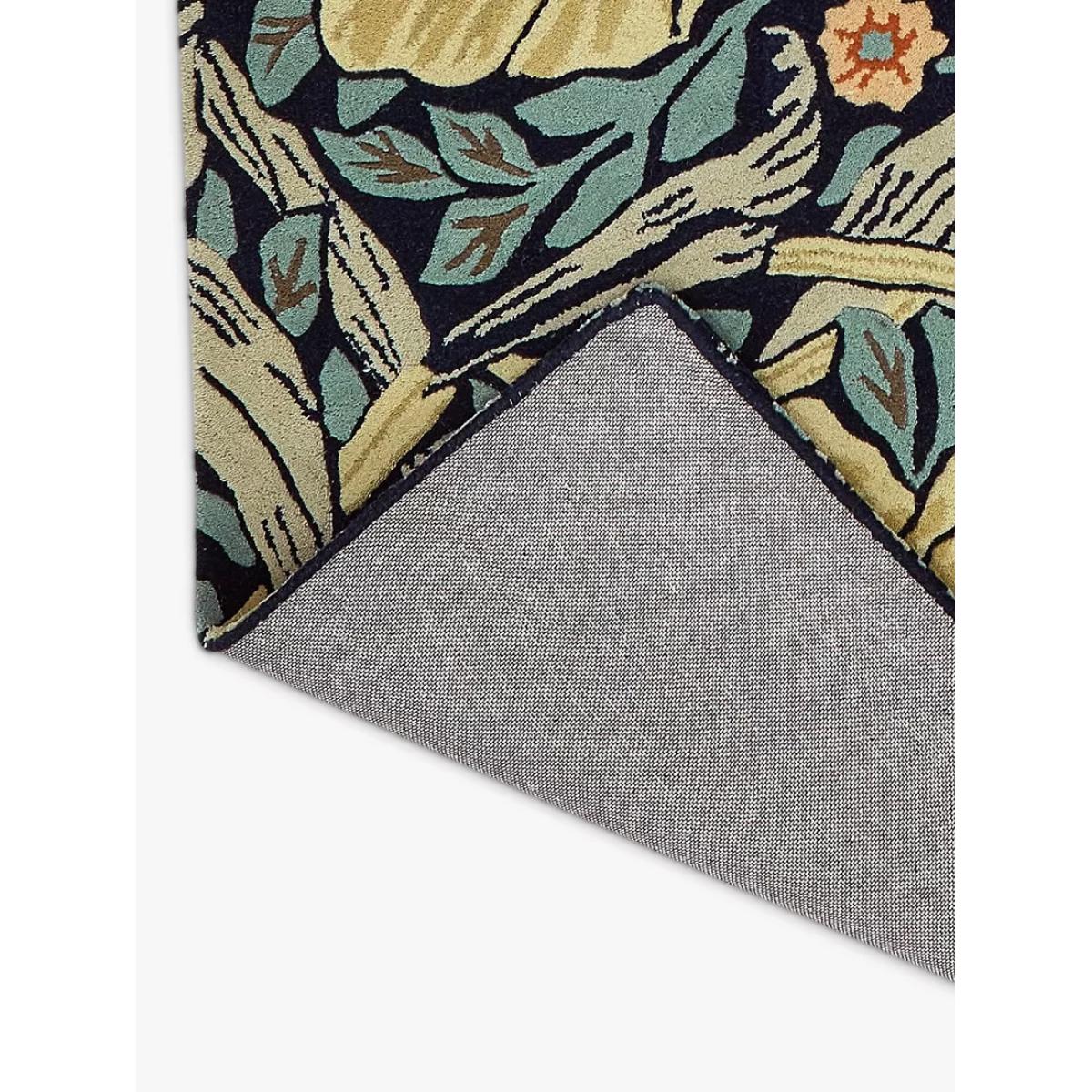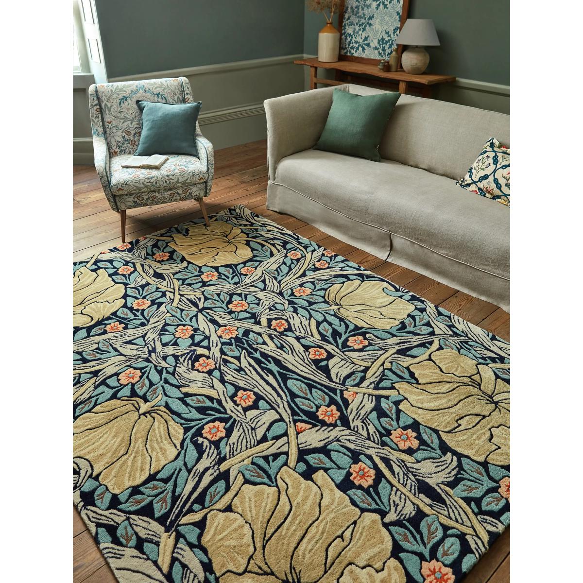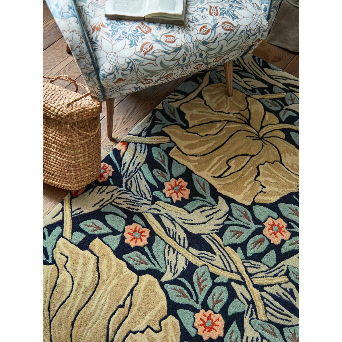 One of the most iconic of all William Morris's designs, Pimpernel from 1876 describes dramatically swirling tulips and tendrils, interspersed with jewel-like pimpernel flowerheads. Translated onto this beautiful 100% woollen hand-tufted rug, the indigo colourway adds depth of colour and drama. This rug is tufted by hand, meaning that material is injected into the back of the rug with a tufting gun, holding the material firmly in place. About your new rug We recommend John Lewis & Partners Rug Hold Underlay. It prevents your rug from moving underfoot and protects against colour transfer to the floor As this rug is made using natural fibres, shedding is to be expected. This will reduce over time, and should not have an impact on the lifespan or performance of your rug. When you first get your rug, please use the brush attachment on your vacuum cleaner whilst the shedding dies down. After that, when vacuuming your rug, use suction only. Rotating brushes may damage the fibres. When vacuuming your rug, use suction only. Rotating brushes may damage the fibres Blot any spills with a clean, dry cloth. Do not rub or use harsh detergents. Textile backed Attend to spillages immediately and blot with a clean, dry cloth to prevent staining. Dilute a small amount of appropriate carpet shampoo in water. Dampen a colourfast cloth in the diluted shampoo solution and dab the rug, lightly agitating, moving in the direction of the pile. Treat the whole rug and not just the affected area. To restore the appearance of the affected area, use a soft bristled brush to gently comb in the direction of the pile. Allow the rug to thoroughly dry. The benefits of a wool rug Warm and durable, wool feels beautifully soft underfoot and is long-lasting Naturally flame-retardant and odour resistant Water repellent so easier to clean Naturally biodegradable, wool is part of the circular economy and contains no micro plastics