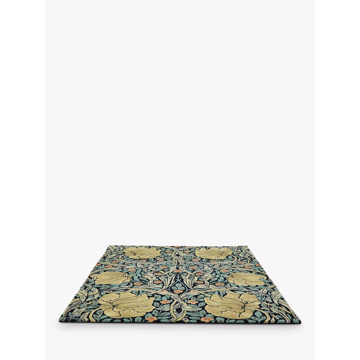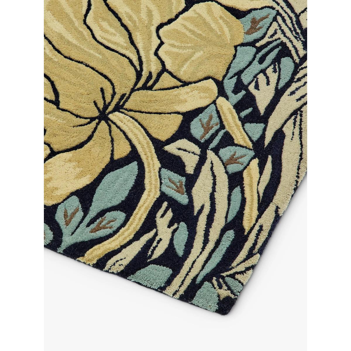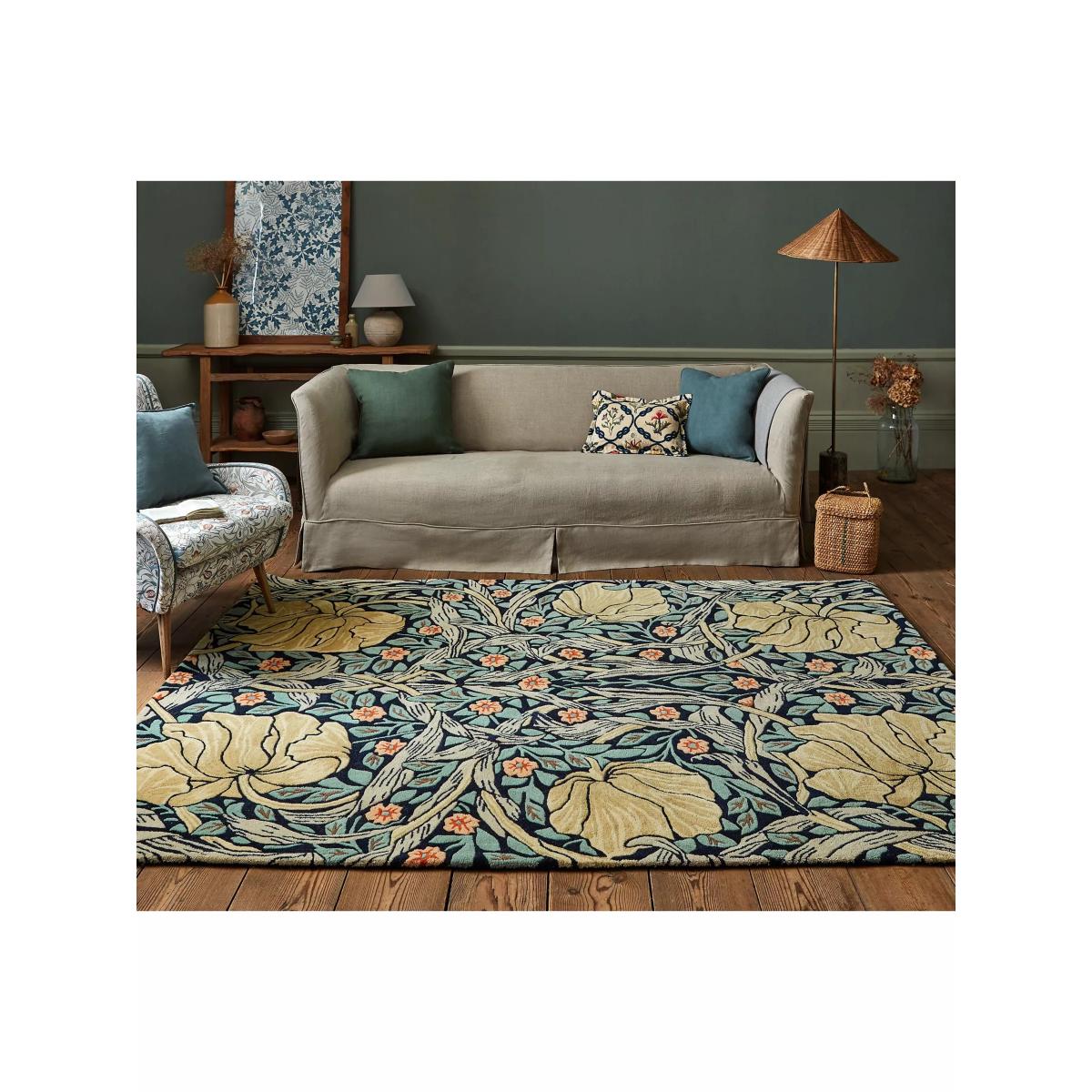 One of the most iconic of all William Morris's designs, Pimpernel from 1876 describes dramatically swirling tulips and tendrils, interspersed with jewel-like pimpernel flowerheads. Translated onto this beautiful 100% woollen hand-tufted rug, the indigo colourway adds depth of colour and drama. This rug is tufted by hand, meaning that material is injected into the back of the rug with a tufting gun, holding the material firmly in place. About your new rug We recommend John Lewis & Partners Rug Hold Underlay. It prevents your rug from moving underfoot and protects against colour transfer to the floor As this rug is made using natural fibres, shedding is to be expected. This will reduce over time, and should not have an impact on the lifespan or performance of your rug. When you first get your rug, please use the brush attachment on your vacuum cleaner whilst the shedding dies down. After that, when vacuuming your rug, use suction only. Rotating brushes may damage the fibres. When vacuuming your rug, use suction only. Rotating brushes may damage the fibres Blot any spills with a clean, dry cloth. Do not rub or use harsh detergents. Textile backed Attend to spillages immediately and blot with a clean, dry cloth to prevent staining. Dilute a small amount of appropriate carpet shampoo in water. Dampen a colourfast cloth in the diluted shampoo solution and dab the rug, lightly agitating, moving in the direction of the pile. Treat the whole rug and not just the affected area. To restore the appearance of the affected area, use a soft bristled brush to gently comb in the direction of the pile. Allow the rug to thoroughly dry. The benefits of a wool rug Warm and durable, wool feels beautifully soft underfoot and is long-lasting Naturally flame-retardant and odour resistant Water repellent so easier to clean Naturally biodegradable, wool is part of the circular economy and contains no micro plastics