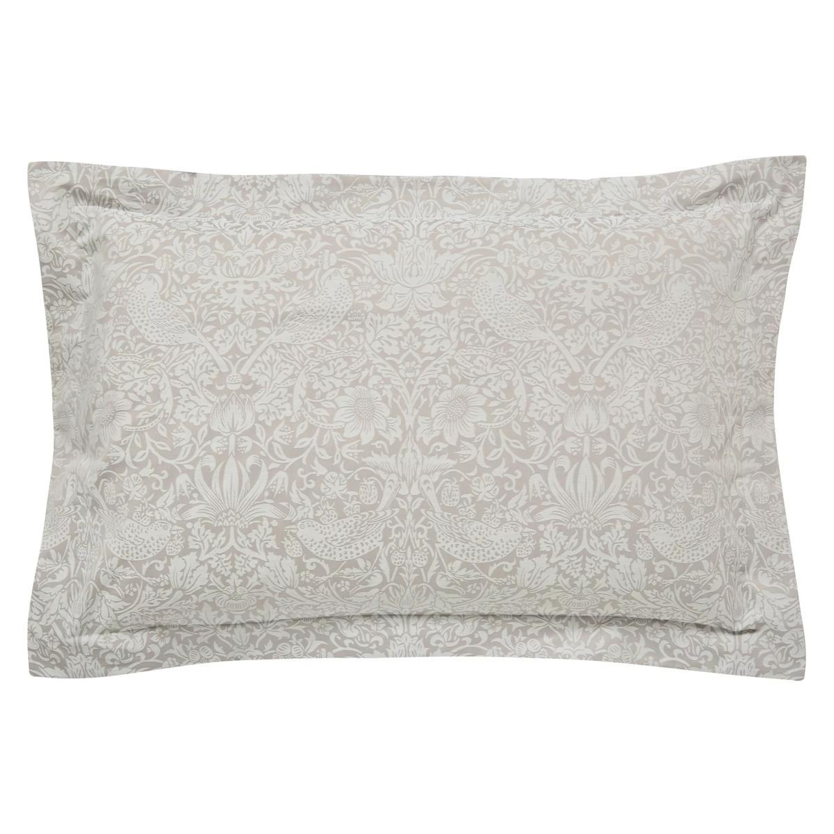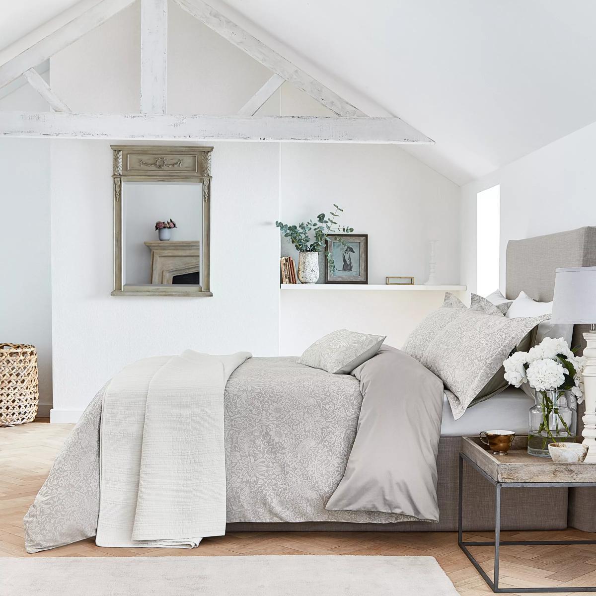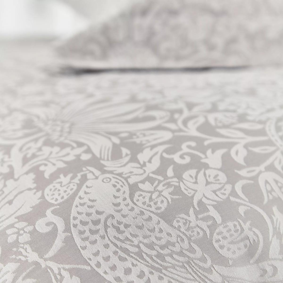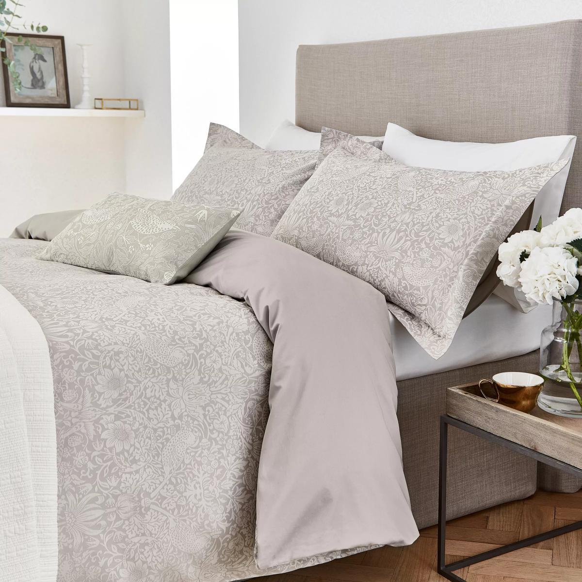 Originally a fabric designed by William Morris in 1883, Pure Strawberry Thief has been re-created in a contemporary monochromatic colourway, whilst retaining the exquisite detail of the multi-coloured original. The range includes a Jacquard duvet cover and Oxford pillowcase, woven in a fine 300 thread count cotton and reversing to a coordinating, plain 200 thread count percale. Please note: Duvet covers and pillowcases are available to purchase separately, and not in sets. Have you thought about sheeting? Shop. Bedding sizes To fit duvet/pillow size (cm) Oxford pillowcase, L75 x W50cm (excluding trim) Single duvet cover, L200 x W135cm Double duvet cover, L200 x W200cm King duvet cover, L220 x W225cm Super king duvet cover, L220 x W260cm