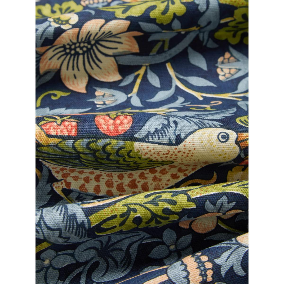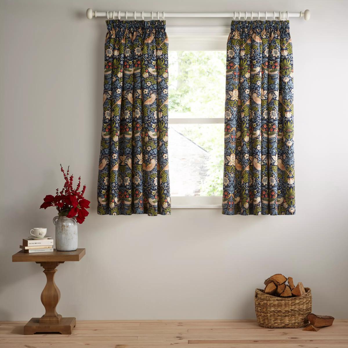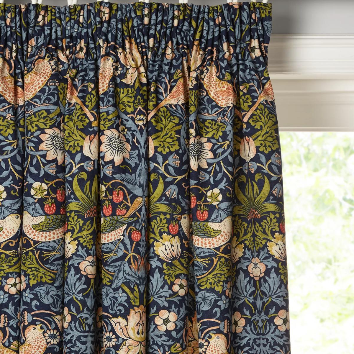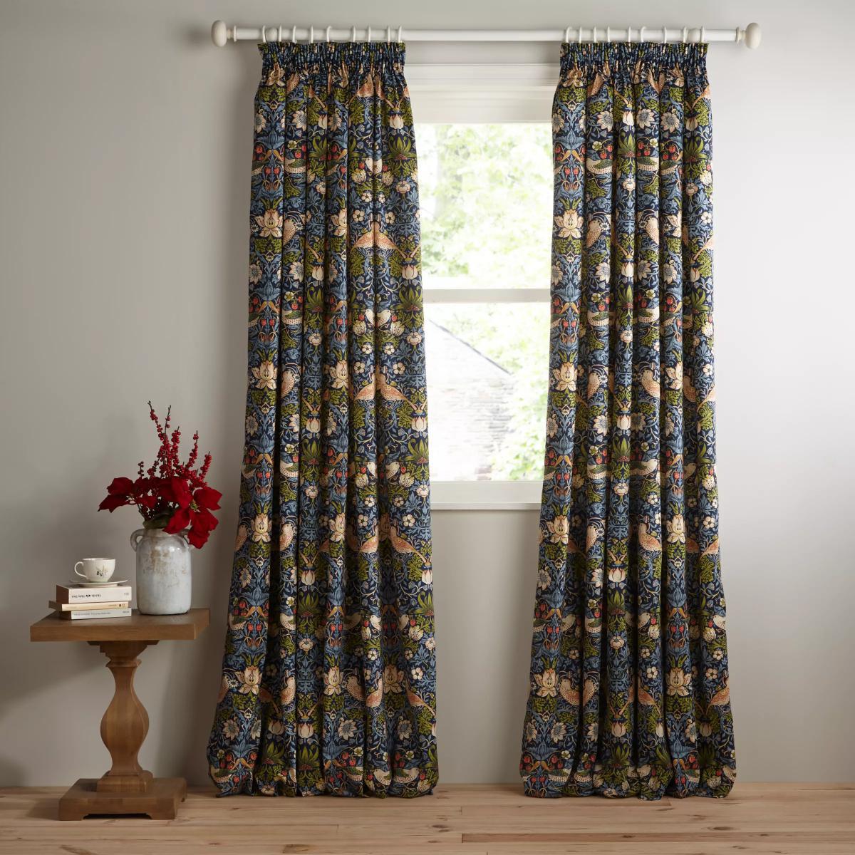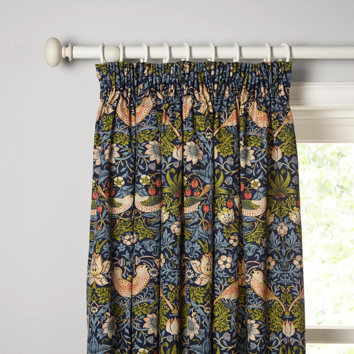This pretty curtain features William Morris's classic "Strawberry Thief" print. The lining lends the curtains a full look, improving drape and enhancing the vibrancy of the pattern. Choosing the right size These curtains can be hung with a pole or track using curtain hooks (not included). There are three hook positions on the heading, allowing you to choose how your curtains sit against the track or pole. For example, if you're using a track you may want to use the middle or lower row of hooks to cover the track, whereas if you're using a pole you may want to use the top row of hooks so the curtains hang below the rings. The specified drop is taken from the top row of hook pockets to the bottom edge of the curtain. The width stated indicates the size of one curtain panel when laid completely flat. This pack contains two panels, and the track/pole length we've recommended allows for the two panels to be gathered when the curtains are drawn. For a fuller look, increase the curtain width. One pair of 117cm width curtains will fit a curtain track/pole size 93-117cm One pair of 167cm width curtains will fit a curtain track/pole size of 133-167cm One pair of 228cm width curtains will fit a curtain track/pole size of 182-228cm Worth knowing... We package our curtains in recycled materials to keep them protected whilst they make their way to you. This means that when they arrive there could be some creases in them. We recommend you hang them for a few days to allow them to flatten and for the creases to fall out. If after this period your curtains still show signs of being folded then follow the ironing instructions on the back of the packaging. Be aware that each style of curtain has different ironing instructions, including heat limitations according to the fabric, so do make sure you follow the guidance provided to get the best results. Do you need a curtain pole/track and accessories? Shop.