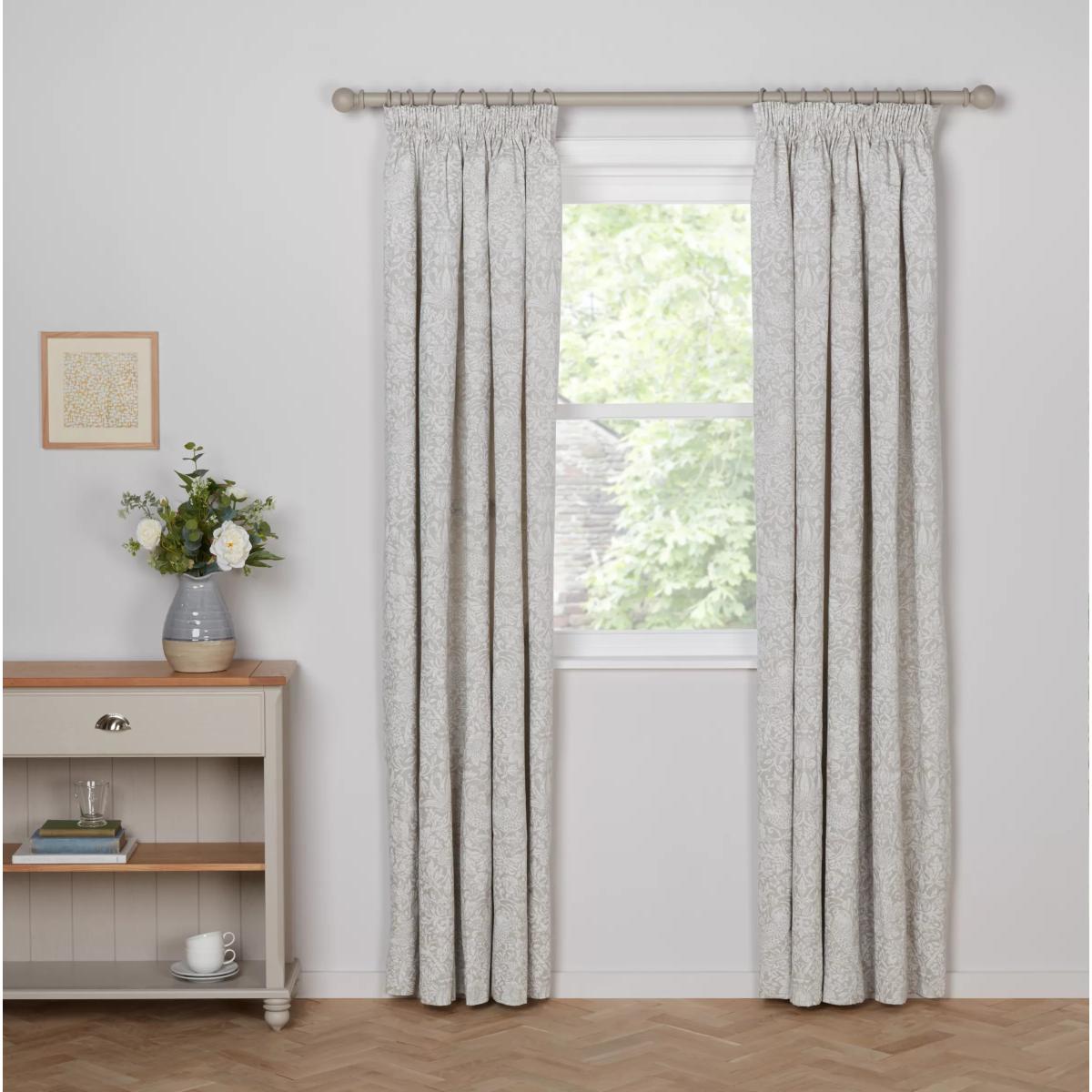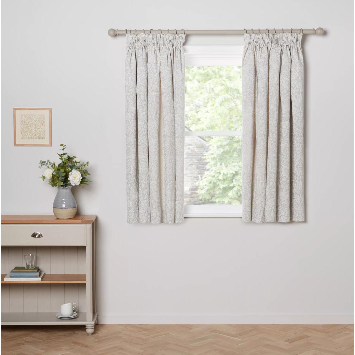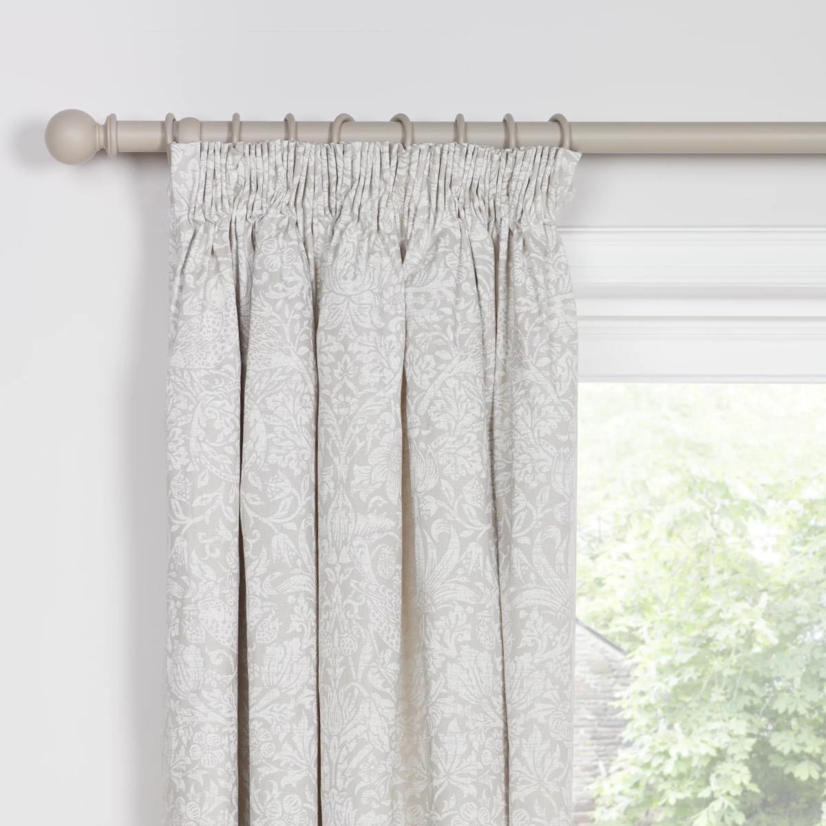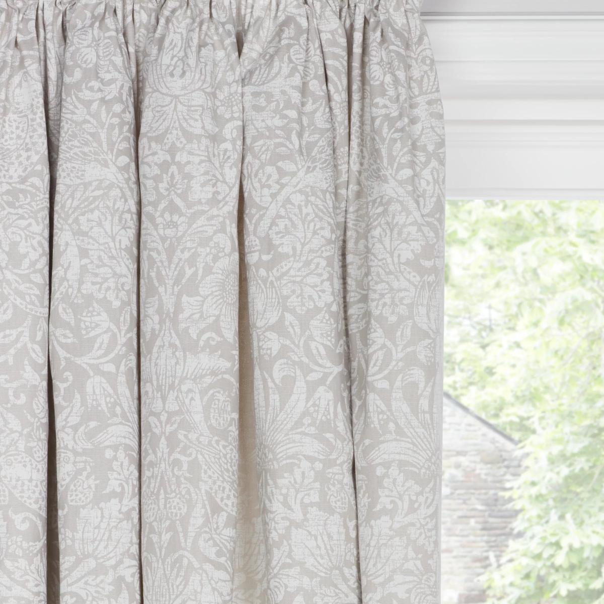 This pretty curtain features William Morris's classic Strawberry Thief print in a pale, pared-down incarnation. The lining lends the curtains a full look, improving drape and enhancing the vibrancy of the pattern. Choosing the right size These curtains can be hung with a pole or track using curtain hooks (not included). There are three hook positions on the heading, allowing you to choose how your curtains sit against the track or pole. For example, if you're using a track you may want to use the middle or lower row of hooks to cover the track, whereas if you're using a pole you may want to use the top row of hooks so the curtains hang below the rings. The specified drop is taken from the top row of hook pockets to the bottom edge of the curtain. The width stated indicates the size of one curtain panel when laid completely flat. This pack contains two panels, and the track/pole length we've recommended allows for the two panels to be gathered when the curtains are drawn. For a fuller look, increase the curtain width. One pair of 167cm width curtains will fit a curtain track/pole size of 133-167cm One pair of 228cm width curtains will fit a curtain track/pole size of 182-228cm Worth knowing... We package our curtains in recycled materials to keep them protected whilst they make their way to you. This means that when they arrive there could be some creases in them. We recommend you hang them for a few days to allow them to flatten and for the creases to fall out. If after this period your curtains still show signs of being folded then follow the ironing instructions on the back of the packaging. Be aware that each style of curtain has different ironing instructions, including heat limitations according to the fabric, so do make sure you follow the guidance provided to get the best results. Do you need a curtain pole/track and accessories? Shop here.