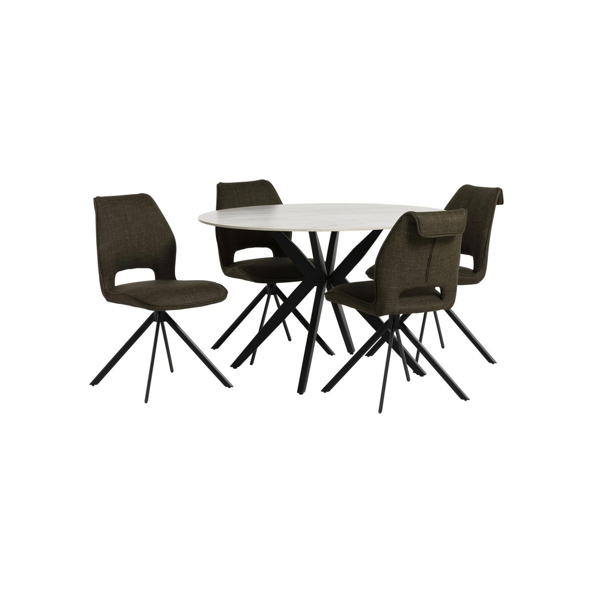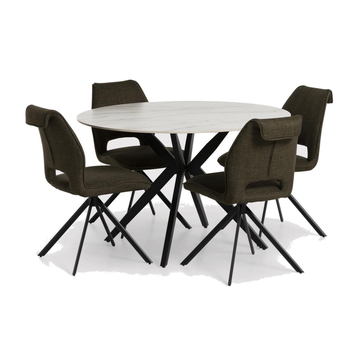 Create a refined dining space with this Morro round ceramic table paired with four Torrance dining chairs. Ideal for contemporary or minimalist interiors, the table’s sleek ceramic top offers durability and easy maintenance while maintaining an elegant look. The compact size makes it perfect for smaller spaces without compromising on style. The soft green fabric dining chairs add comfort and sophistication, completing a beautifully balanced and inviting dining set.
