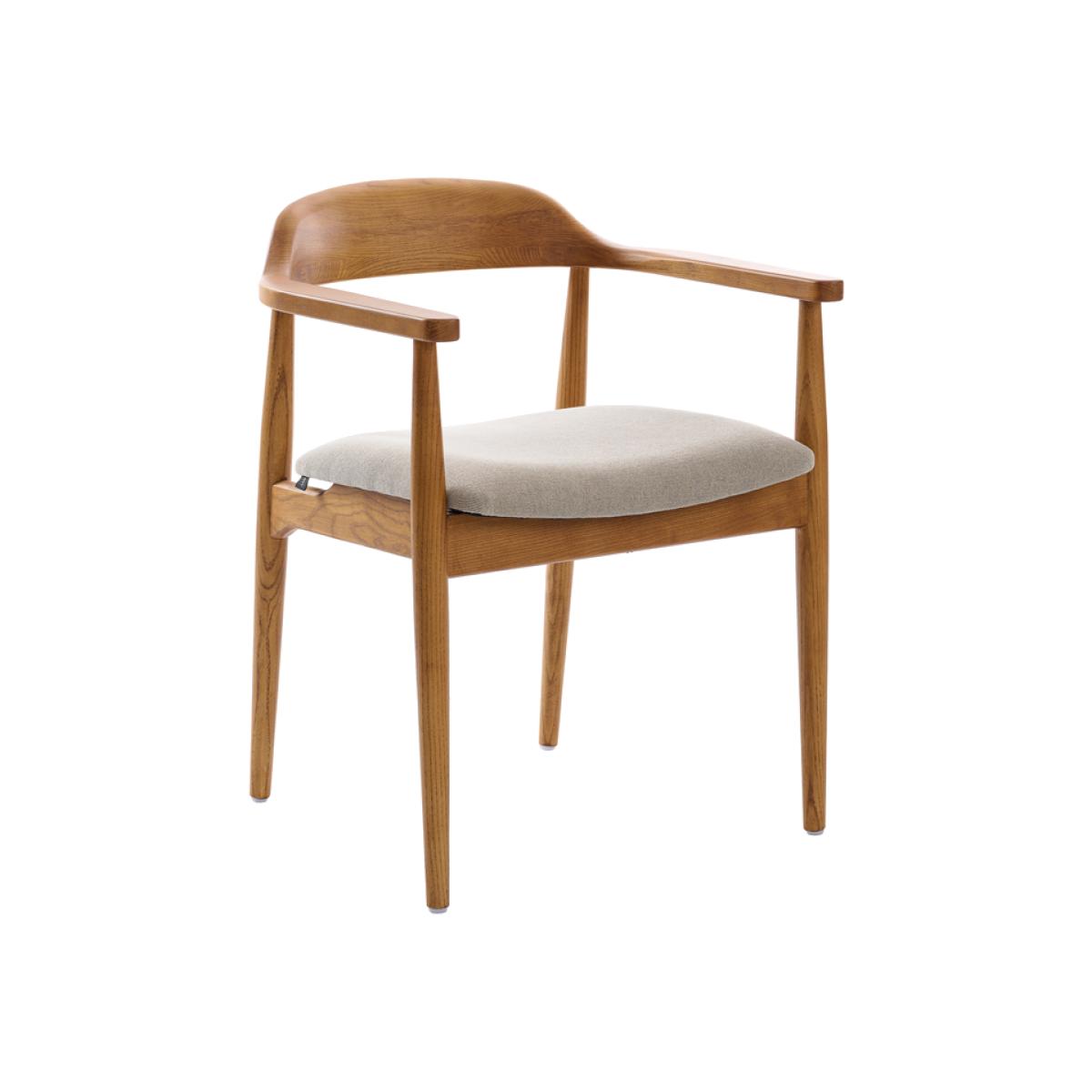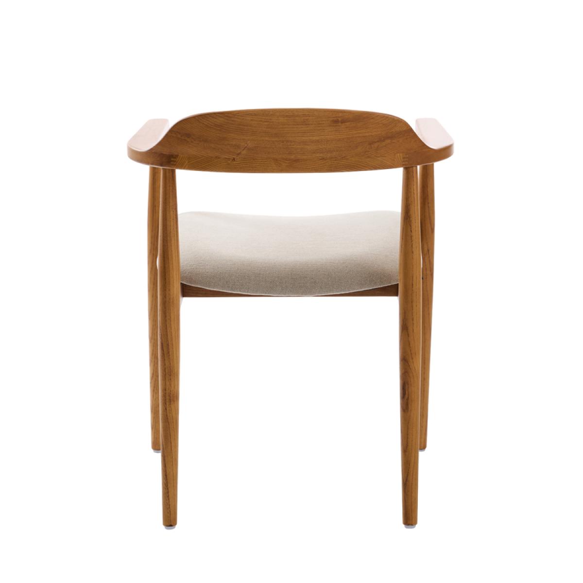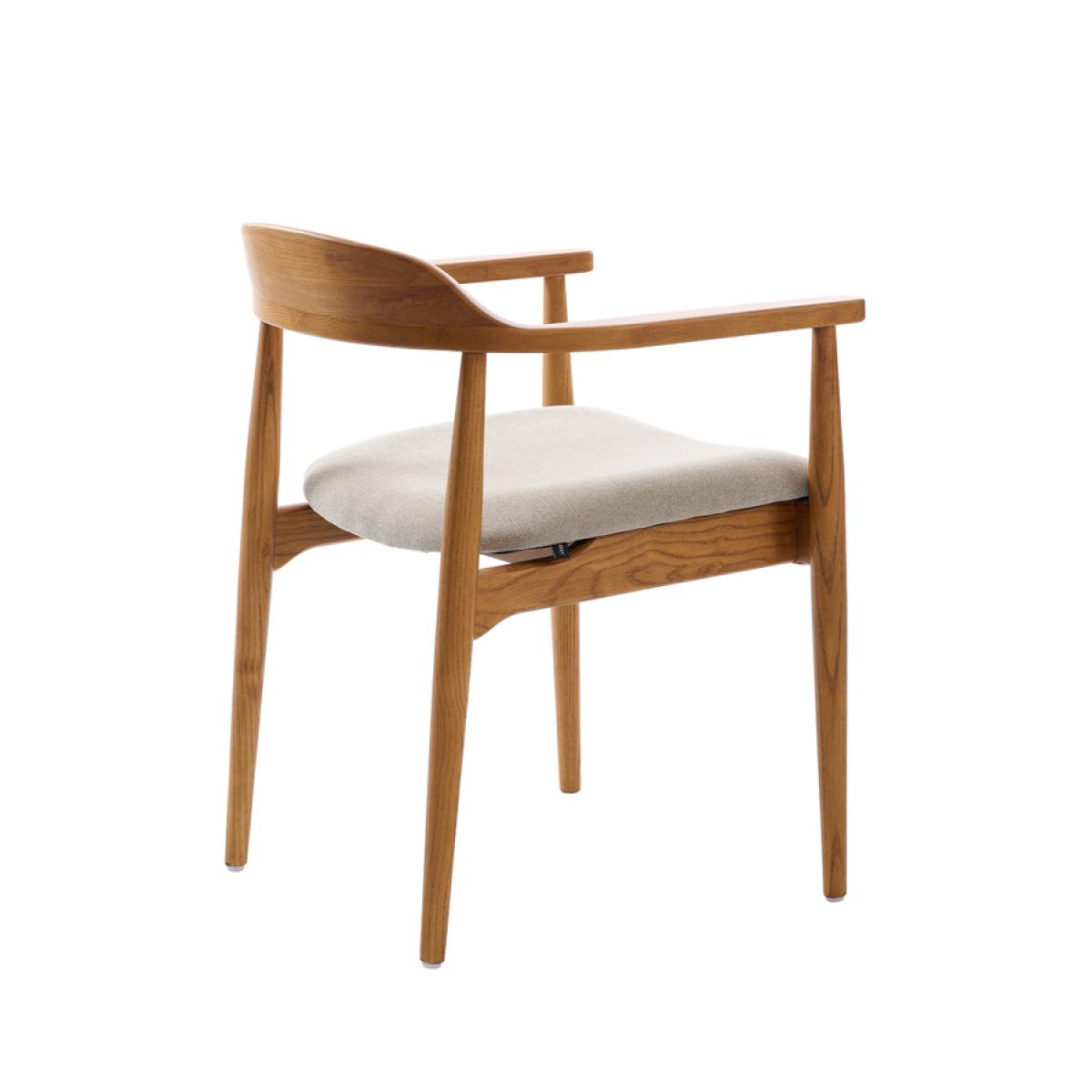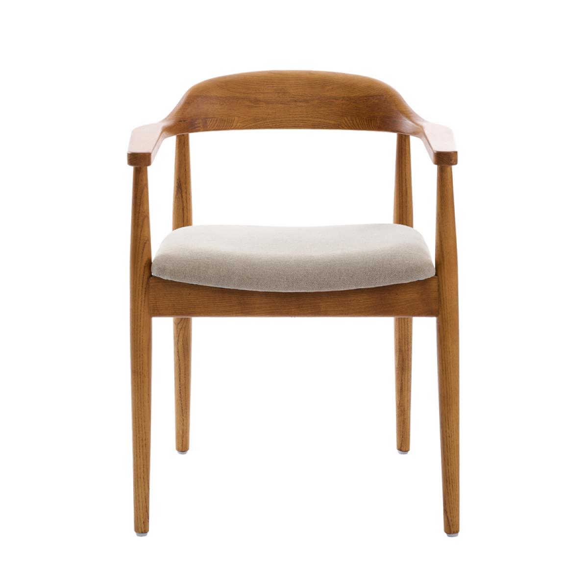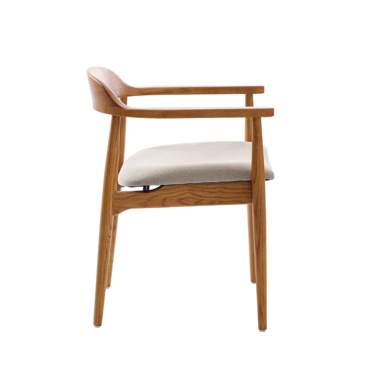 Hand-crafted from solid ash with a rich chestnut finish. Featuring smooth, sculpted lines and gracefully curved arms and backrest. Comfortable padded seat. Upholstered in a soft, water-repellent fabric. To remove spills, gently dab the area with a paper towel; avoid rubbing as this may drive the liquid into the fabric. Supplied fully assembled.