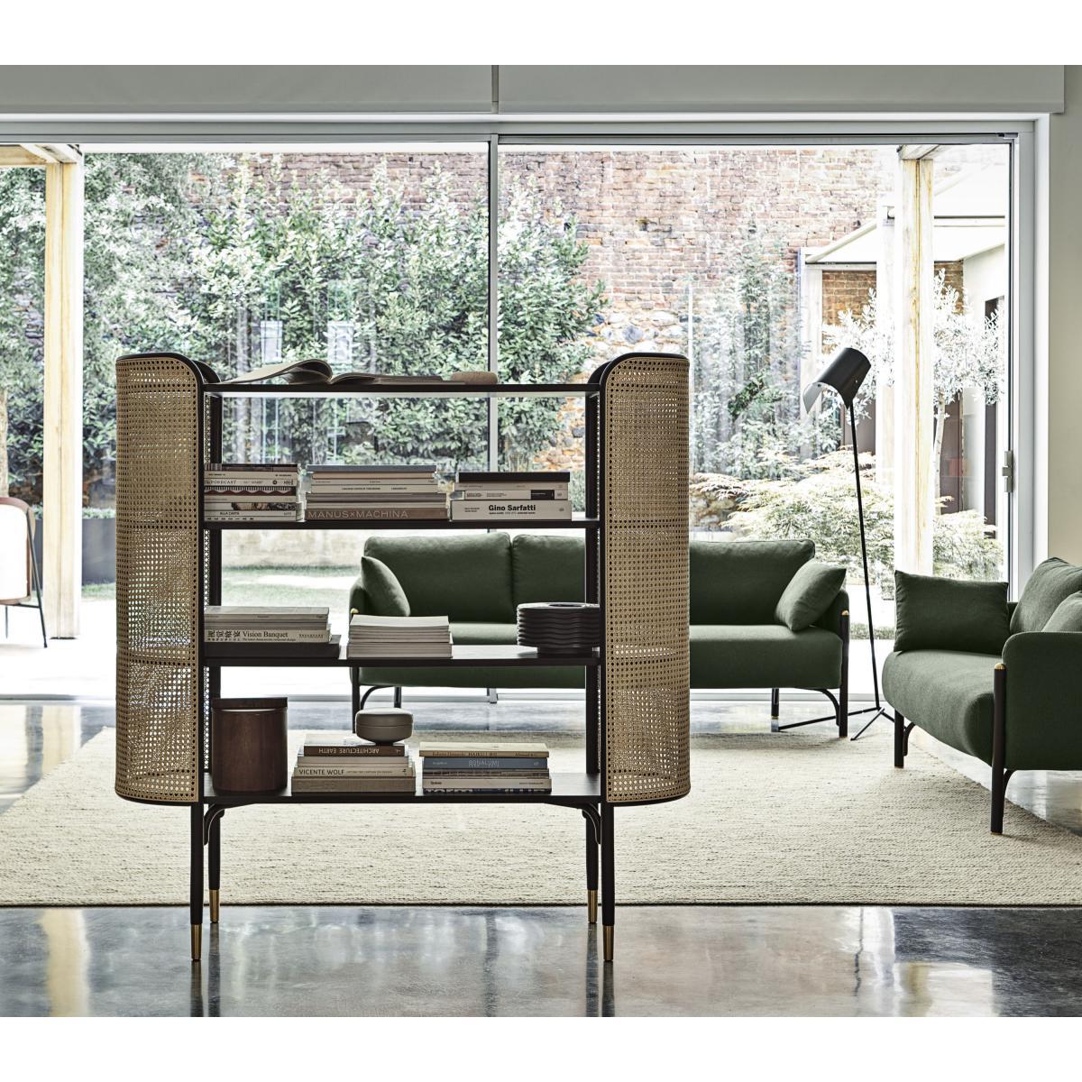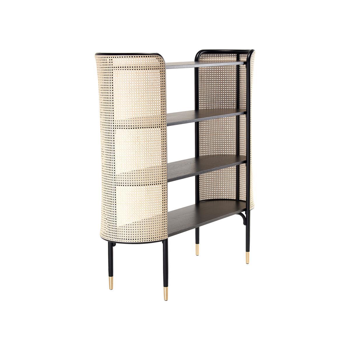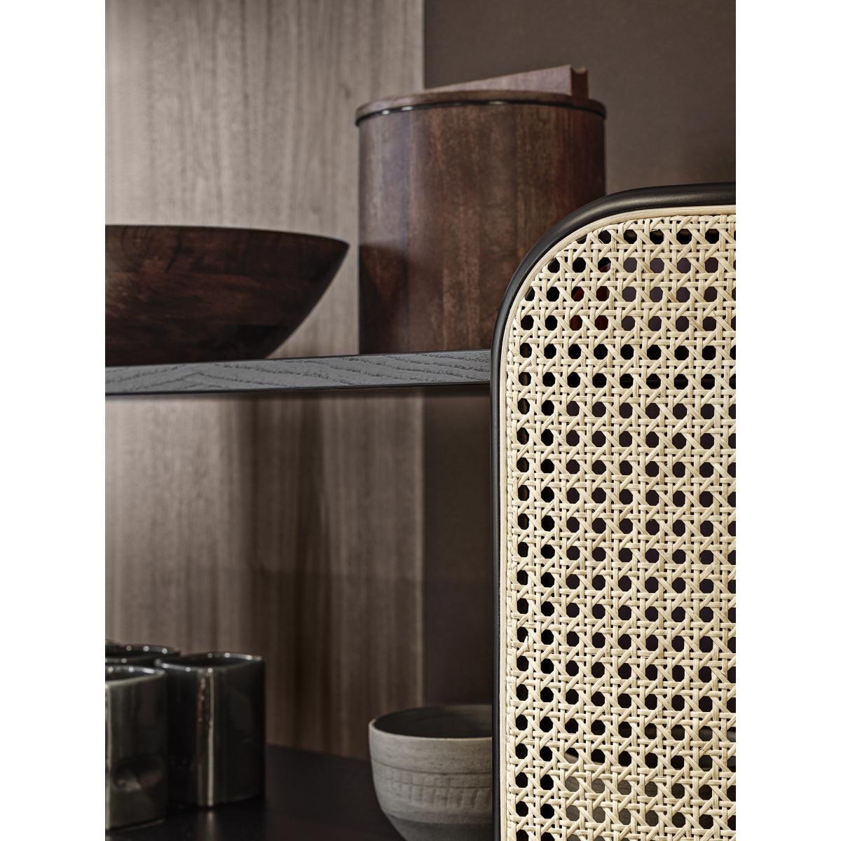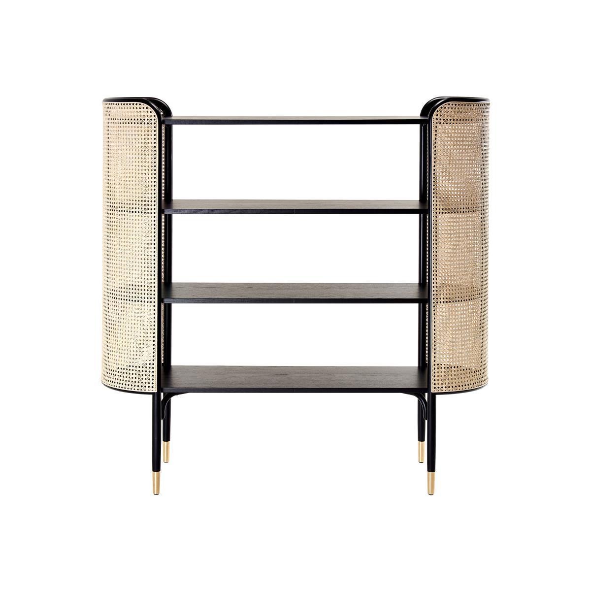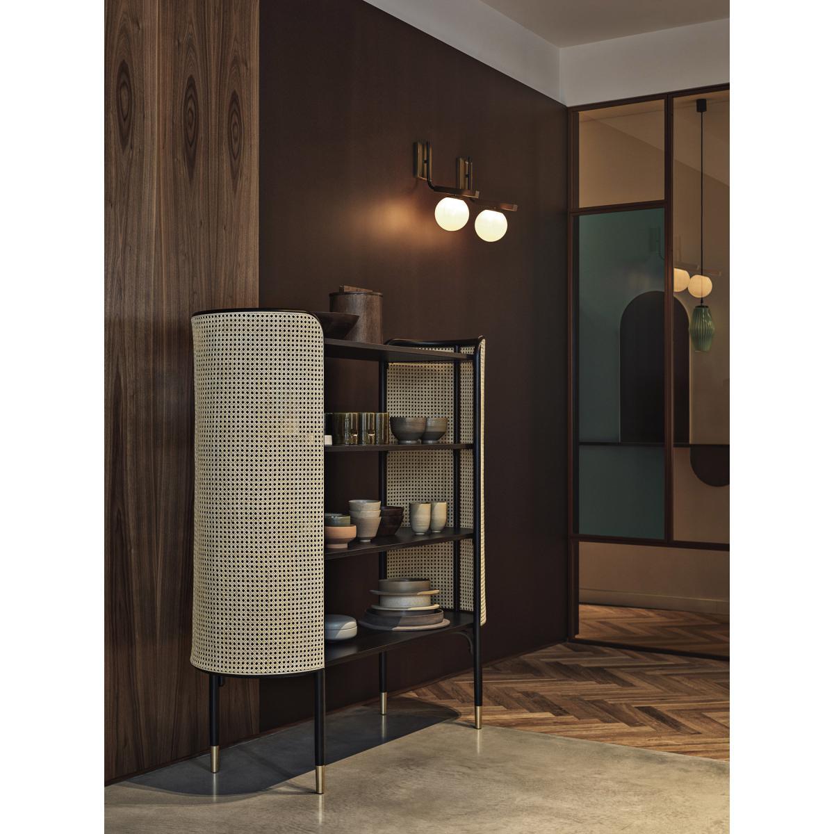 Exuding a retro charm with an Art Deco feel, the Mos shelving was designed in 2020 by the famous Italo-Danish Gamfratesi studio. This is a creation that breathes great modernity, combined with the timeless elegance of the first items of bentwood furniture that appeared in the late 19th century. Mos is characterised by its incredibly decorated and curved panels in straw caning, adding to its strong personality. These panels delicately surround the four shelves, disguising part of their content. The solid, lacquered black beech structure is finished with gilded brass feet, which give it a refined aspect. Thanks to its lightweight elegance, the Mos shelving can be integrated into any space, from the living room to the bedroom, in an office or an entrance hallway. The wealth of materials, high quality standards and exceptional finishes combined with the original shape perfectly reflect the Wiener GTV Design spirit. Drawing on the tradition and way of thinking of Michael Thonet, Wiener GTV Design develops products rooted in an innovative, meticulous design process. A team of designers, creators and artisans produces unique products of exceptional craftsmanship. Product sustainability is at the centre of the development process.