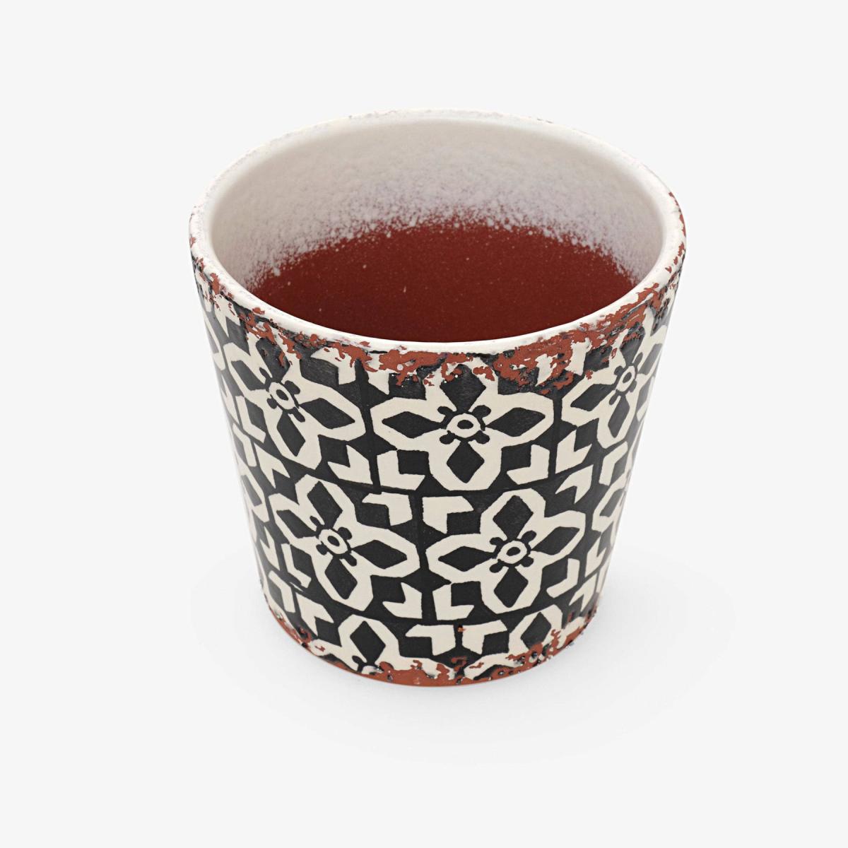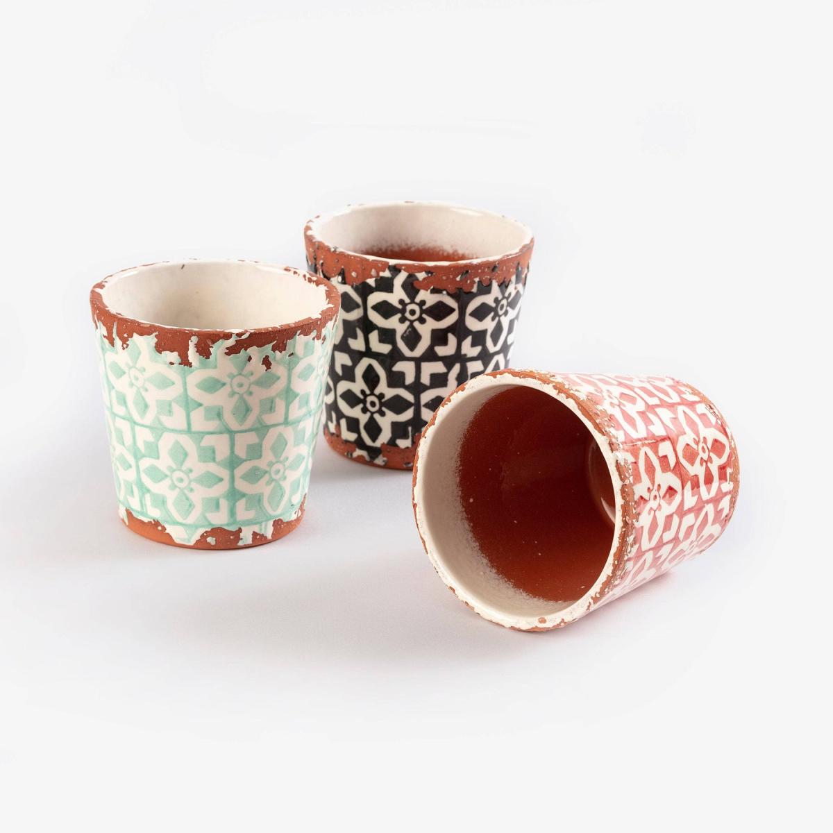 Small handmade ceramic pot painted with a floral Mediterranean-style mosaic tile design.
