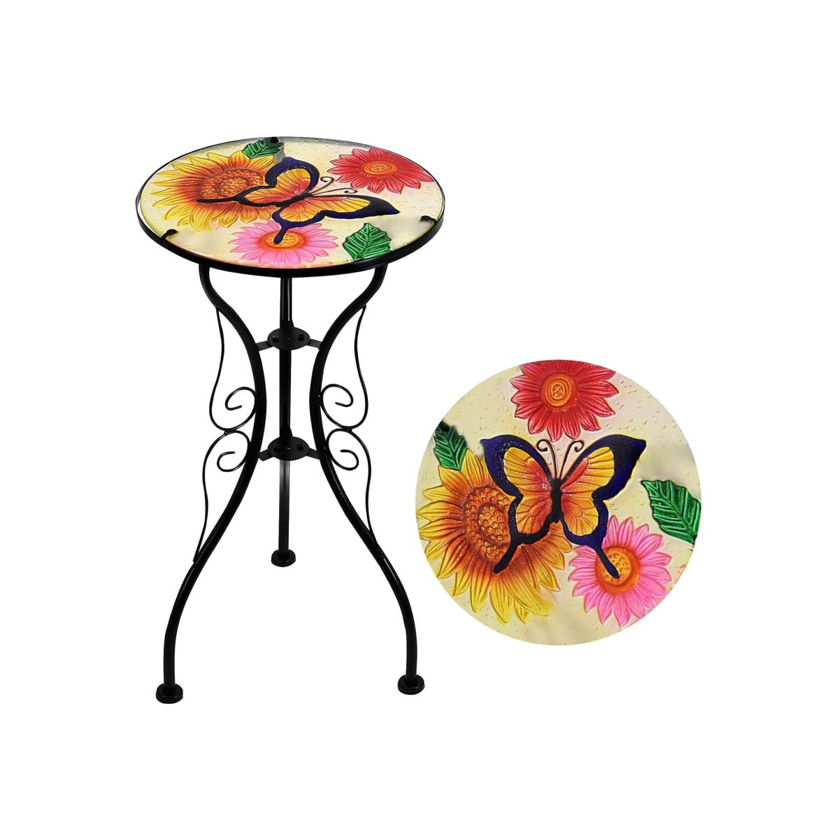 Add a vibrant touch to your garden with this eye catching round mosaic garden table featuring a colorful flower and butterfly design. Crafted with durable iron and weatherproof glass, it is perfect for balconies patios or indoor corners. Its compact design makes it a stylish plant stand or side table. A beautiful gift for garden lovers and a timeless addition to any outdoor setting. Mosaic Garden Table Round Outdoor - yellow