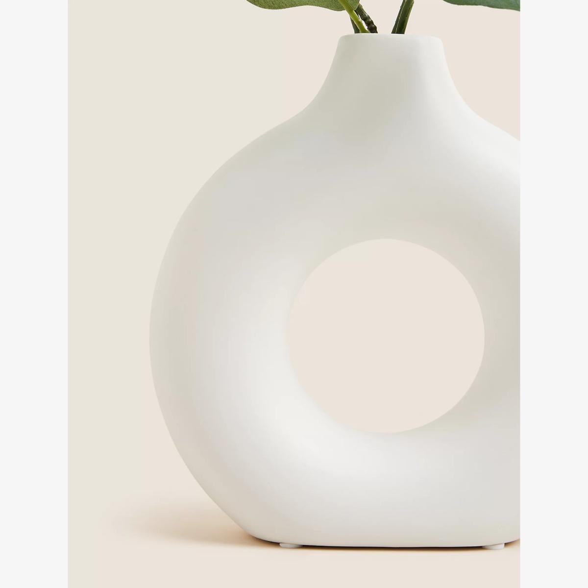 I really like this moss and sweetpea faux eucalyptus in the vase because it adds a fresh, natural touch without any maintenance. Its simple, sculptural shape makes it versatile for various interiors, from modern minimal spaces to Scandinavian-inspired homes. I’d suggest styling it in a corner or on a side table to introduce greenery without cluttering the space. It works particularly well paired with other natural materials like wood or ceramics. For added impact, place it in a spot where it can catch natural light, allowing the greenery to feel more authentic and vibrant. Overall, a practical and stylish piece that brings a touch of greenery effortlessly.
