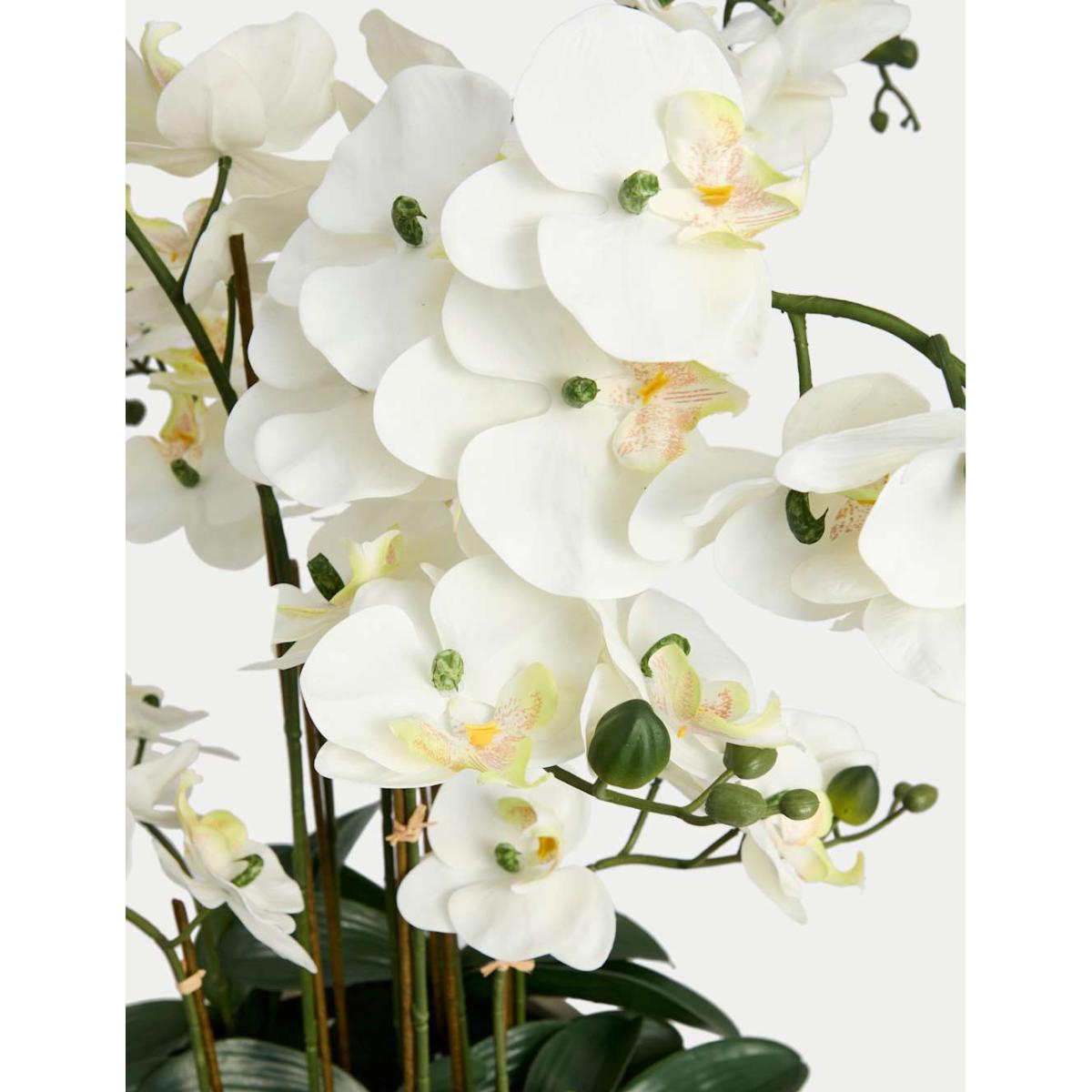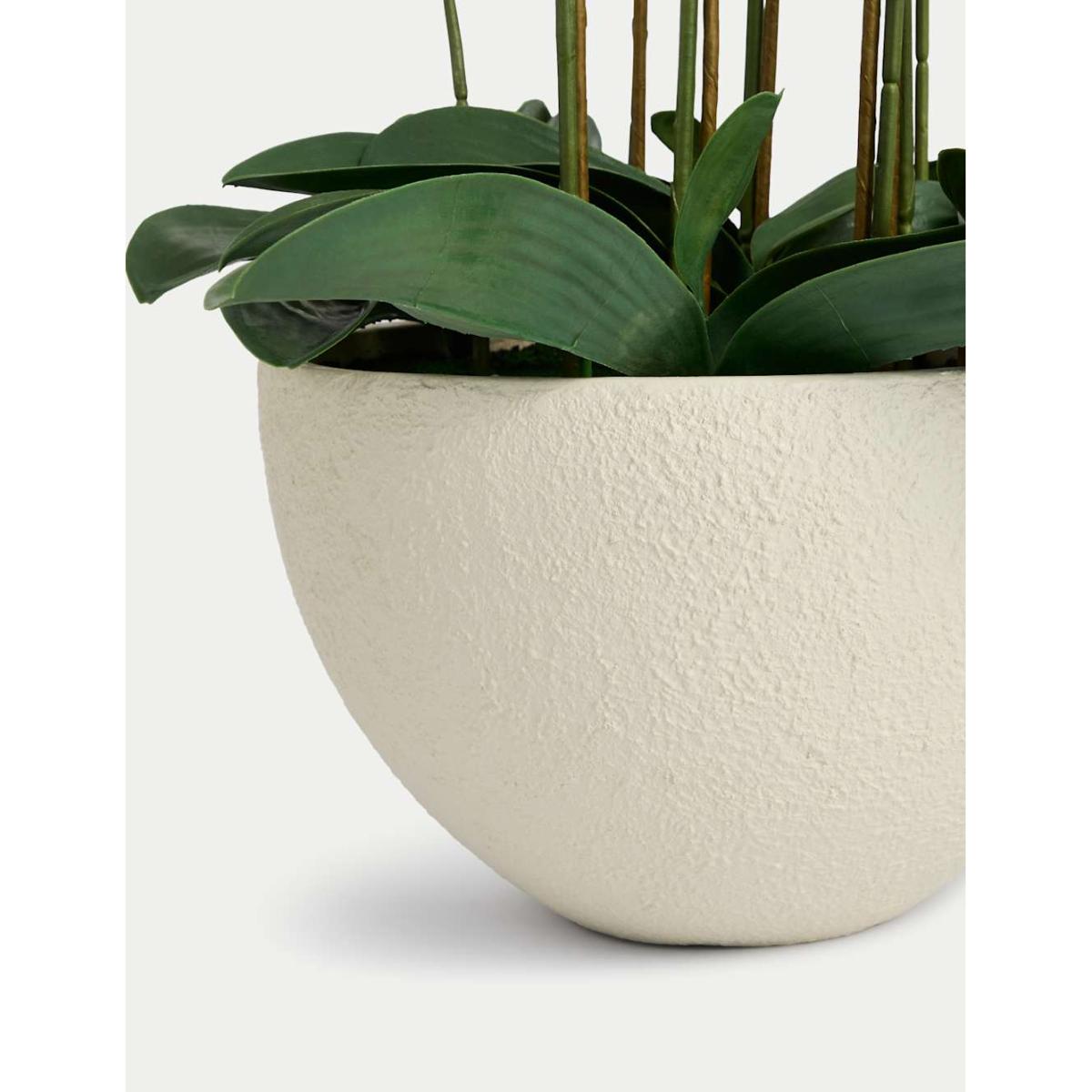 Make a statement with this extra-large artificial orchid. This impressive arrangement features multiple lifelike orchid stems rising from an elegant, rounded ceramic pot with a subtly textured surface.