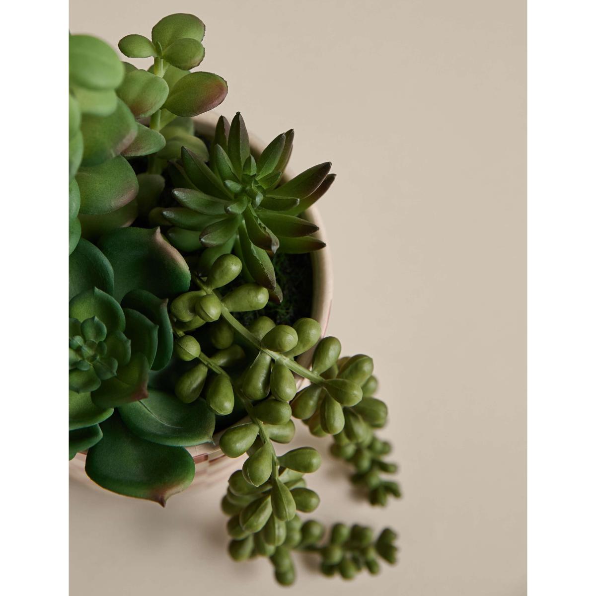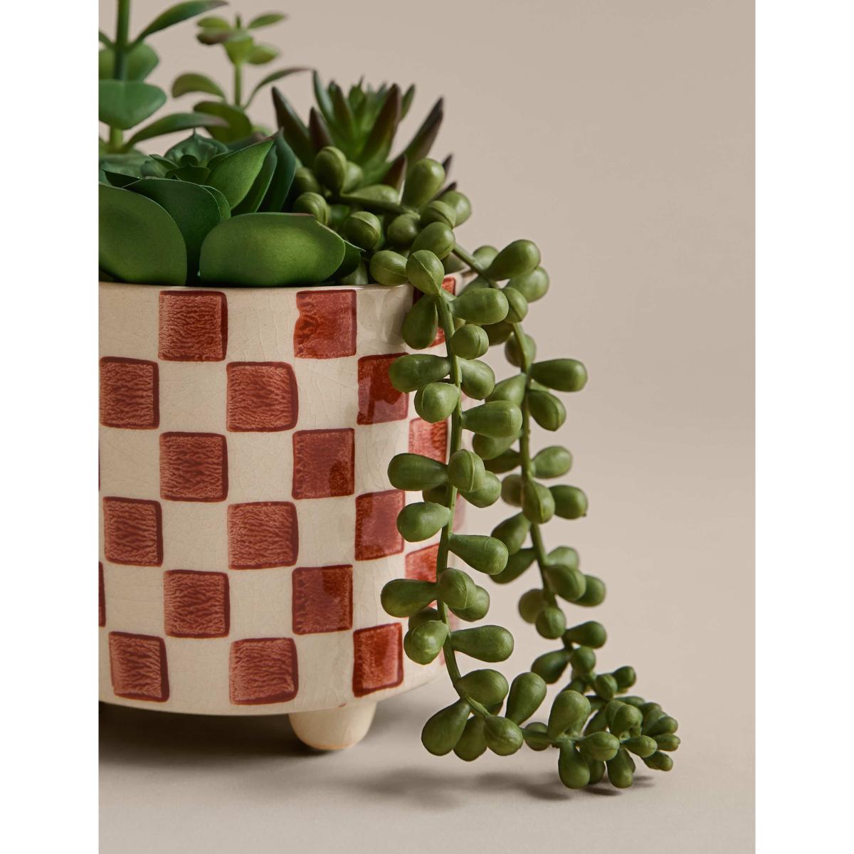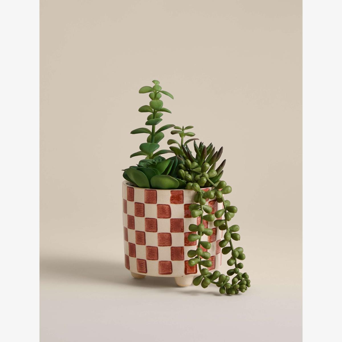 This family of artificial succulents is great for decorating your desk or mantlepiece. It includes a mix of faux plants with an authentic look, all displayed in a stylish ceramic pot with an eye-catching checked pattern.
