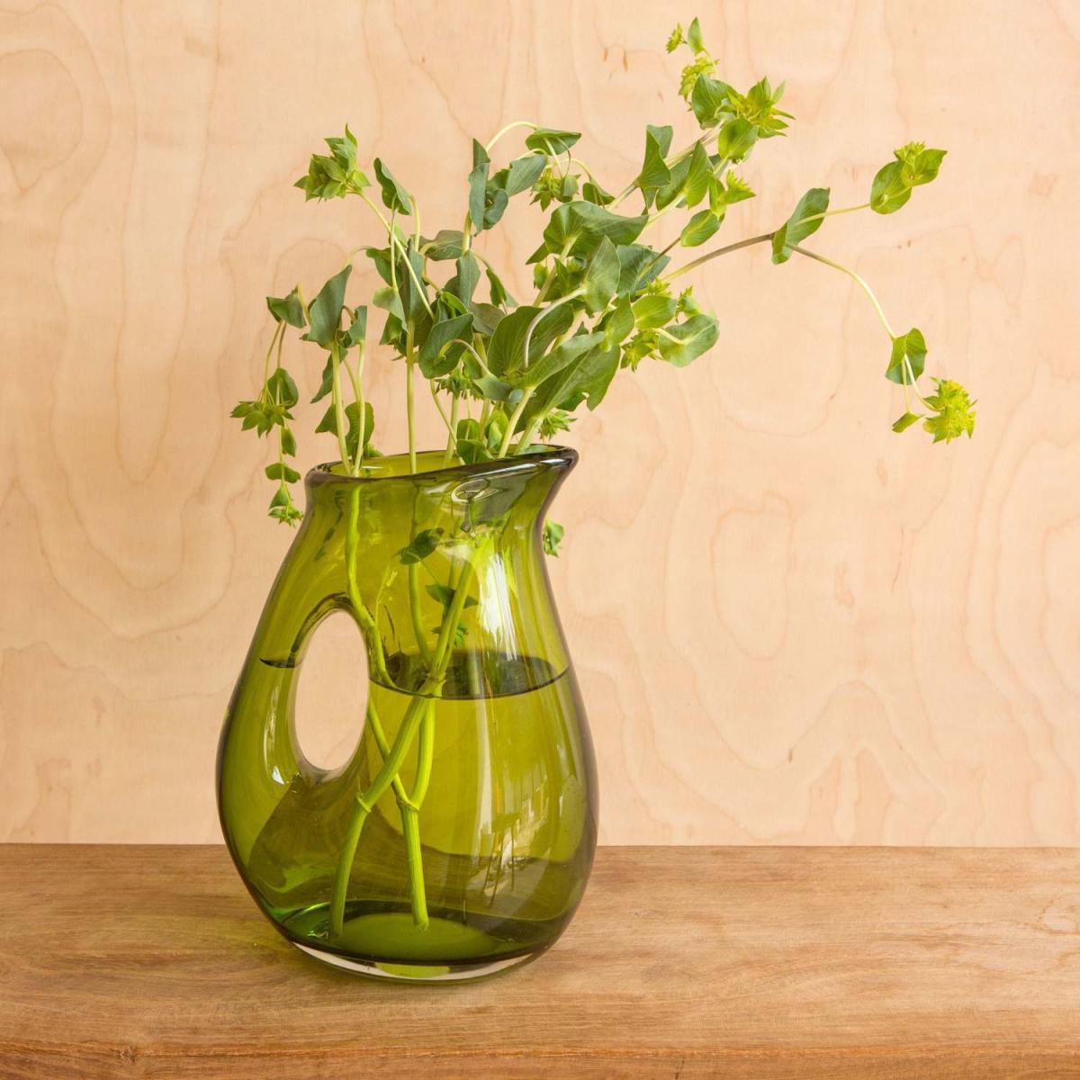 Made from coloured glass, our moss green jug will add contemporary flair to any table. Featuring a hole in the centre by way of a handle, this piece stands alone as a striking, yet practical centrepiece. Use to serve cold drinks at your dining table, or as a bold alternative to a vase, filled with your favourite blooms.