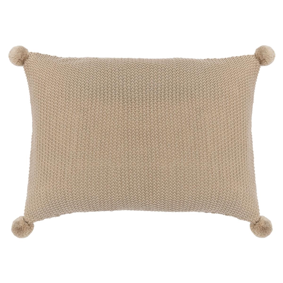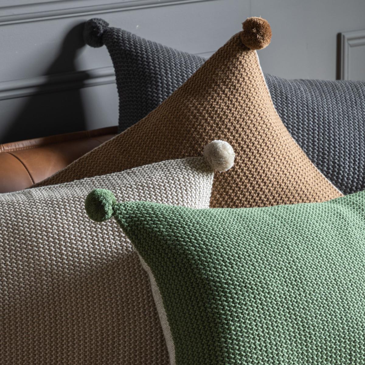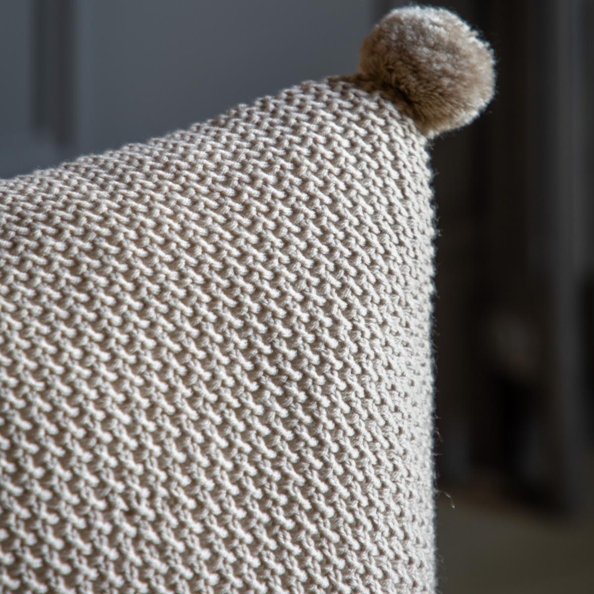 Tactile moss stitched polyester filled cushion in natural tone finished off with 4 fluffy pom poms. Coordinating throw available. Colour - Natural Material - 100% Acrylic Technique - Knitted Fabric Weight - 450 gsm Size - 60cm x 40cm All screens vary in colour reproduction and whilst every effort has been made to display the colour as accurately as possible it is for guidance only.