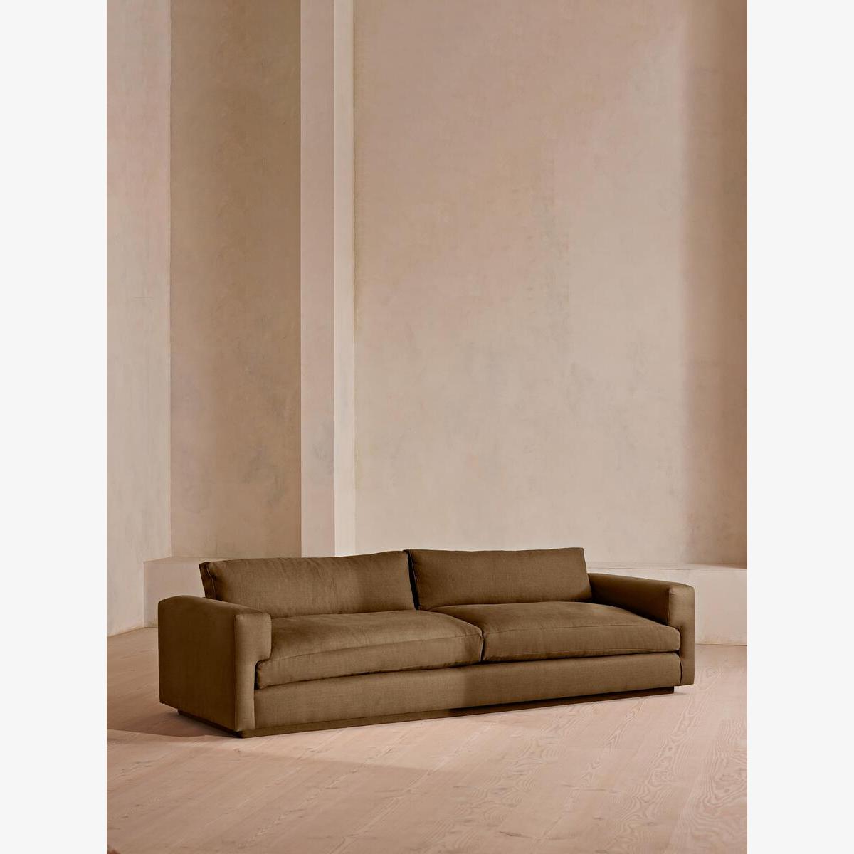 I love the Mossley four-seater sofa for its simple yet substantial design that works well in both modern and more traditional interiors. Its linen fabric in ochre adds warmth and a touch of colour without overwhelming the space, making it versatile for various colour palettes. This sofa is ideal for larger living rooms or open-plan spaces, where its scale can be appreciated. For styling, I recommend pairing it with textured cushions or throws in neutral or muted tones to add layers. Incorporating a rug underneath can ground the seating, while side tables and lighting can create an inviting, lived-in look. Overall, it's a practical choice that brings comfort and understated elegance to your space.