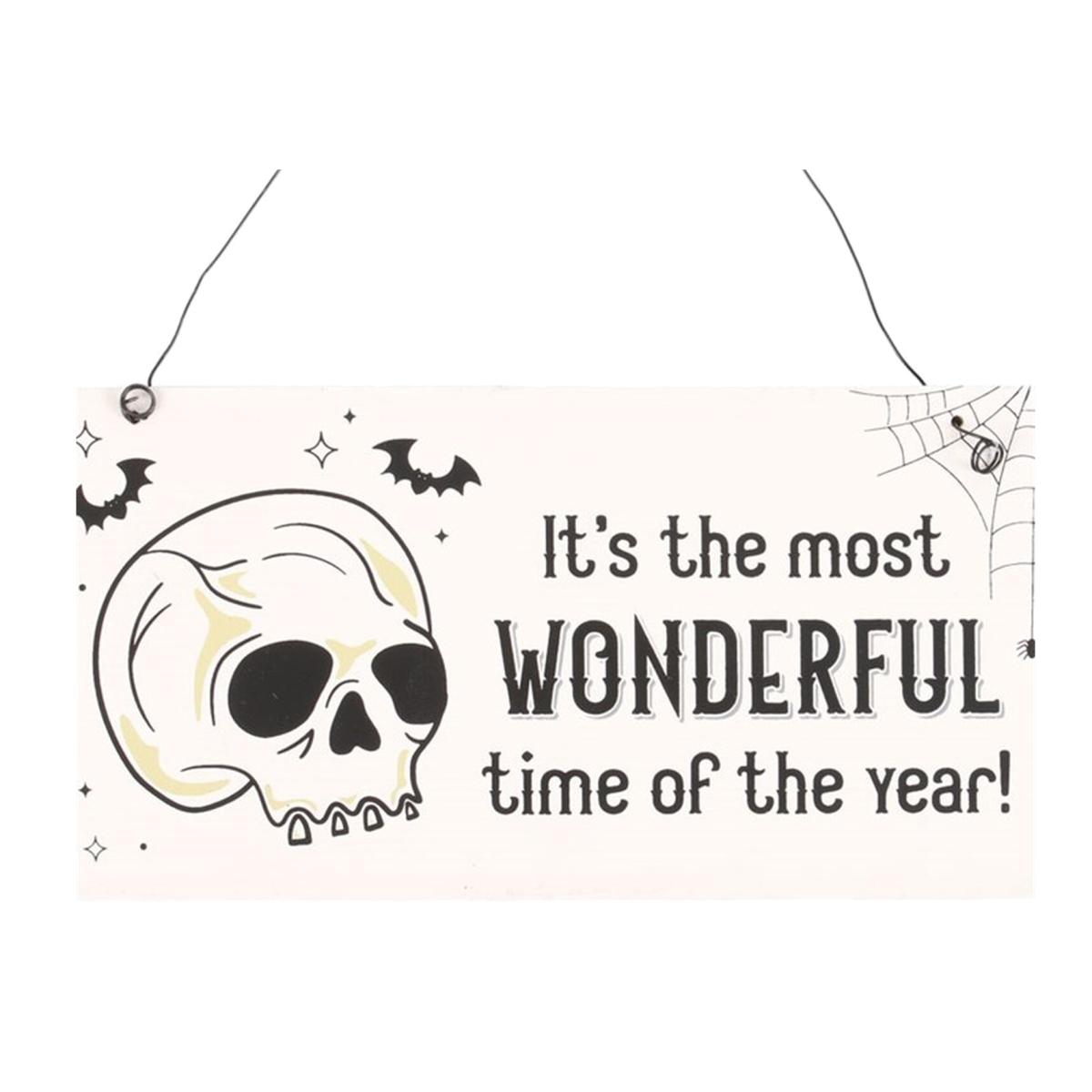 A must-have decoration for anyone who lives for Halloween, this sign features the wording 'The Most Wonderful Time of the Year' decorated with a skull and bat design.