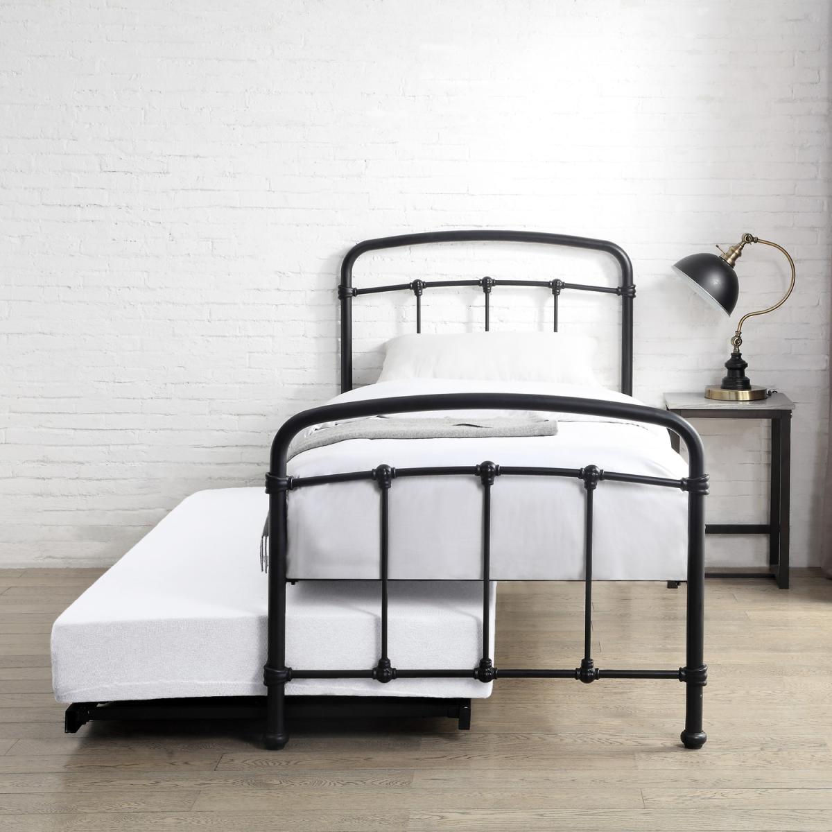 A beautiful traditional, Victorian style guest bed, featuring a curved headboard and matching footboard with metal detailing. The pull out trundle bed is a perfect solution for you guests and folds away neatly under the main bed when not in use. Maximum mattress depth for the trundle-20cm. Trundle dimensions:L-185.5cmW-91cmH-40cm. Main bed L-202.5cmW-99.5cm. Headboard H-115cm Footboard H-80cm Trundle weight capacity 120kg
