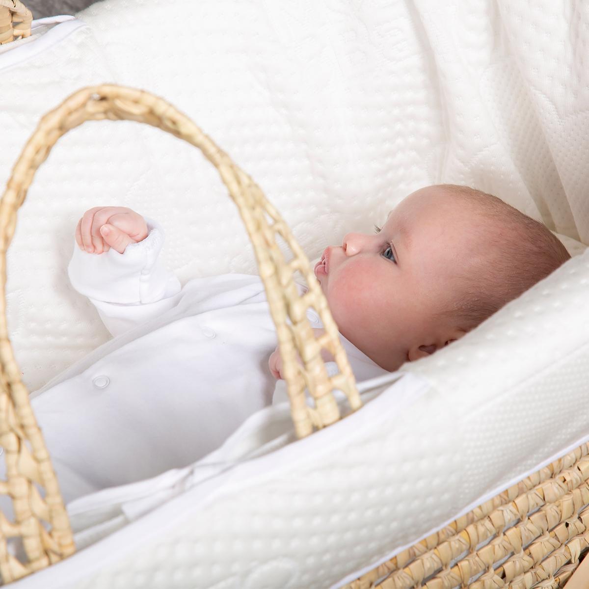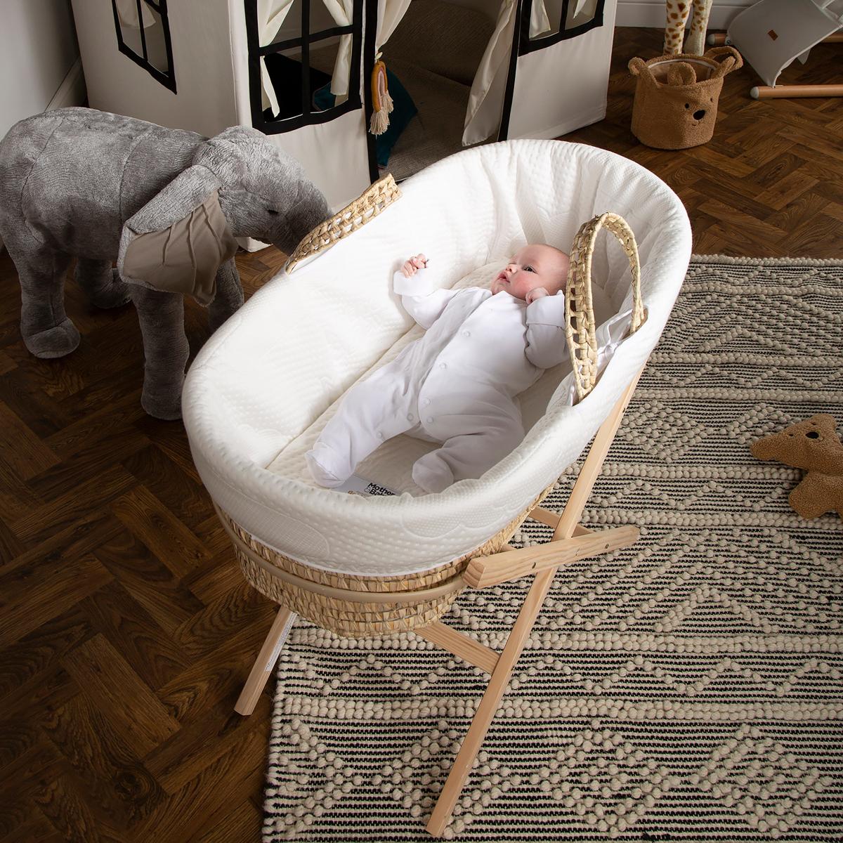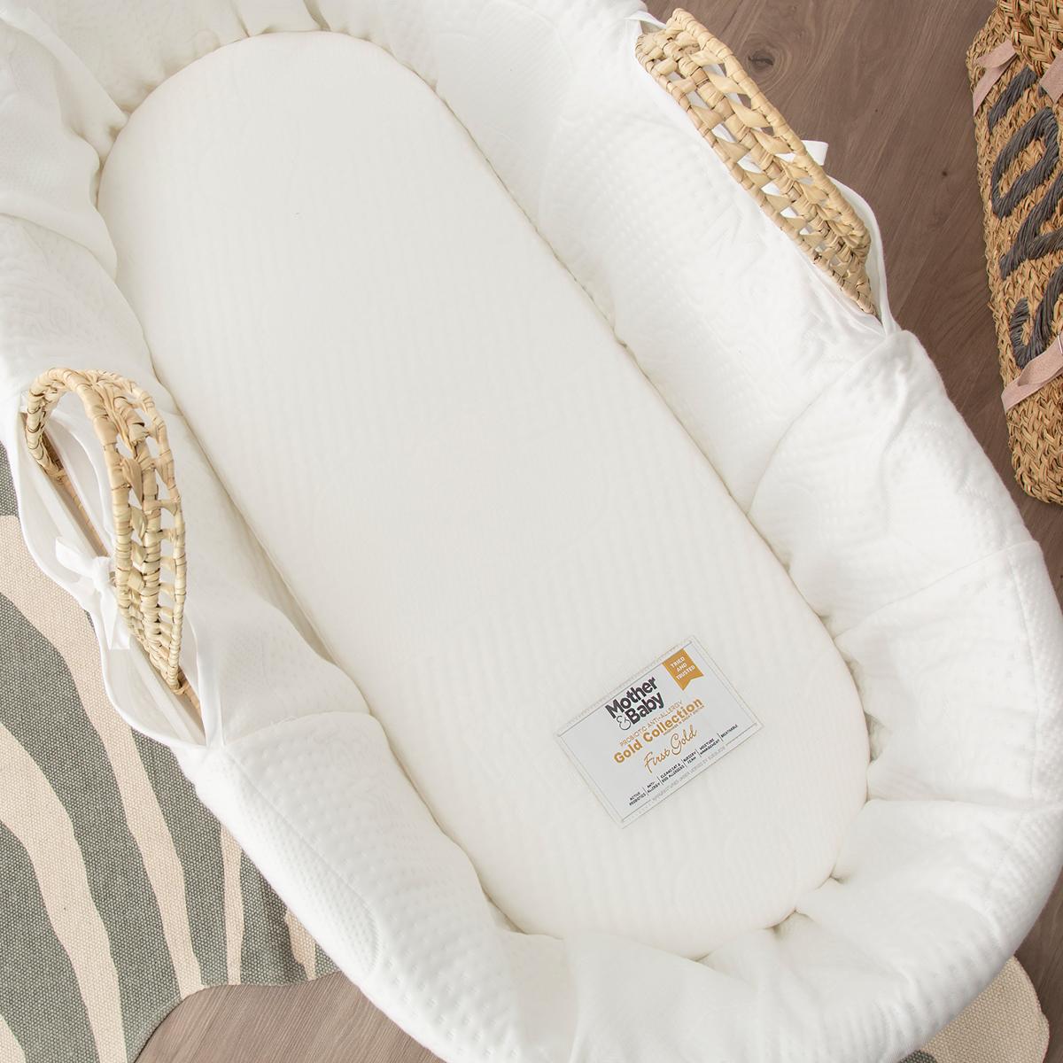 This exceptional piece features an innovative probiotic treatment on the mattress and dressing, taking the traditional Moses basket to the 21st century. The Purotex probiotics are built into the fibres of the fabric, and they're activated by your baby's movement and heat. These probiotics work tirelessly to protect the sleep environment by eliminating the proteins that commonly cause allergies, ensuring your little one sleeps soundly. Crafted from handwoven palm, the Moses Basket is lightweight and easy to move around the home. This fantastic piece comes complete with a Mother&Baby First Gold Moses Basket mattress, offering the ultimate in comfort and support for your baby.