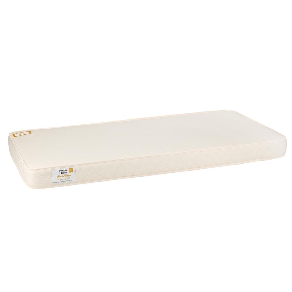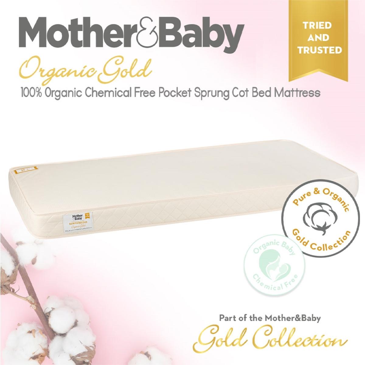Made from 100% organic materials and completely chemical-free, the Mother&Baby Organic Gold Chemical Free Cot Bed Mattress provides your little one with a safe, clean and comfortable space for snoozing! As only organic materials have been used, it's naturally breathable, temperature regulating and hypo-allergenic - protecting your baby from allergens. Beneath the herringbone cotton cover you'll find layers of natural latex, coconut coir and individual pocket springs that provide the perfect level of support and comfort as your baby grows. Dual-sided, turn the mattress to suit your babies development - the firmer coconut coir and wool combination better suits babies and the natural latex and wool adapts to toddlers as they move throughout the night. Designed and made with the utmost care, you can sleep soundly knowing your baby will be too!.