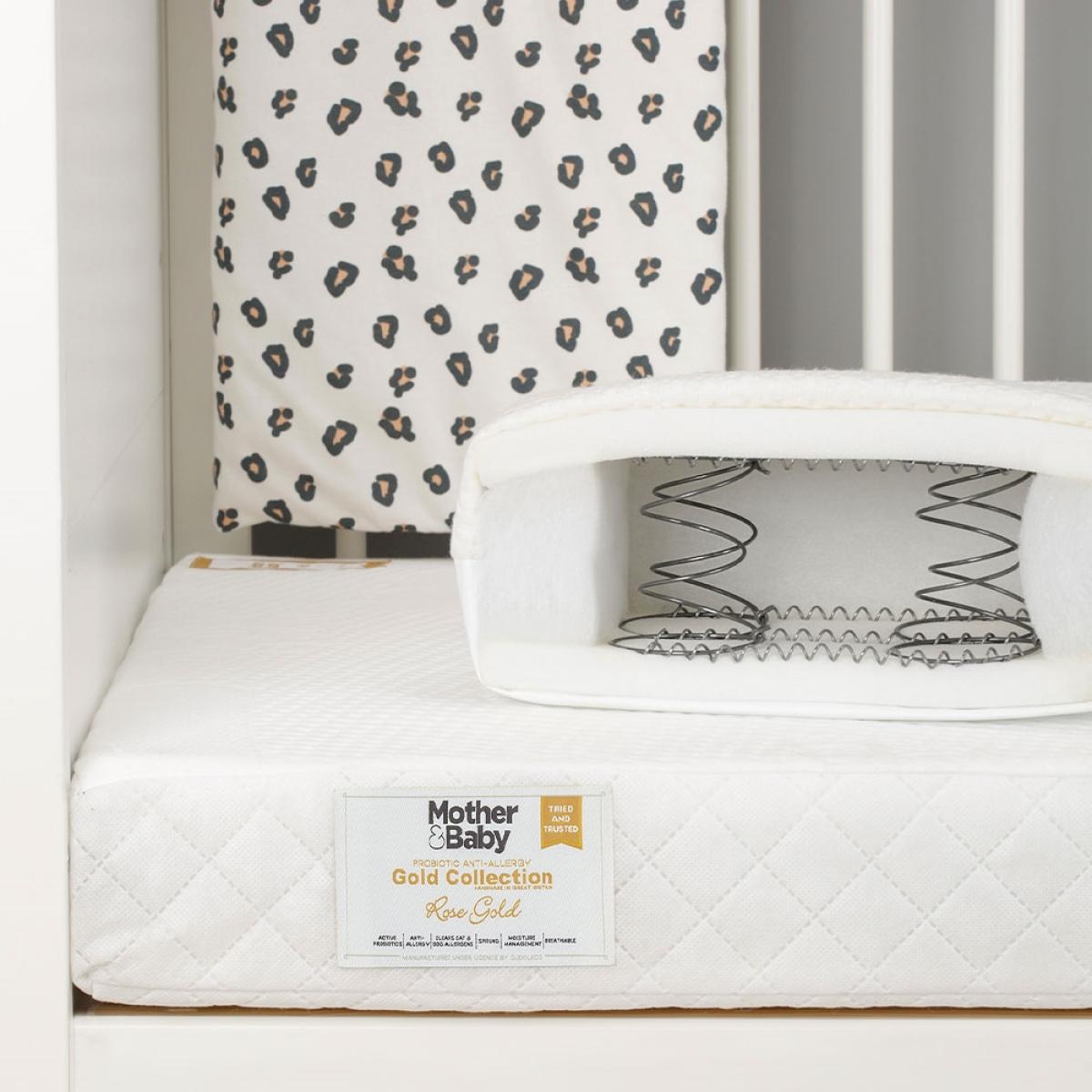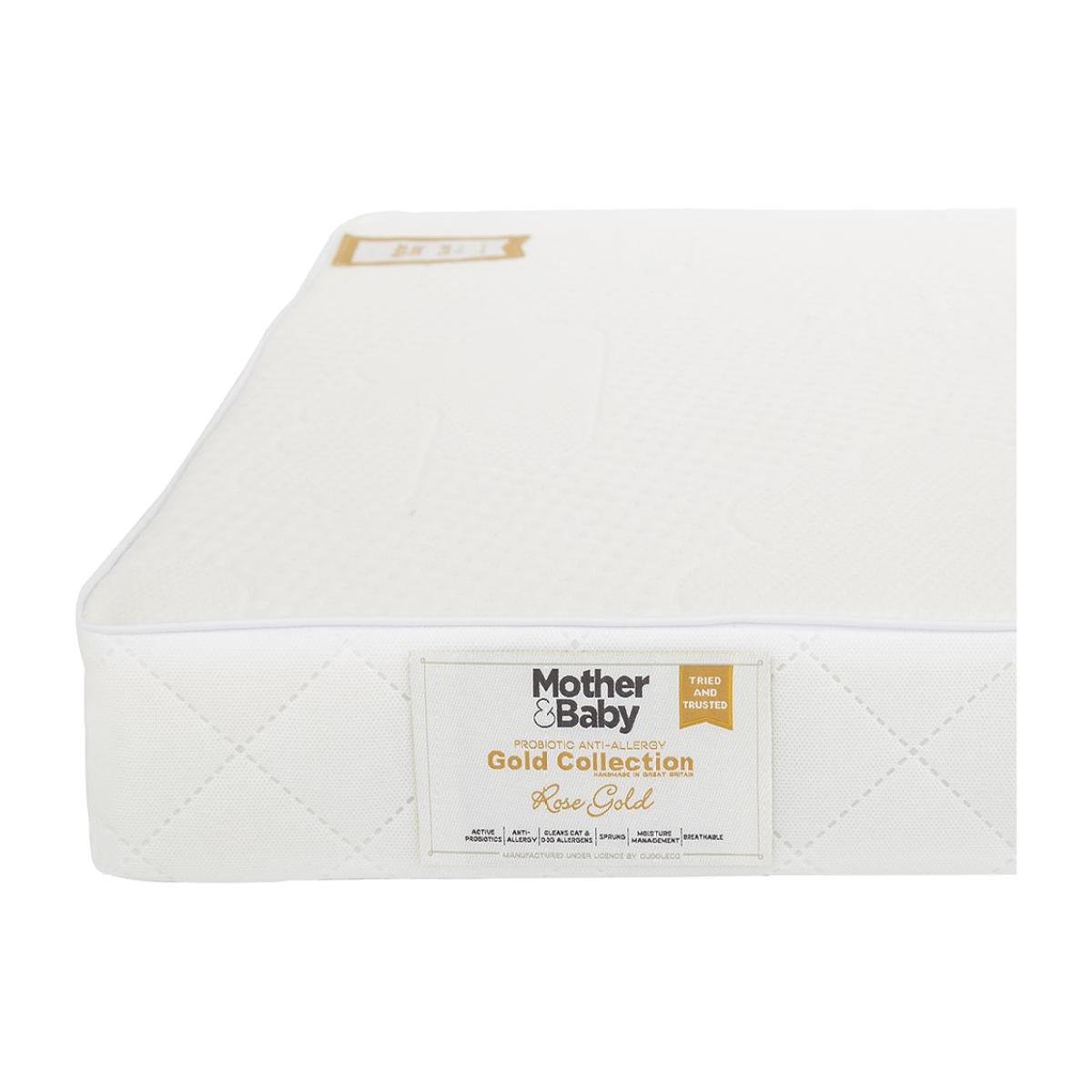 Dual-sided, the Mother&Baby Rose Gold Anti Allergy Sprung Cot Bed Mattress is perfect for babies and toddlers! From birth, the baby side features a firmer level of support to ensure they're safe while they snooze. When the baby side has been outgrown, to benefit from a slightly softer foam that will adapt to your little one as they move throughout the night, simply flip the mattress over! Made from only the best materials, each layer features natural, organic fibres that promote breathability, temperature control and provide protection against allergens. Between the mattresses foam and sprung layers, a completely waterproof membrane ensures the mattress is kept fresh and clean if there are any little accidents. Wrapped in a removable and machine washable cover, bacteria will be kept at bay! It's part of the Gold collection for a good reason!.