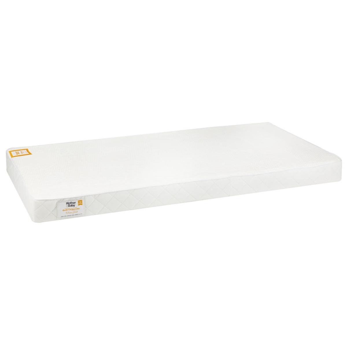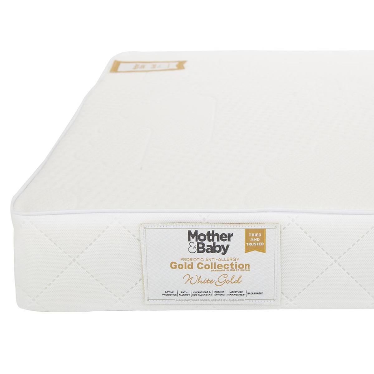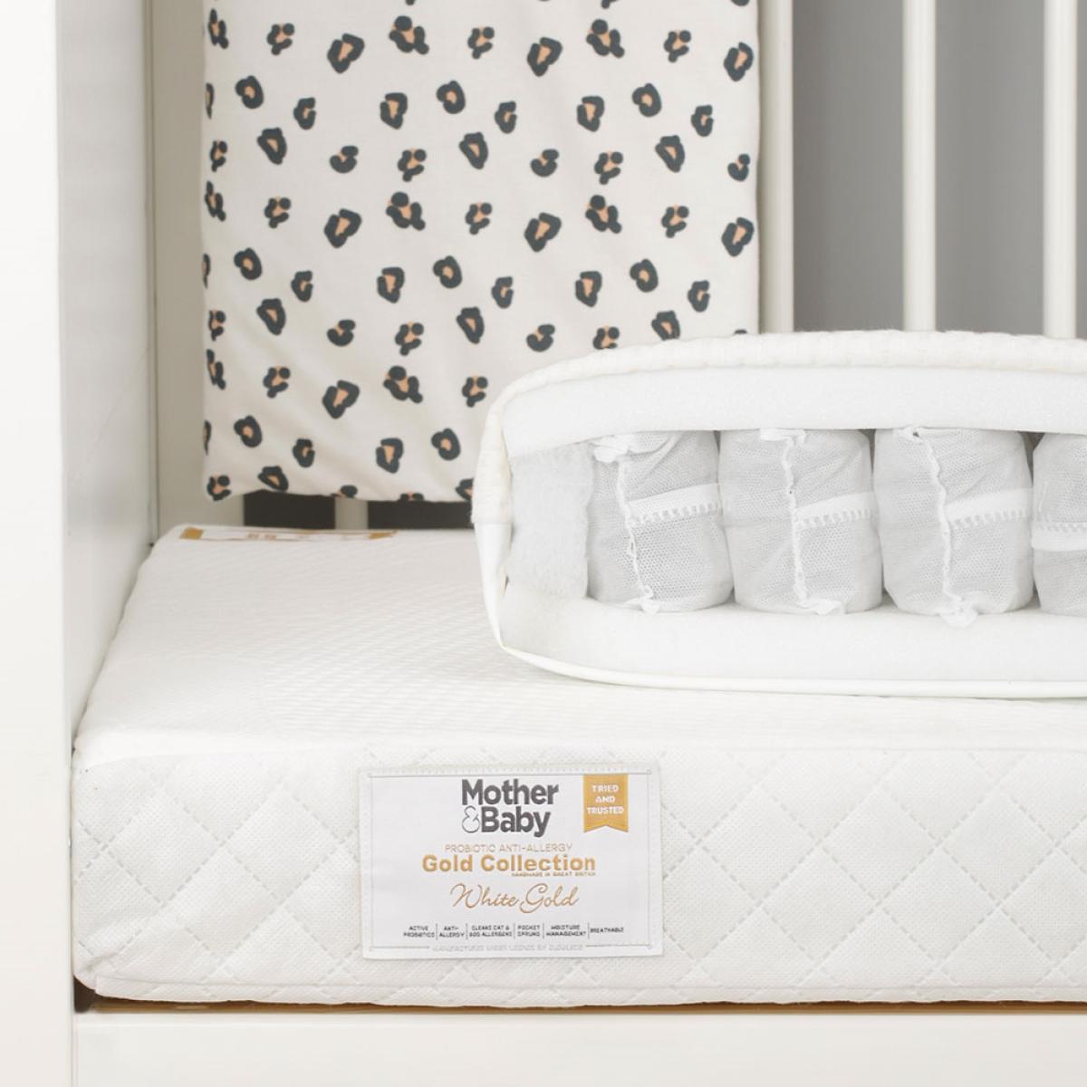 Adapt the Mother&Baby White Gold Anti Allergy Pocket Sprung Cot Mattress as your little one grows. The dual-sided mattress has been designed with a baby and toddler side. Surrounding supportive individual pocket springs, newborns benefit from the firmer foam layer, ensuring they're safe and sound while they sleep. When they've outgrown the baby stage, the slightly softer foam layer on the reverse adapts to your toddler's body as they move throughout the night. Made from only the best materials, each layer features natural, organic fibres that promote breathability, temperature control and eliminates household allergens. Keeping the mattress fresh and clean, the mattress includes a completely waterproof membrane to protect from little accidents and the removable and machine washable cover is a practical feature for babies and parents. Available in other sizes, select the White Gold Mattress to suit your needs.