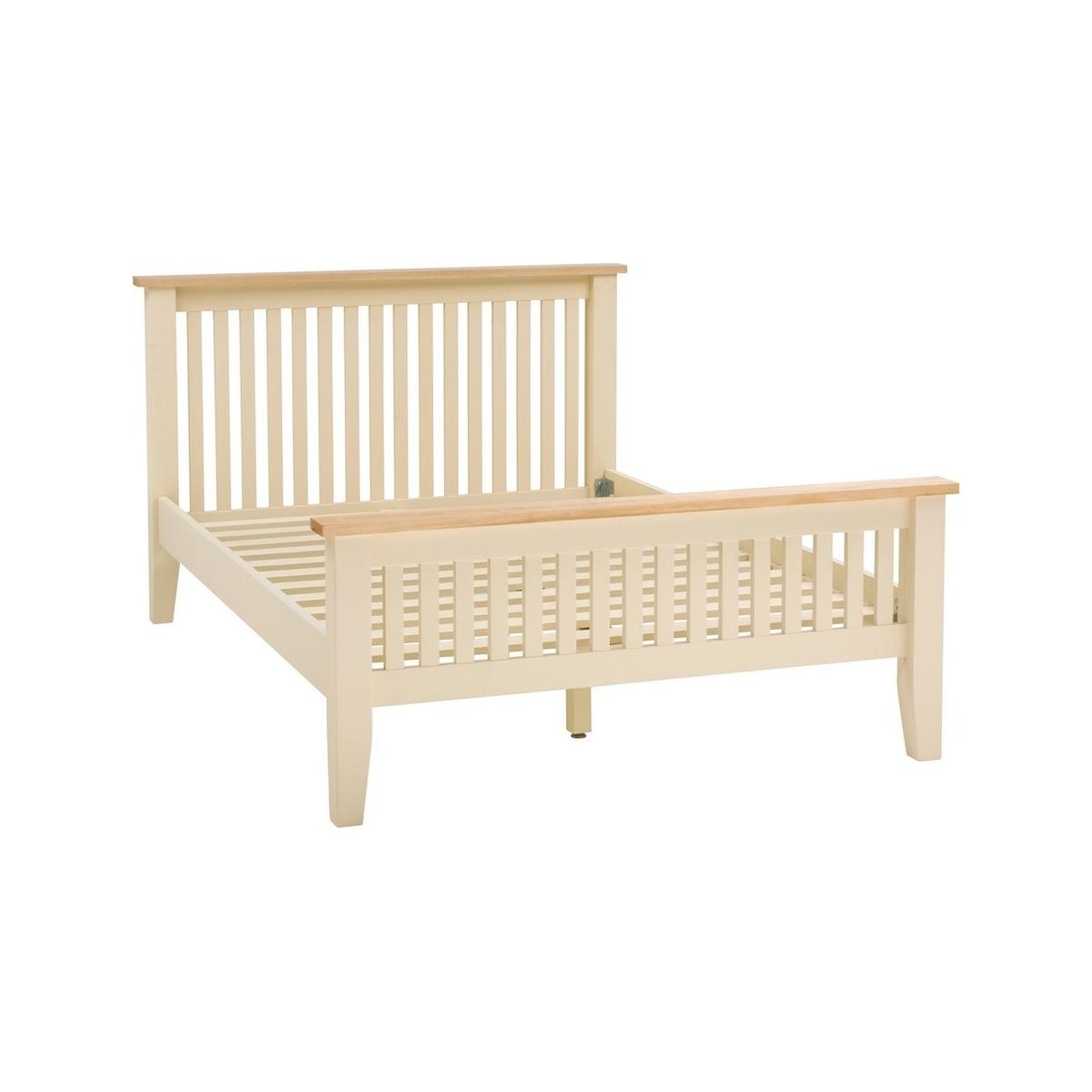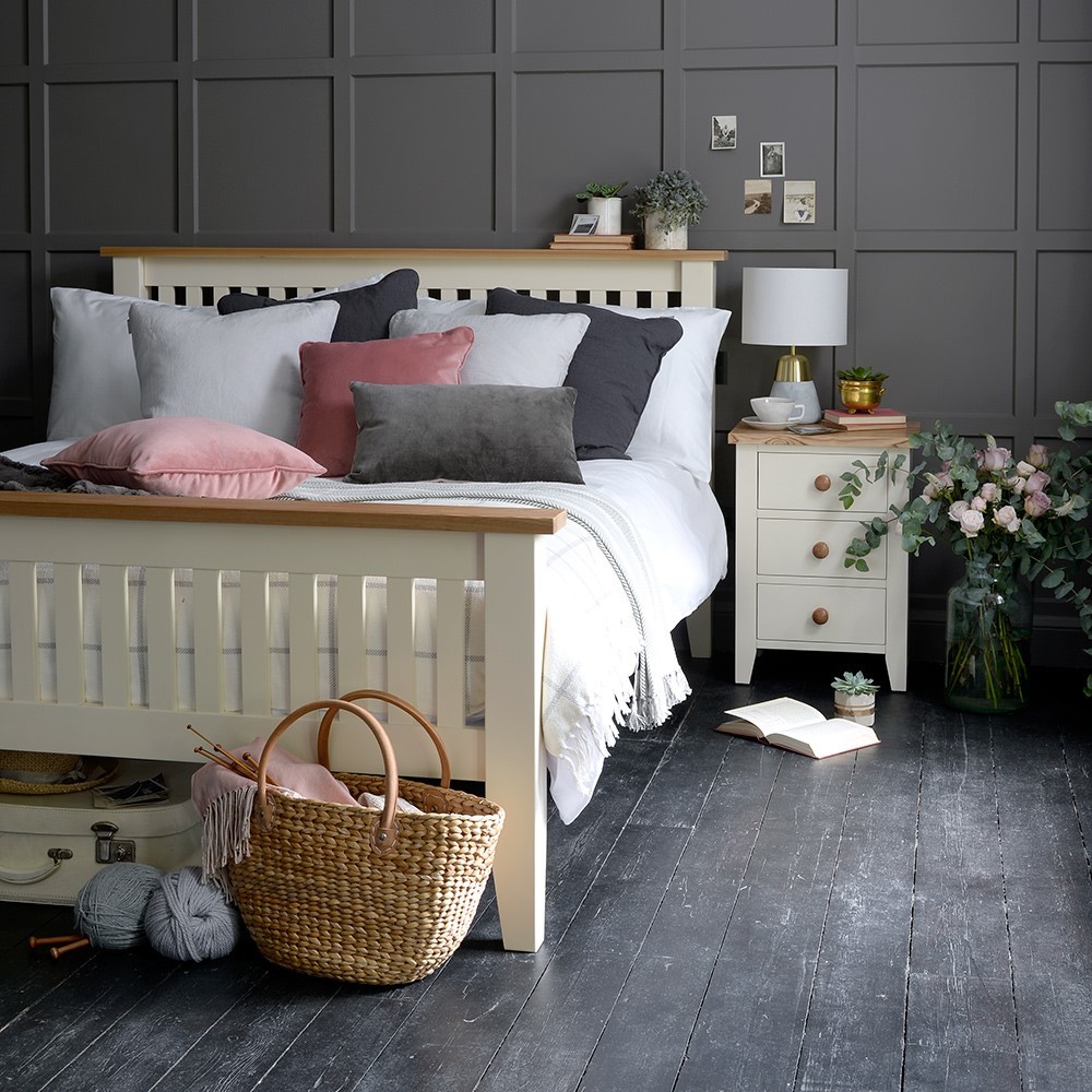 Charming, inviting, stylish;the Mottisfont Painted Double Bed is all those things and more. Elegantly blending country style with nods to modern design, this beautiful, solid pine bed is enhanced by the lacquered ash tops on the slatted headboard and footboard which contrast with the bed’s warm, vanilla cream tones perfectly. Combine it with other pieces from our Mottisfont range to transform your bedroom.