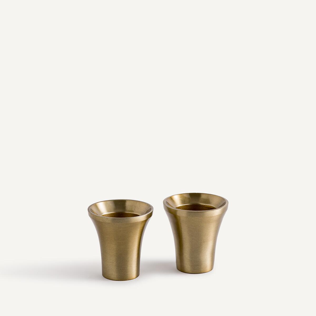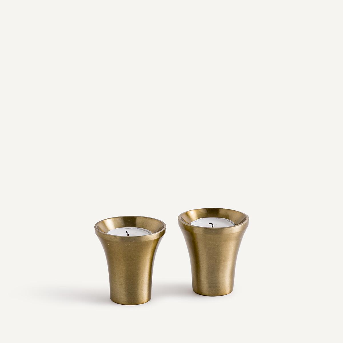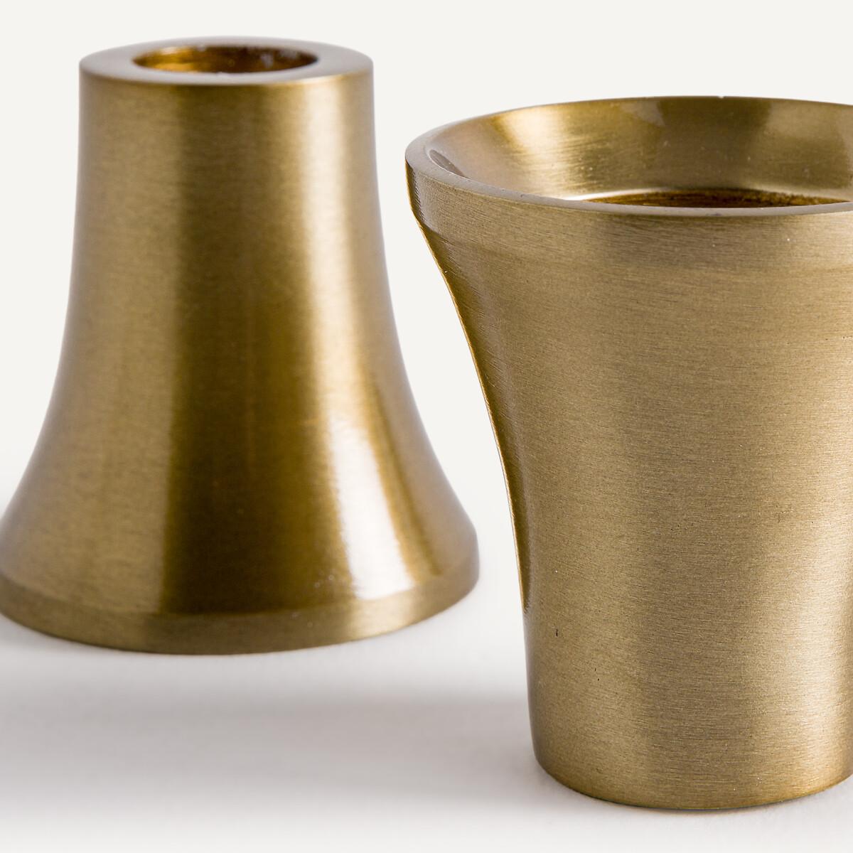 In brass-finish metal, the Mouro candleholders are timelessly elegant. Sold in pairs, they feature a flared silhouette, open at the top and towards the bottom. The simple, warm lines catch the light and soften it into golden reflections, adding a subtle festive touch to the table, a piece of furniture or the mantelpiece. A sober, refined style. Product Details • Brass-coloured aluminium • Set of 2 candleholders • For Ø2cm/Ø4cm candles, not suppliedDimensions. Dimensions of 1 candleholder • Diameter: 6.5cm/2.5" • Height: 7cm. Dimensions and weight of parcel1 parcel • W13 x H9 x D8cm, 0.44kg
