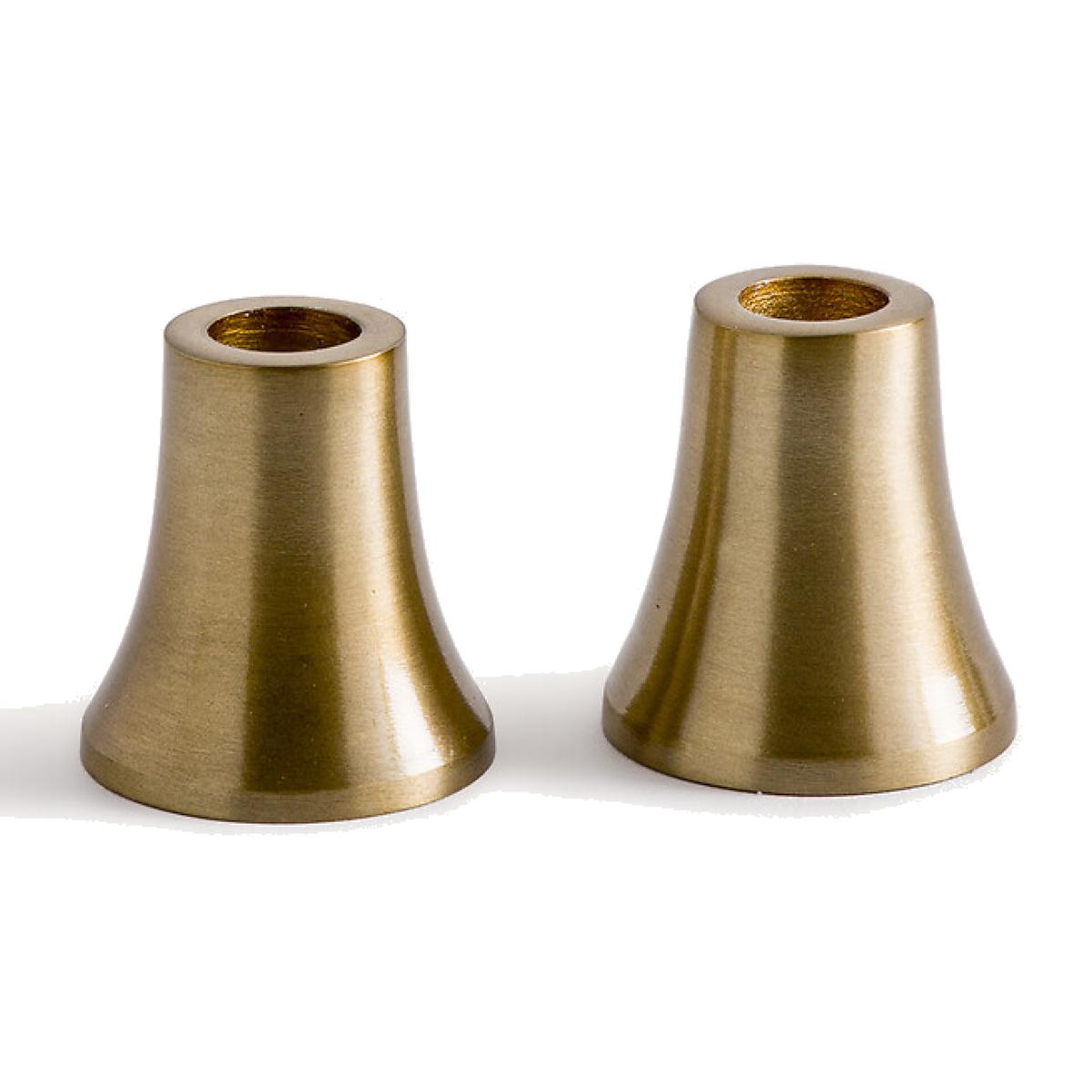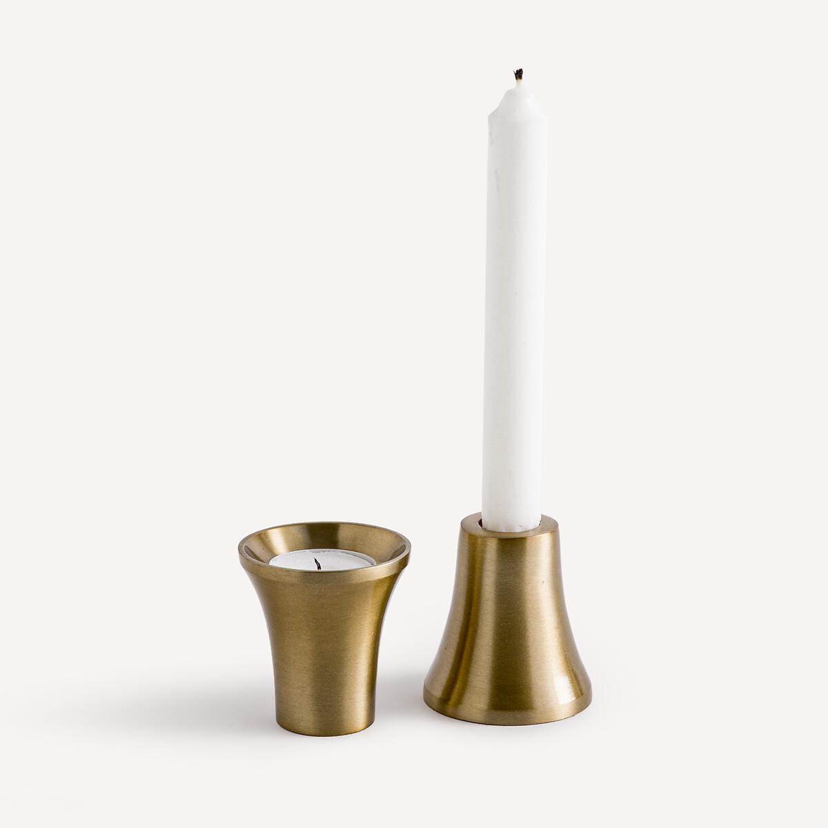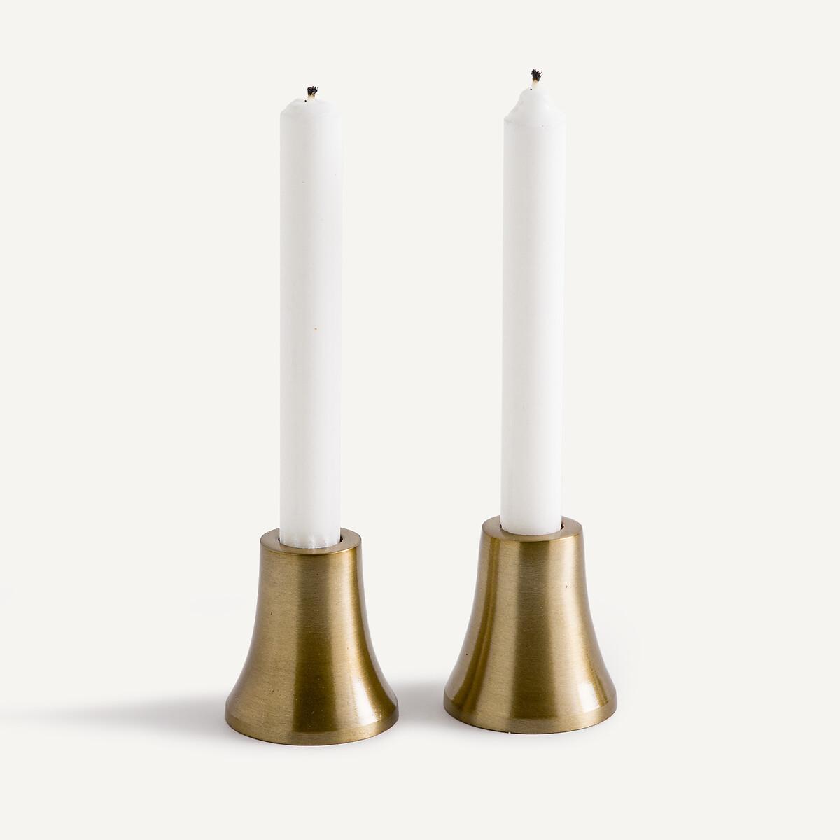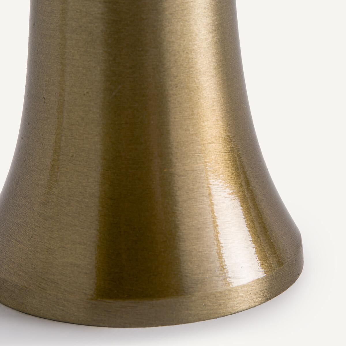 In brass-finish metal, the Mouro candleholders are timelessly elegant. Sold in pairs, they feature a flared silhouette, open at the top and towards the bottom. The simple, warm lines catch the light and soften it into golden reflections, adding a subtle festive touch to the table, a piece of furniture or the mantelpiece. A sober, refined style. Product Details • Brass-coloured aluminium • Set of 2 candleholders • For Ø2cm/Ø4cm candles, not suppliedDimensions. Dimensions of 1 candleholder • Diameter: 6.5cm/2.5" • Height: 7cm. Dimensions and weight of parcel1 parcel • W13 x H9 x D8cm, 0.44kg