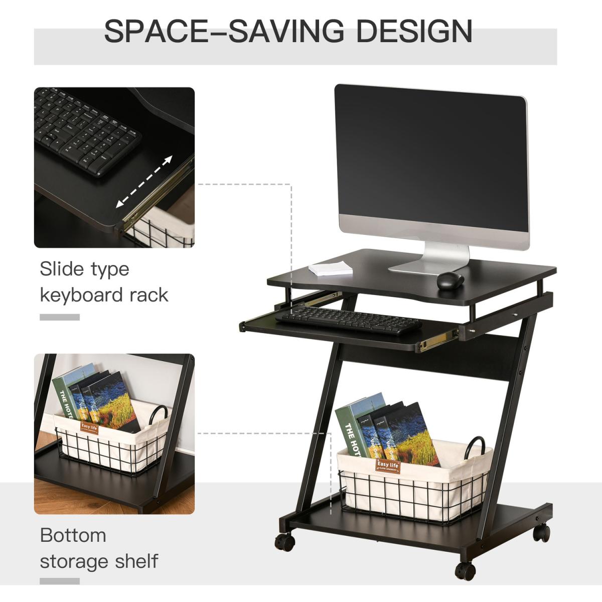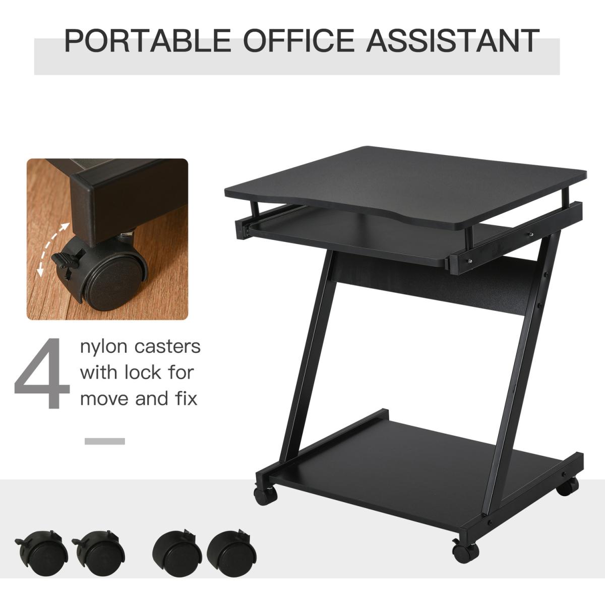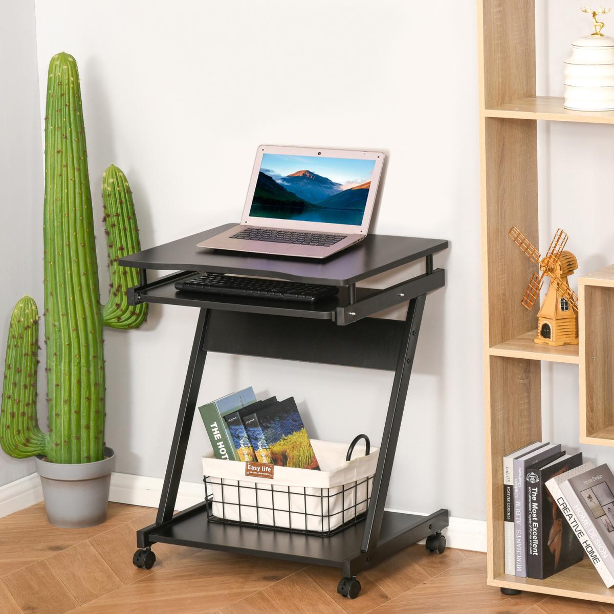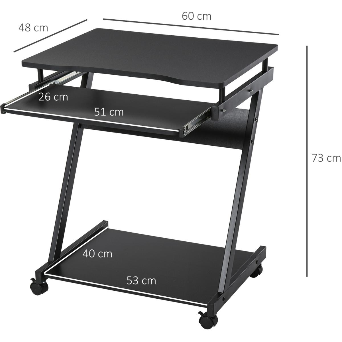 Keep your working times clean and clutter-free with this compact desk from HOMCOM. The frame is made from metal for a sturdy structure, crafted into a 'z' shape design which enables it to keep balanced and stable. It features an open tabletop, slide-out keyboard tray and bottom shelf, giving you plenty of room for working and handy storage space. Four locking wheels are placed on the bottom, making it easy to move around and keep stationary too. A modern piece perfect for all home and office spaces.