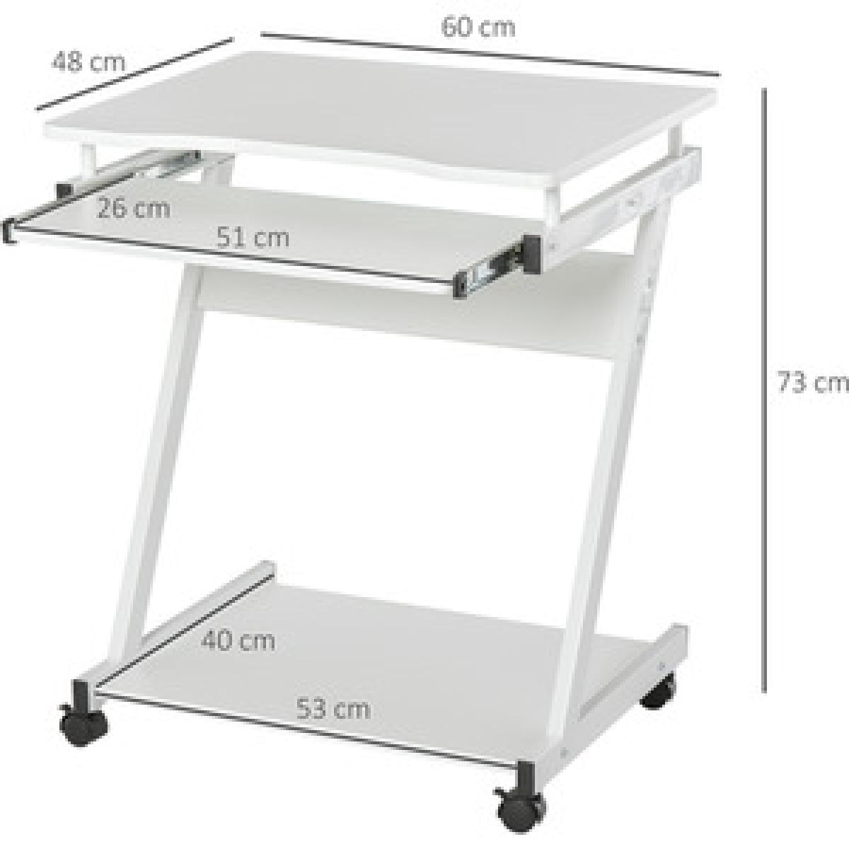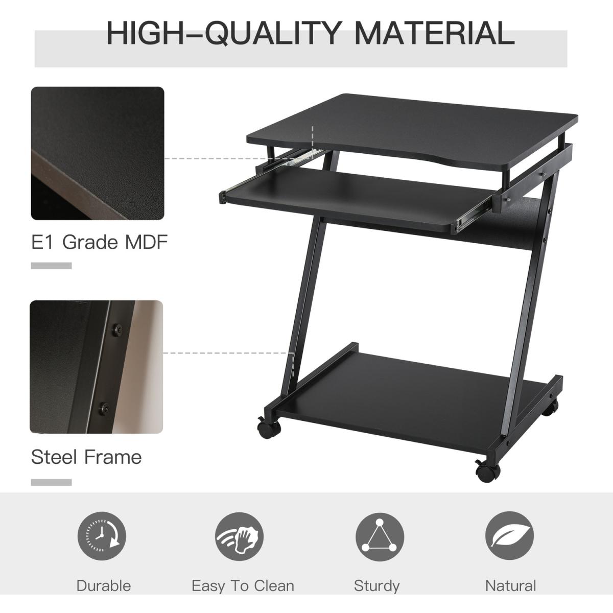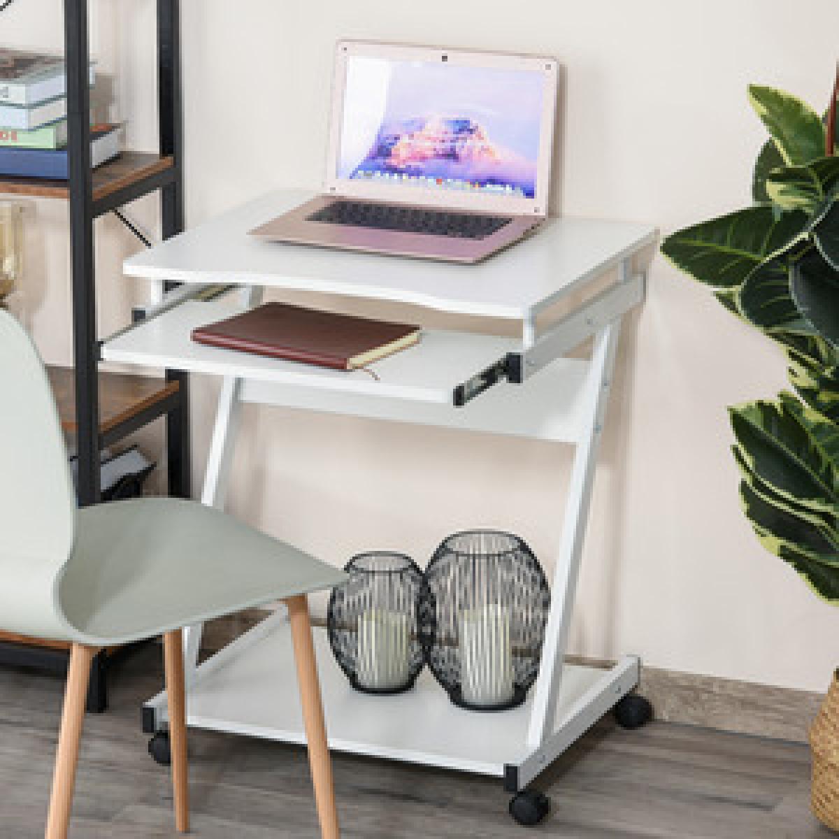 Keep your working times clean and clutter-free with this compact desk from HOMCOM. The frame is made from metal for a sturdy structure, crafted into a 'z' shape design which enables it to keep balanced and stable. It features an open tabletop, slide-out keyboard tray and bottom shelf, giving you plenty of room for working and handy storage space. Four locking wheels are placed on the bottom, making it easy to move around and keep stationary too. A modern piece perfect for all home and office spaces.