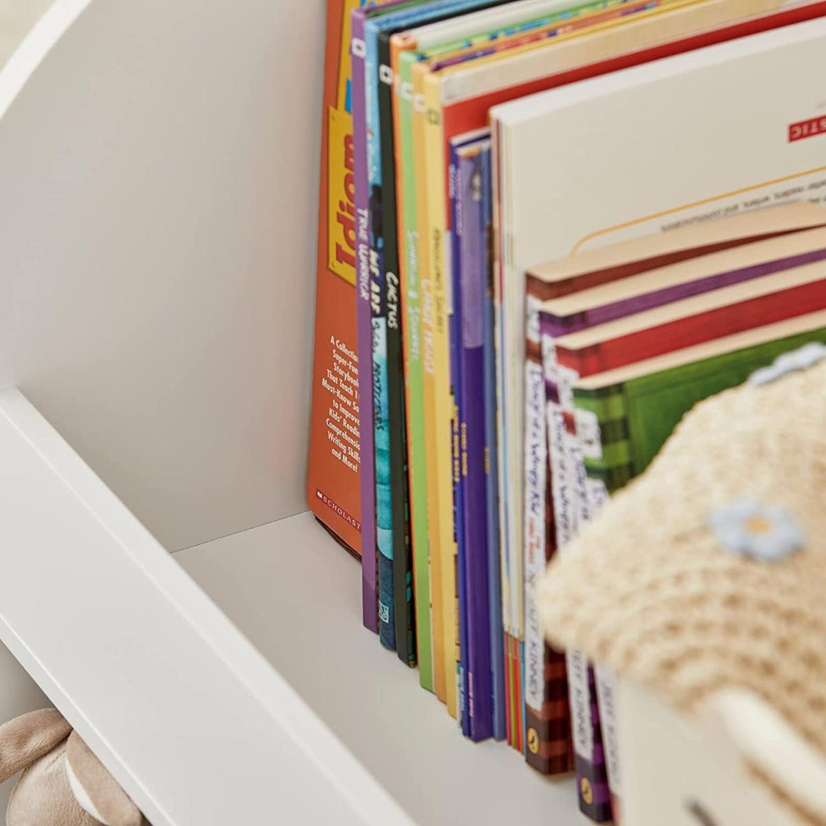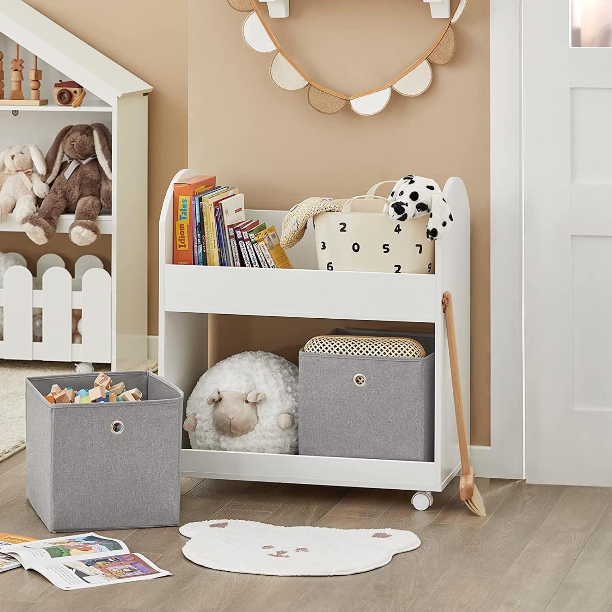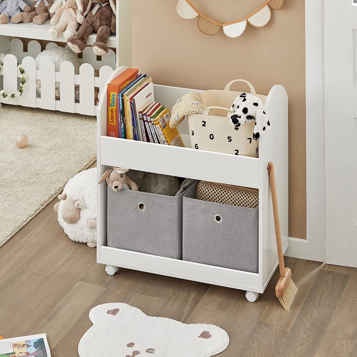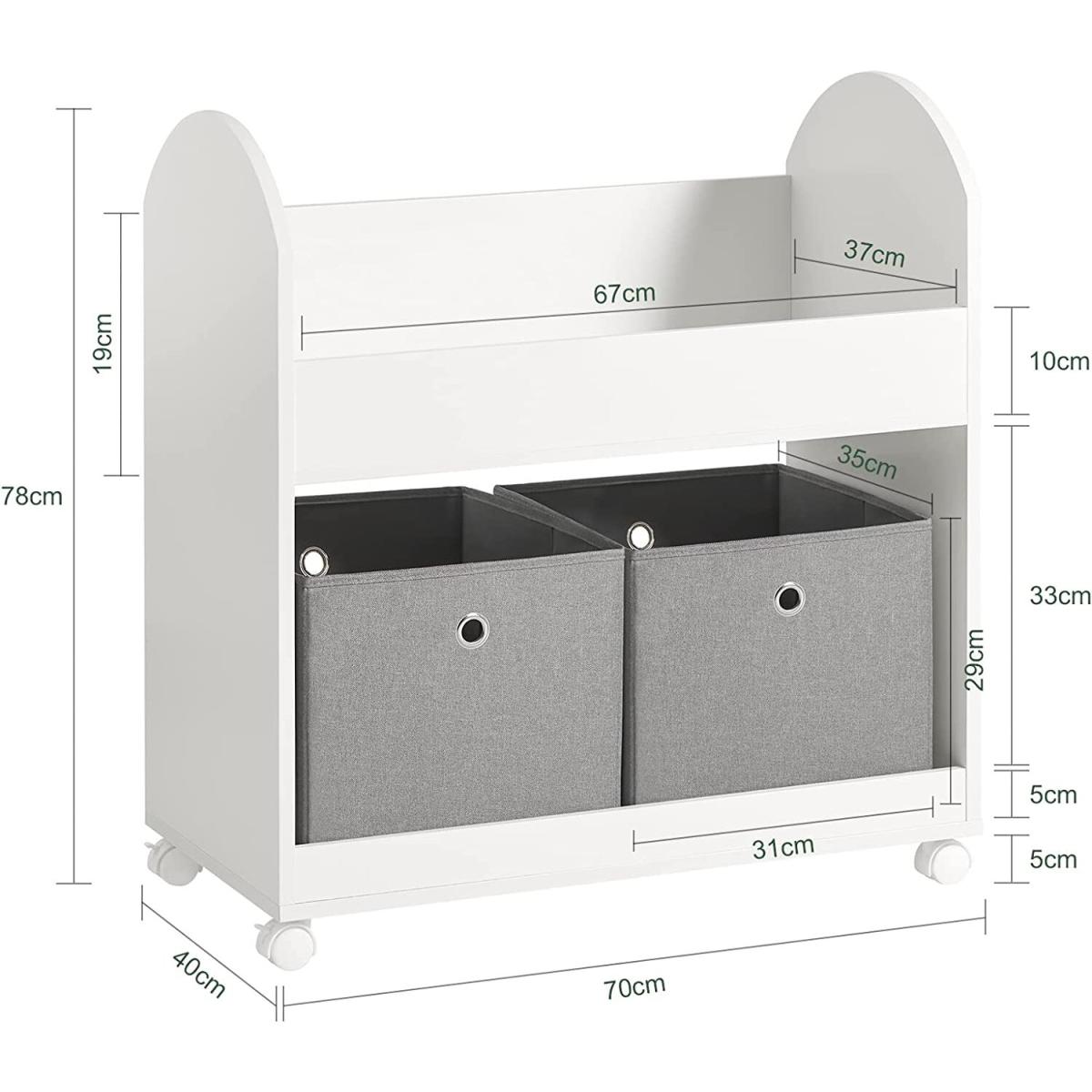 Modern design storage shelf is perfect for childrens room and living room. The open compartment offers plenty of space for the books and toys.2 fabric drawers can be pulled out completely as a great storage solution. Made of high quality MDF in white lacquer.2 drawers are made of non-woven fabric in grey. Stable and durable. With 4 wheels (2 with brakes), you can move the shelf around your home easily. Suitable for children ages 3 and up, promotes organisation and reading skills. This shelf will keep your room nicely organized as well as distinctive. Modern design shelf, it will blend perfectly with any home decor.