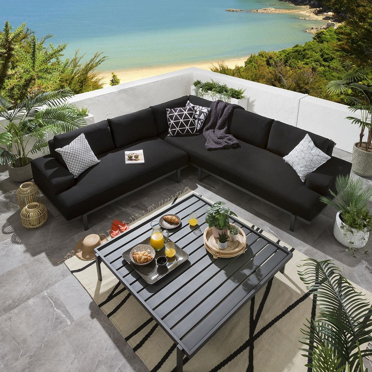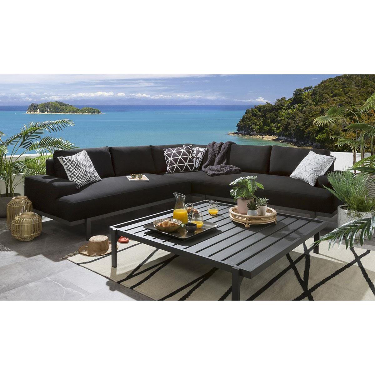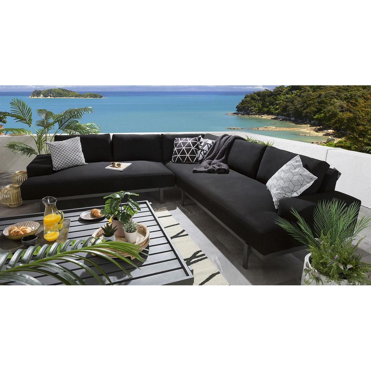 The MOY Premium Sunbrella Garden Sofa Set by Quatropi is a 5 seater outdoor sofa with a coffee table. This sofa offers unique options for anyone aspiring to have a contemporary garden. The sofa features metal legs that express a modern edge and raise the sofa to an extremely comfortable height. The sofa arms blend modern open-ended designs with traditional arms - especially designed to open up the sofa, whilst providing something to lean on, and on balance, creating a sofa that everyone will love. Relax and enjoy the great outdoors from the comfort of the MOY premium garden corner sofa set by Quatropi. There's nothing quite like spending quality time in your own garden, so it's little wonder that this luxury garden sofa set is so popular. The premium Sunbrella garden collection by Quatropi is an inspiring range designed to make you feel at home in your garden with a substantial modern flair that encompasses everything we love about contemporary furniture, all designed and produced to exact standards. Quatropi Sunbrella outdoor furniture is crafted for life, made for all seasons, and built to last. Built on a strong grey aluminium frame, make the most of your outdoor space with a carefully selected a Quatropi aluminium garden furniture set. Perfect for even the most strenuous weather conditions, with specialist water and stain resistant Sunbrella fabric. Stylish and classic, aluminium is a leading choice for garden furniture and comes in many different styles, paints and stains. All of the sofa materials are expertly selected to ensure the sofa retains its plushness, including the sumptuously thick high-density foam base cushions and snug hollow-fibre wadding filled back cushions. The cushions are upholstered in a premium Sunbrella black fabric - part of the unique designer range of garden patio furniture exclusive to Quatropi. The fabric provides unmatched weather and UV resistance. The design on the table, including the top, ties in perfectly with the overall sofa set aesthetic. Ongoing maintenance of the furniture set and table is easy, the frame and cushions can easily be cleaned with warm soapy water. Welcome in the beautiful spring and summer months with a gorgeous premium garden set - the quintessential option for relaxing with family and friends. This sofa offers a spacious and comfortable option for your back garden or outdoor space. Spread the cost our with interest-free finance options. Minimum spend applies. W261cm D260cm H68cm Sunbrella Outdoor Fabric Premium Outdoor Fabric