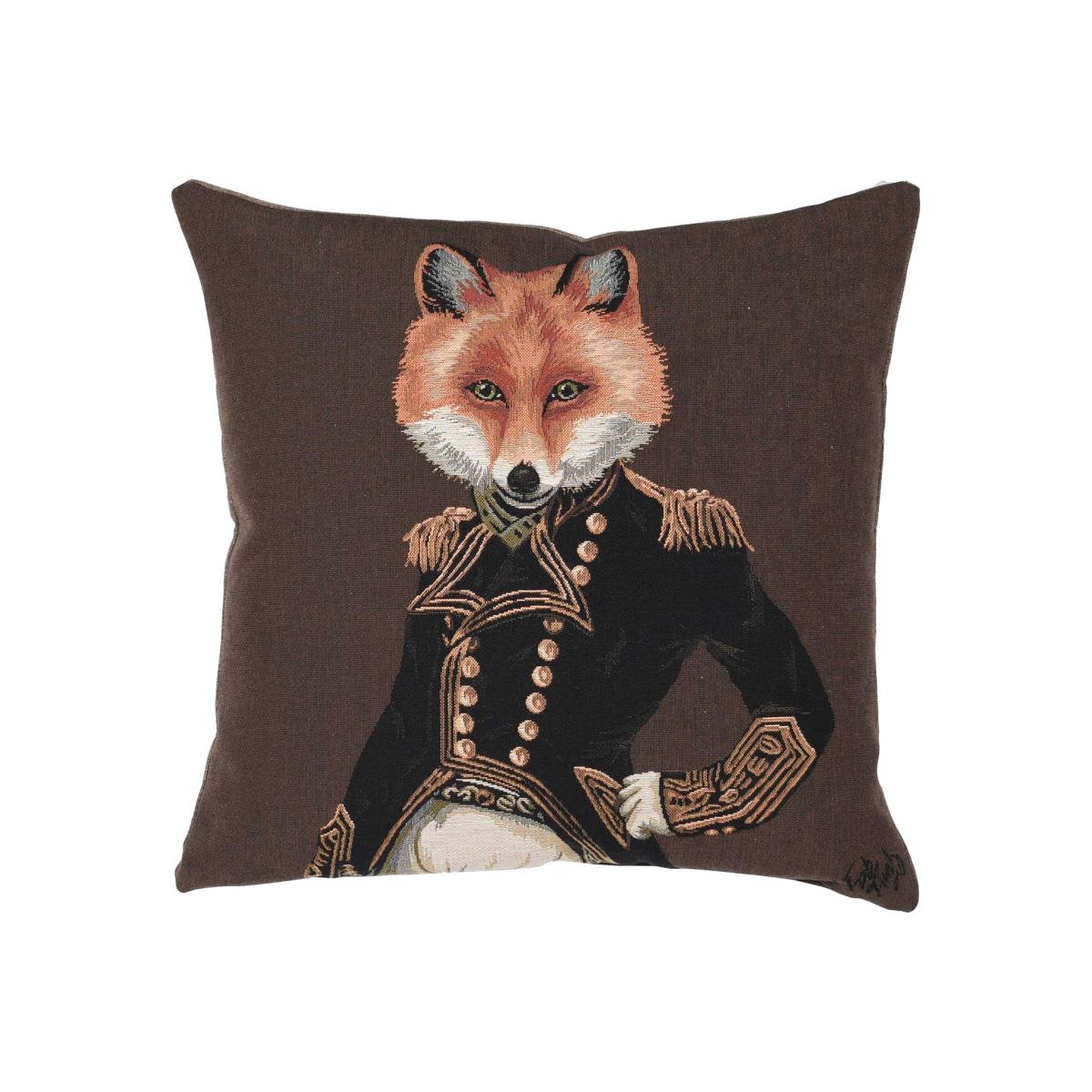 Design. With its luxurious feather filling and eye-catching design, the Mr Fox cushion delivers in more ways than one. A plain brown background allows the highly detailed image to stand out, in bold orange, black and gold hues. Impeccably dressed and undeniably charming, this gentlemanly creature will give welcome character to neutral spaces and bare upholstery.