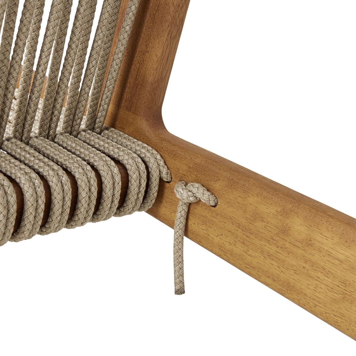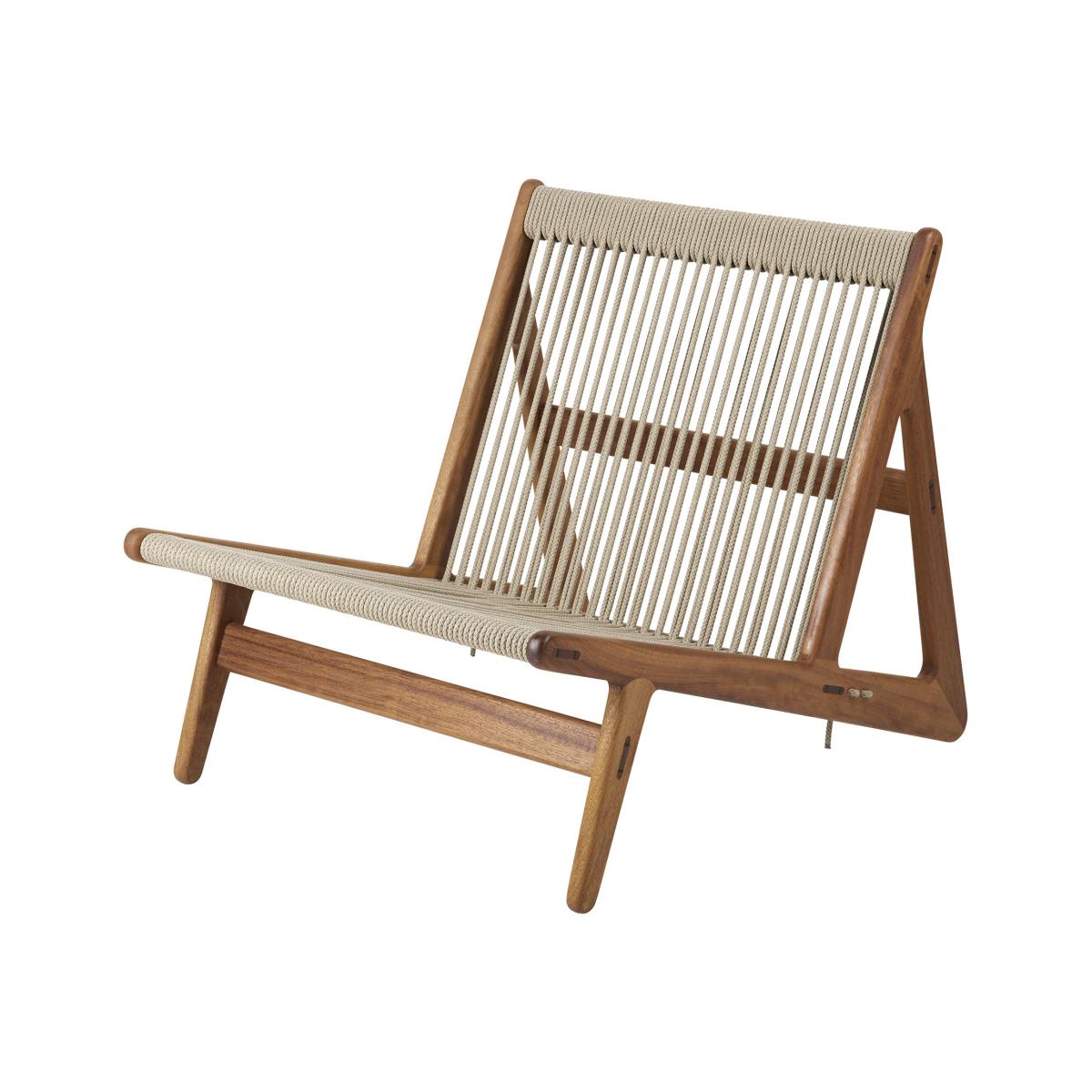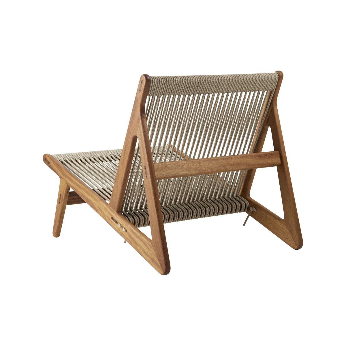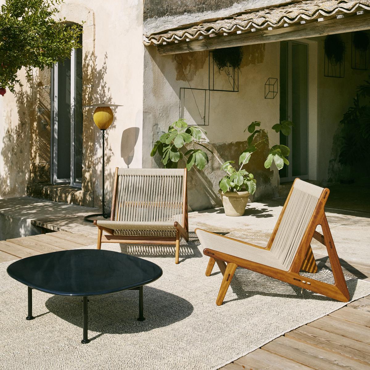 Combining Iroko wood and polyester cord, this OUTDOOR version of the MR01 Initial lounge chair is specially designed for outdoor use. Iroko is a naturally hard, oil-rich wood that’s very durable and resilient and is frequently used for boat decks and outdoor decking. The beauty of iroko lies in its wide spectrum of colours - from a light brown similar to oak to a much darker shade, closer to teak. Over time, iroko wood gains a beautiful patina, taking on a coppery tone. The high-performance polyester cord is waterproof, UV- and mildew-resistant, making the chair perfect for the poolside. The cord has a deformation-resistant core. It can also be replaced or rewoven, if that proves necessary over time. Originally, the young Danish designer and cabinetmaker, Mathias Rasmussen, designed this low armchair for his own home. He wanted a lounge armchair that he could use to relax and meditate. Both familiar and yet remarkably modern, the MR01 Initial armchair combines traditional craftsmanship and originality in a simple and very understandable form. Jacob Gubi, Creative Director of GUBI: "In many ways, it appears you have already seen this chair, but it’s an evolving interpretation and a development of Danish furniture traditions". The MR01 Initial armchair combines a solid frame in FSC-certified oiled Iroko solid wood with a soft, comfortable seat made of polyester cord. The seat and backrest are hand-woven from 90 metres of cord, in accordance with a method developed specially by the designer himself to lock the cord in the frame. The addition of cord is characteristic of Rasmussen, who often combines organic materials that complement the wood, creating an aesthetic dialogue between the two. This openwork cord seat gives the armchair transparency and lightness, both literally and visually. The careful ergonomic design of the armchair allows for different seating positions: from crossed legs to legs extended forward, left or right. This piece of furniture is the result of Rasmussen's profound understanding of the characteristics and potential of wood. Just like the great Danish masters who came before him, Rasmussen thinks with his hands: to develop the MR01 Initial armchair, he drew and created a variety of sketches and prototypes. The open wooden frame with its triangular profile is built without a single screw, thanks to ancient cabinetmaking techniques. The seat sticks out at the back to form the legs and serve as a support to the backrest. Four of the five crossbars which make up the armchair are identical, which simplifies construction and reduces waste. The slight low tilt is designed to give the user the impression of floating, while still feeling connected to the ground, encouraging a contemplative, calm feeling. Mathias Rasmussen: "The MR01 Initial armchair comes from a simple construction, optimised for production and designed to last as long as the materials themselves allow. It’s an honest armchair in its construction, versatile and easy to understand. Because the cord gives the seat and backrest a certain transparency, the armchair is so light that it almost looks like its floating." This collaboration - the first between GUBI and Rasmussen - highlights GUBI's commitment to support budding creators and invest in craft skills that are both established and innovative, as well as its commitment to the start of what promises to be a long and fruitful partnership.